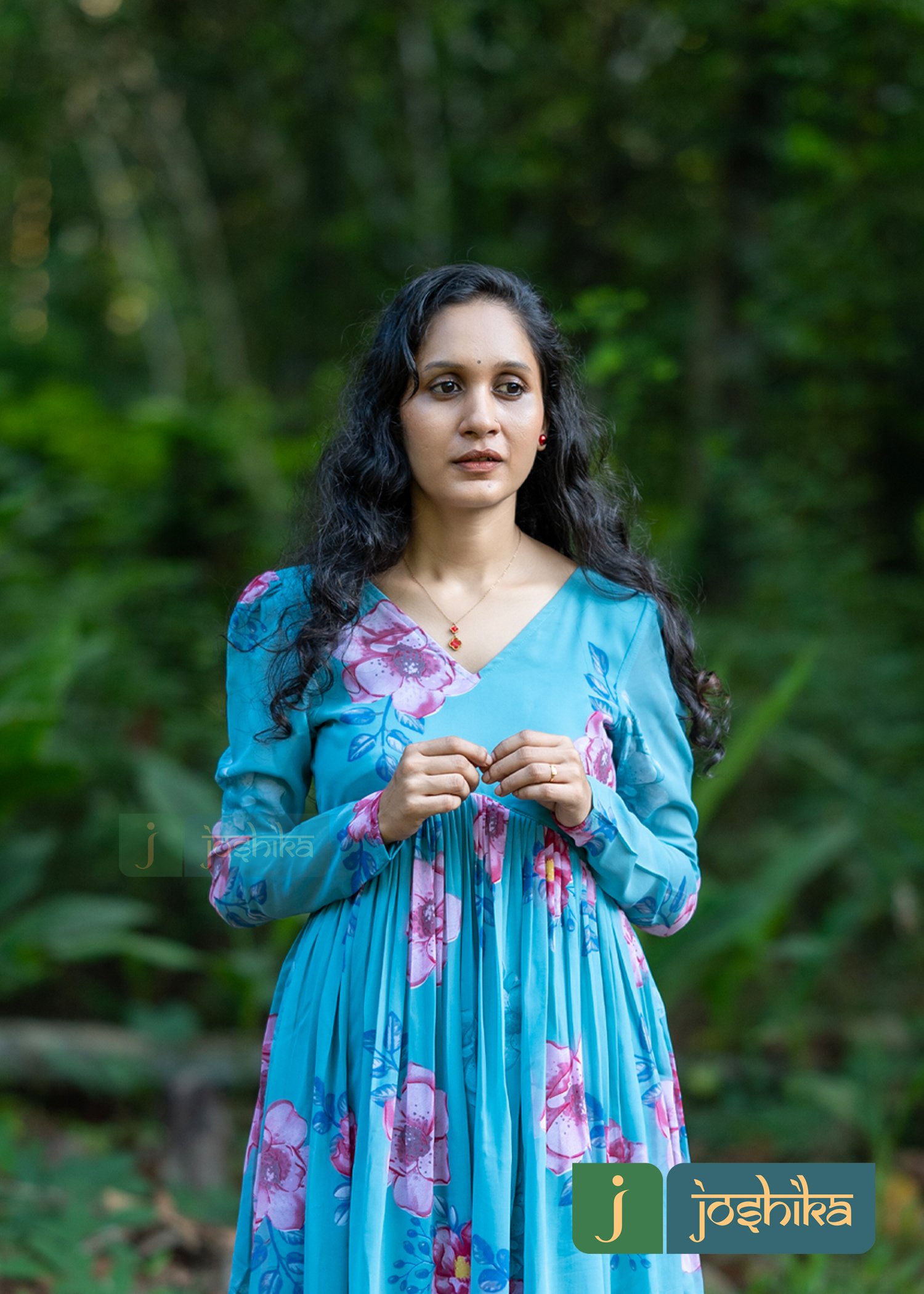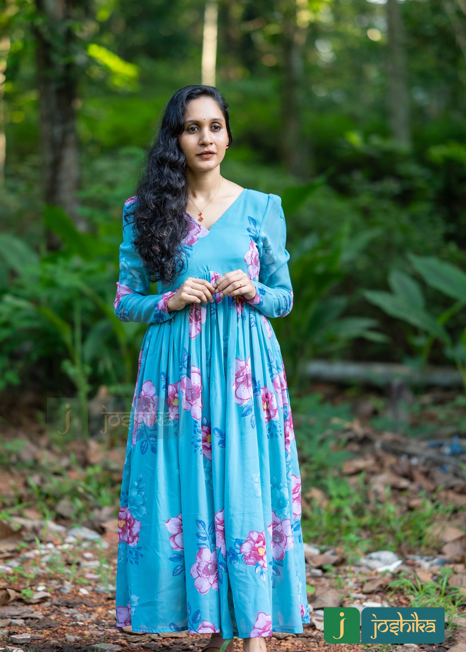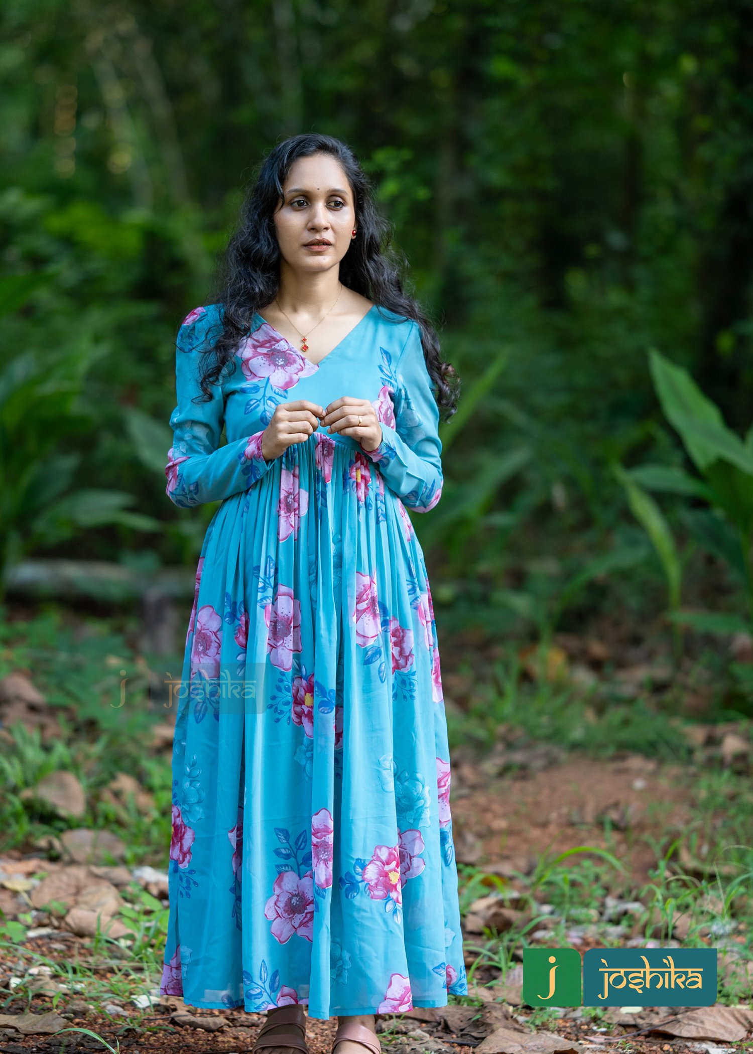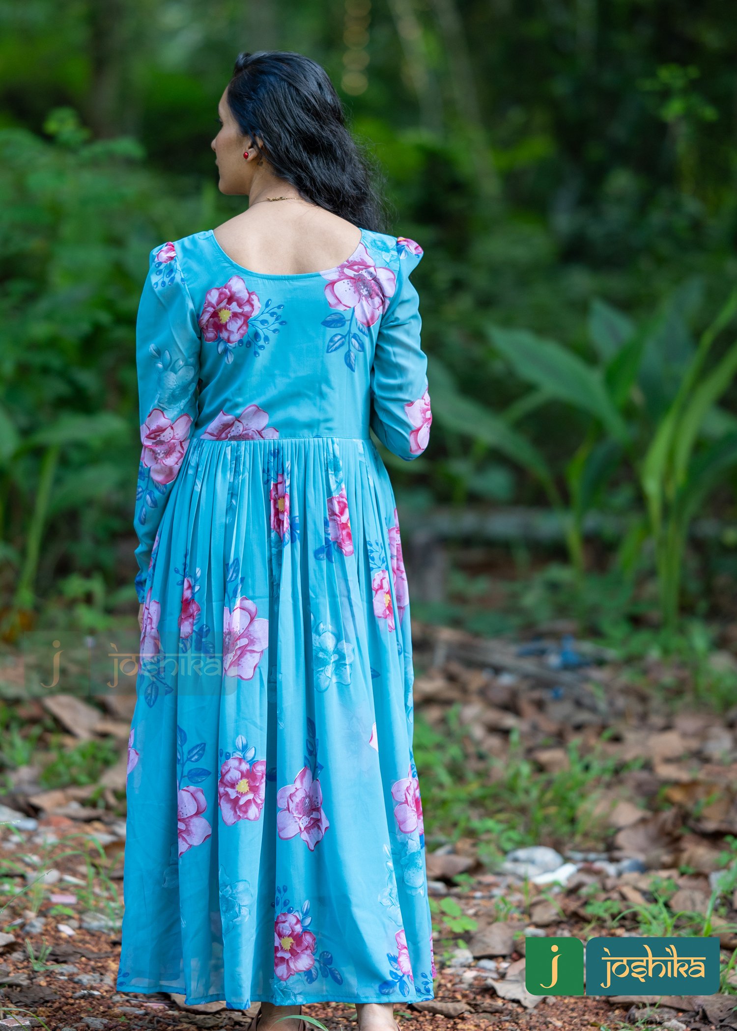 Printed georgette Aliya cut pleated kurta , full sleeves with puff .