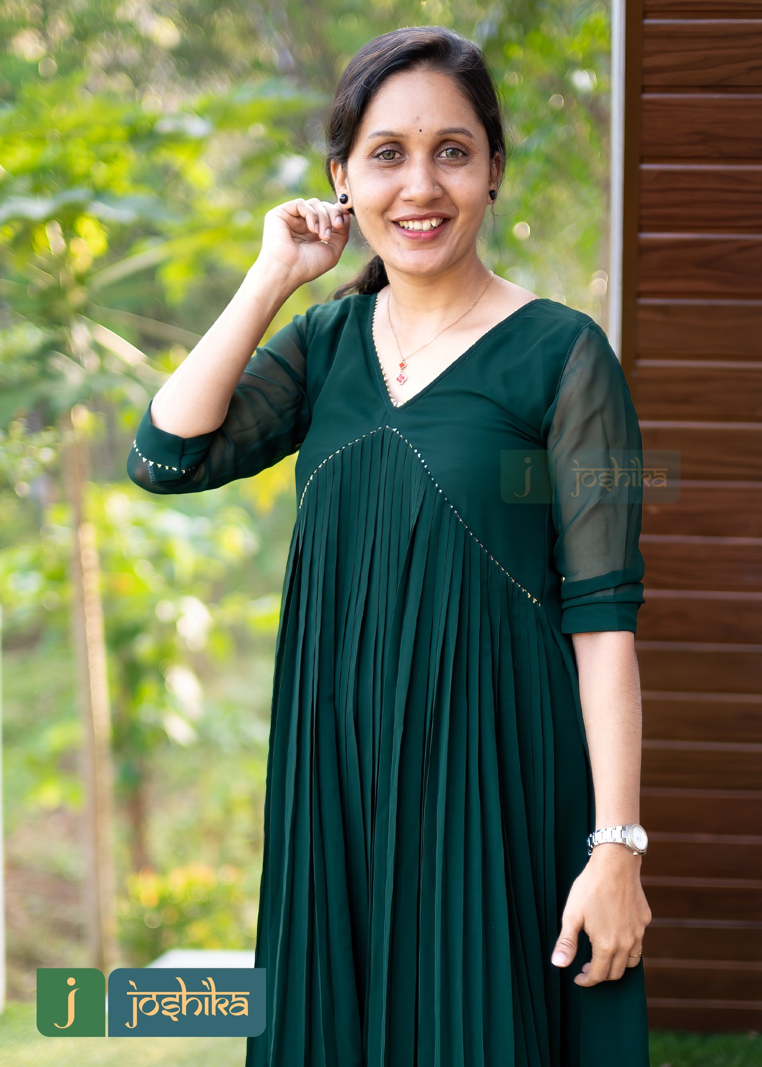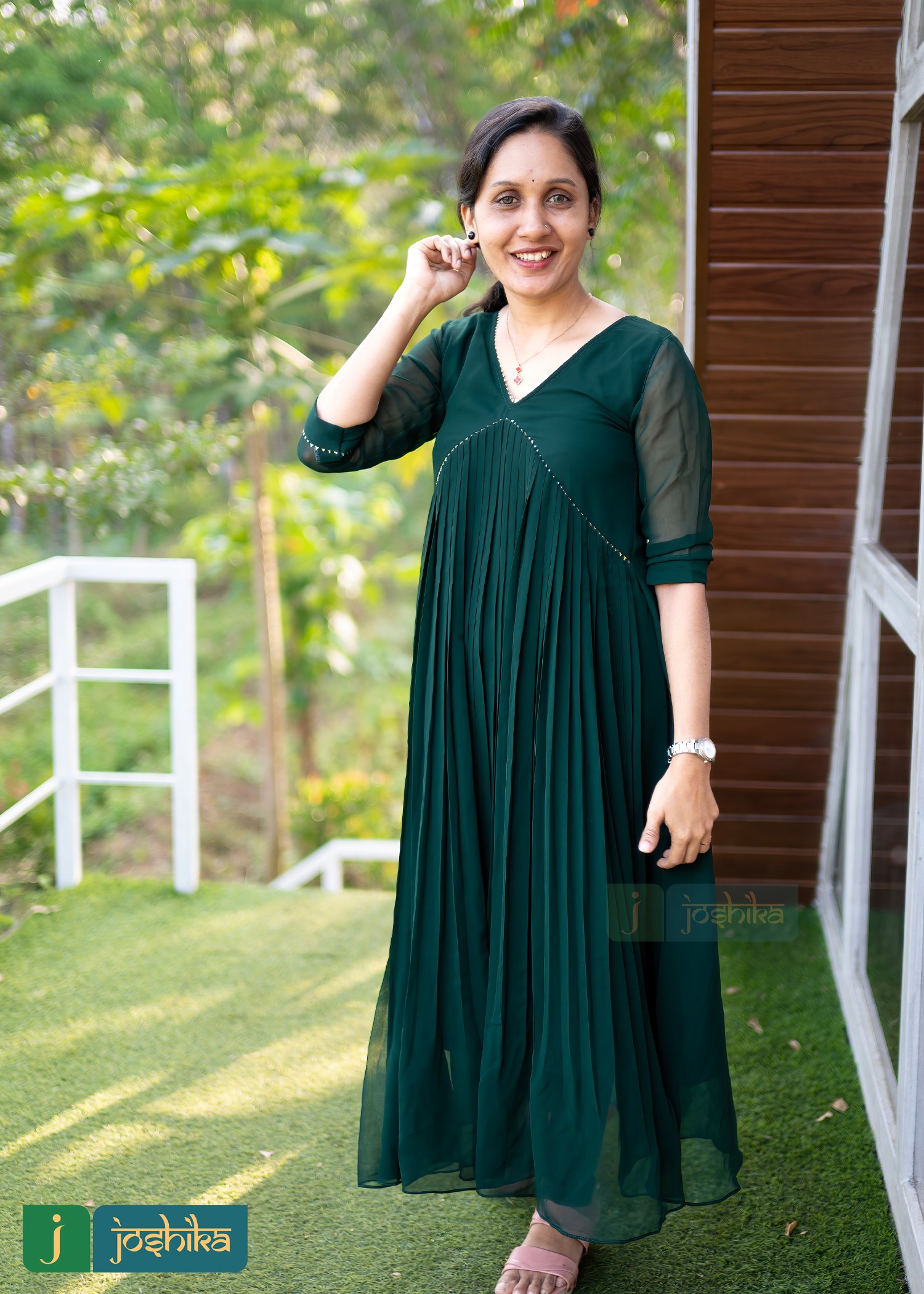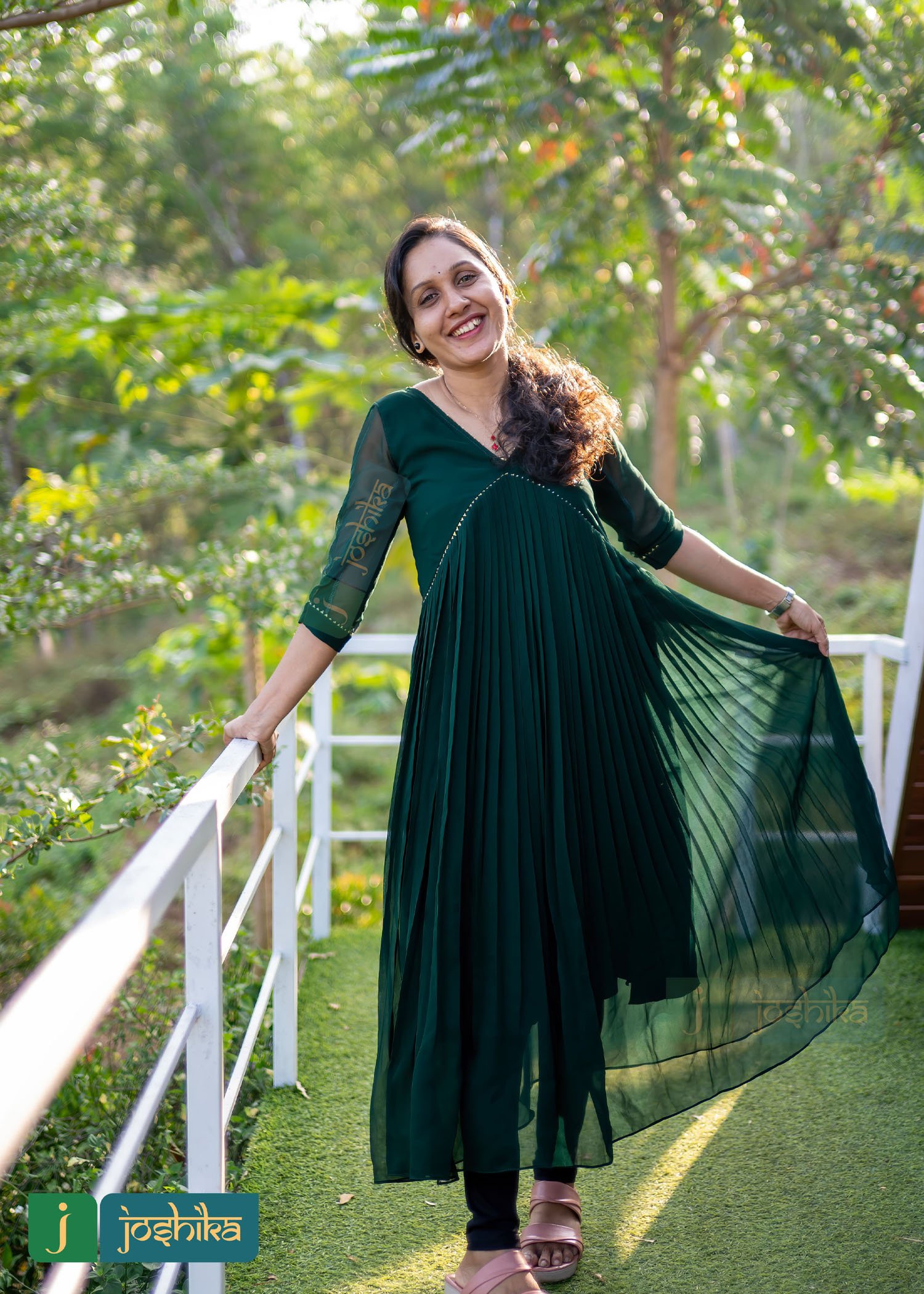 Aliya cut pleated green George kurta embellished with golden lace.
