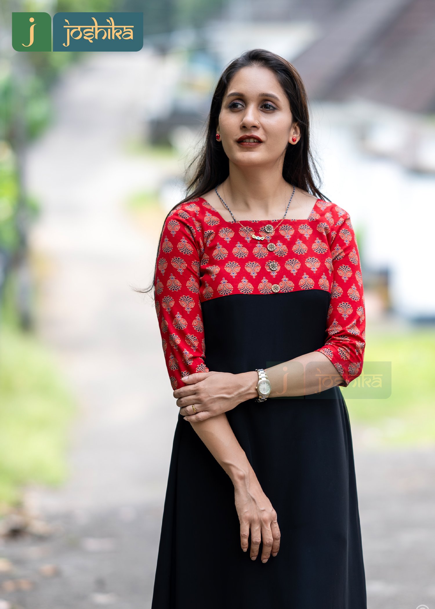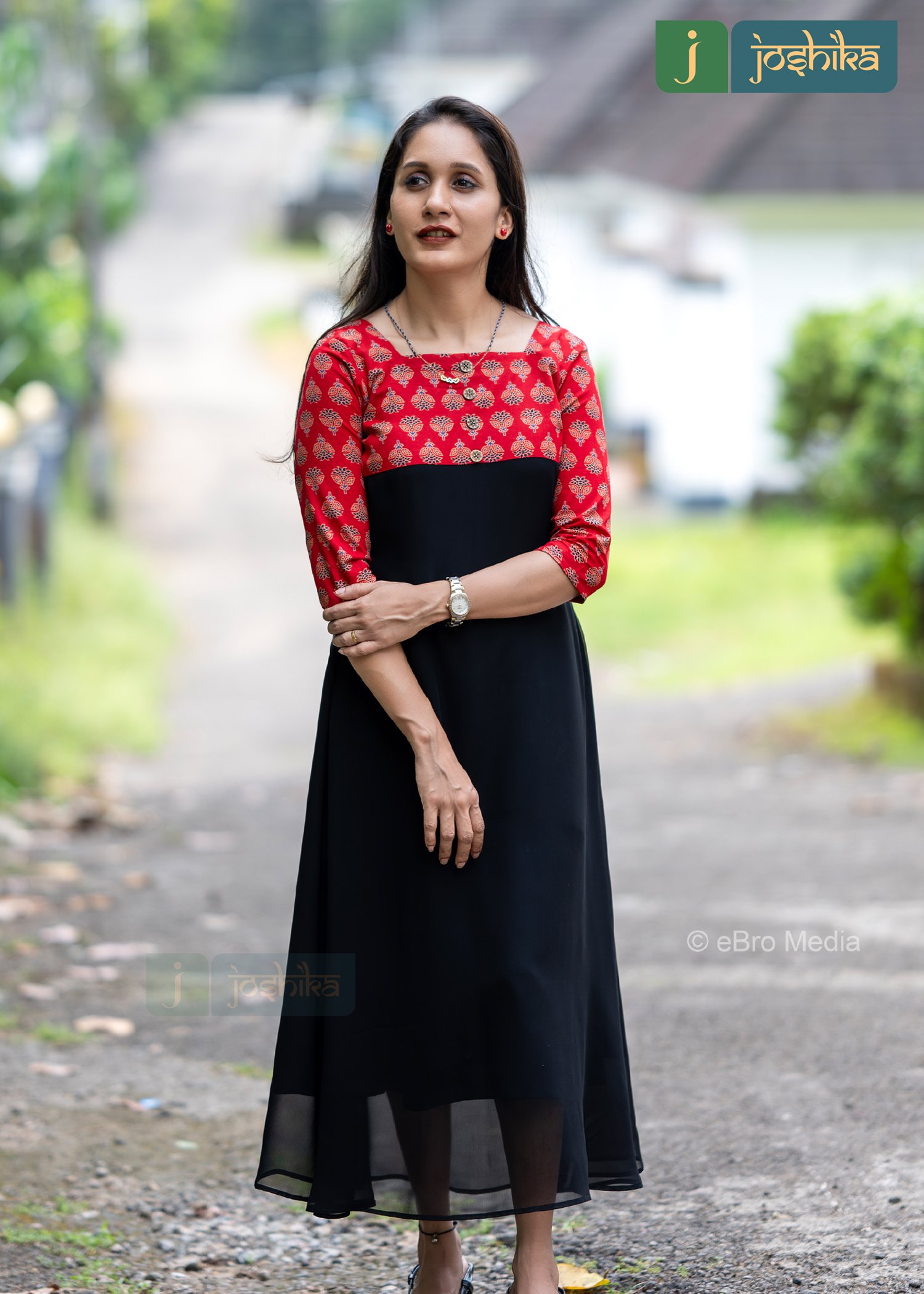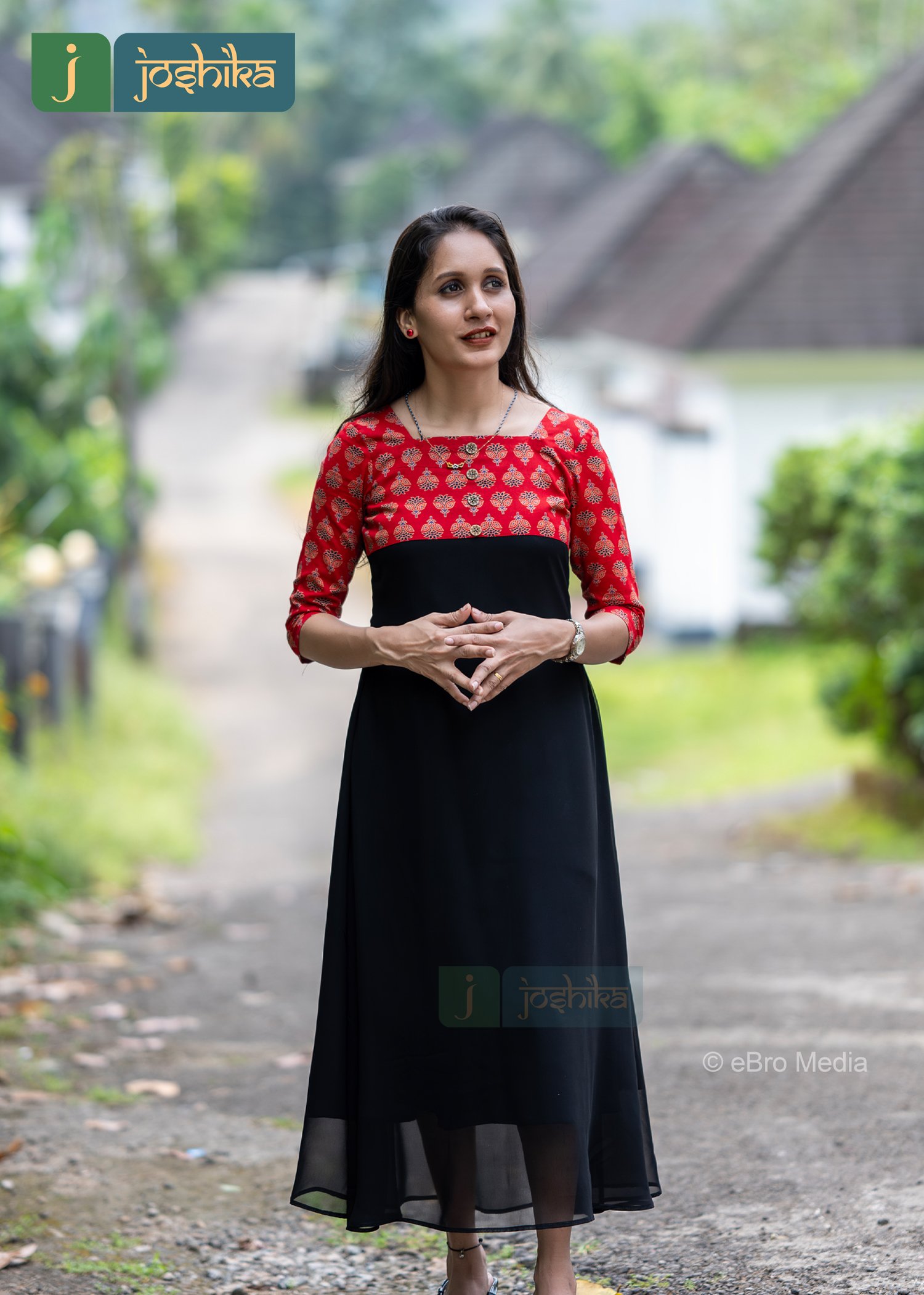 Black color A-line georgette kurta with ajrakh patterned yoke, embellished with coconut shell buttons, red ajrakh yoke with gold patterns,3/4th sleeves with the same ajrakh material.