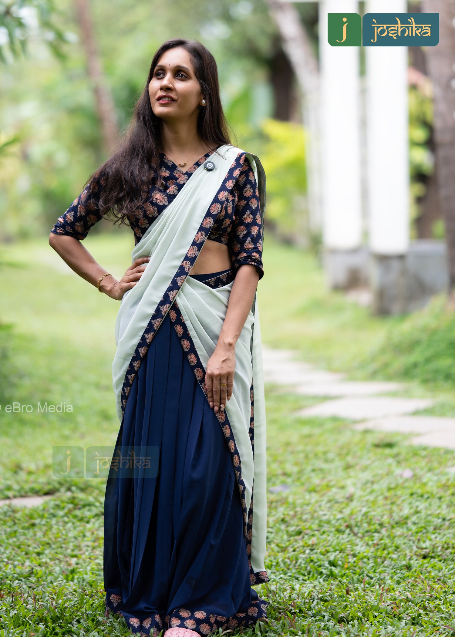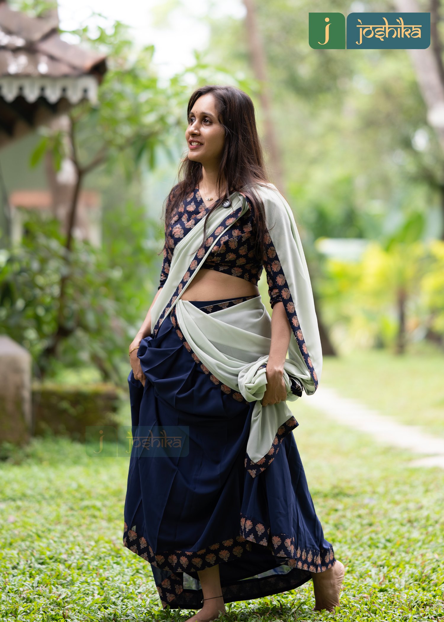 A traditional south Indian attire consisting of a long skirt and a blouse with dupatta, dark blue skirt with ajrakh border. blue ajrakh blouse with copper floral pattern, light green dupatta with ajrakh border.