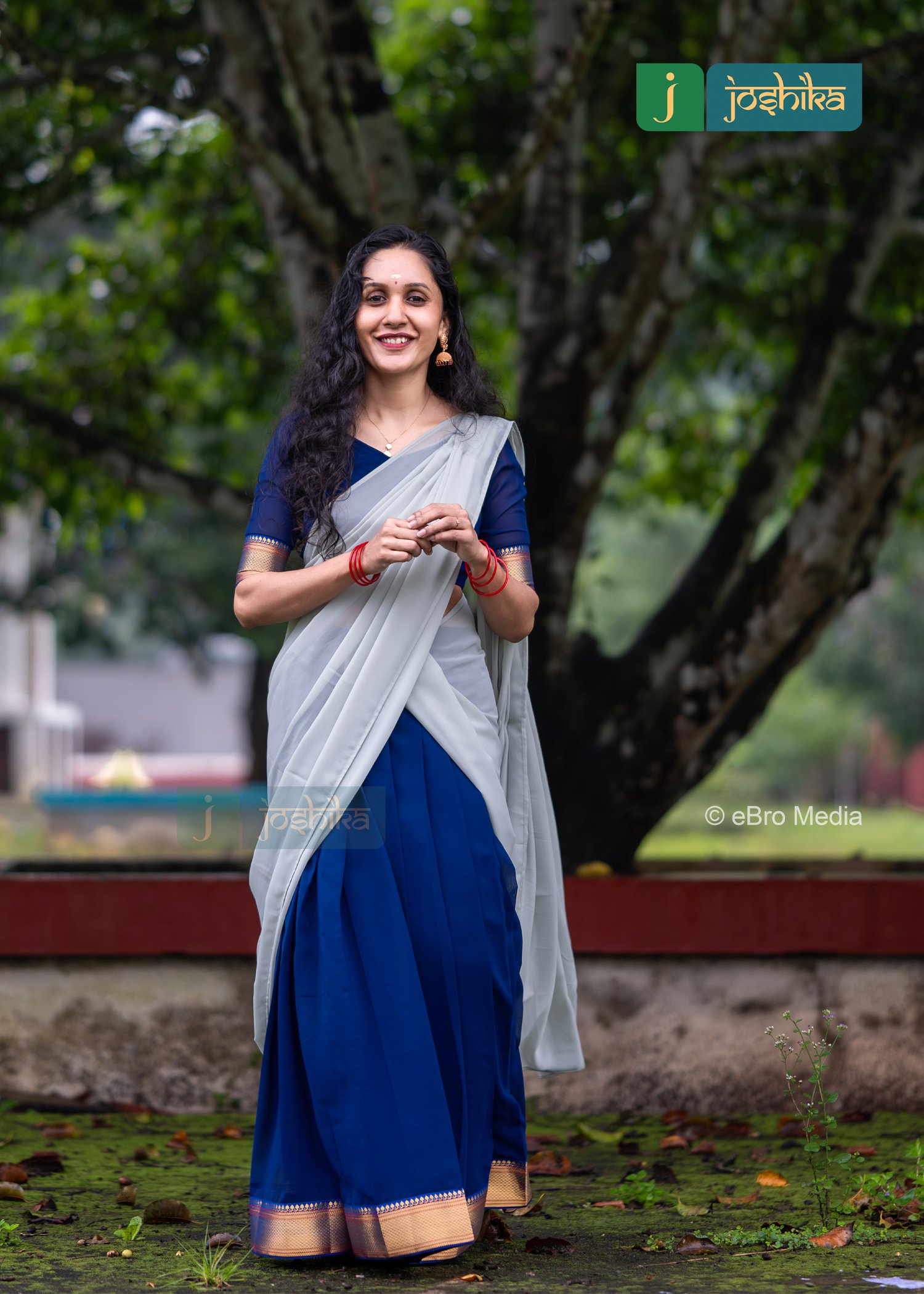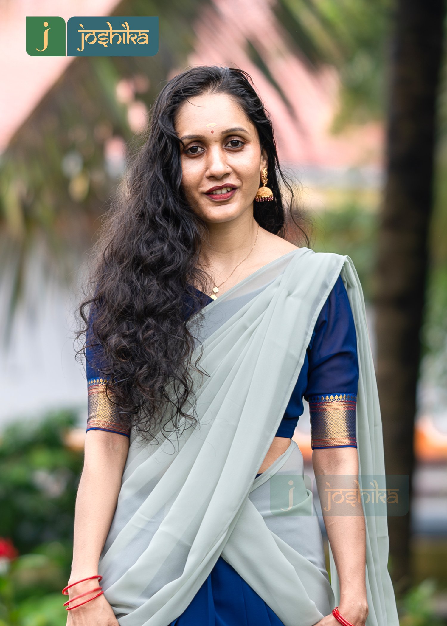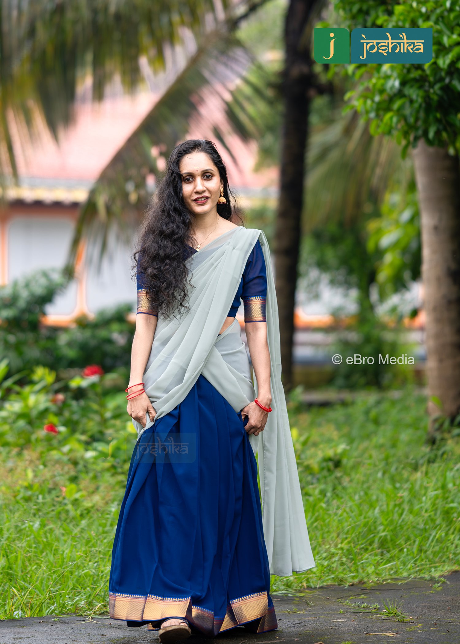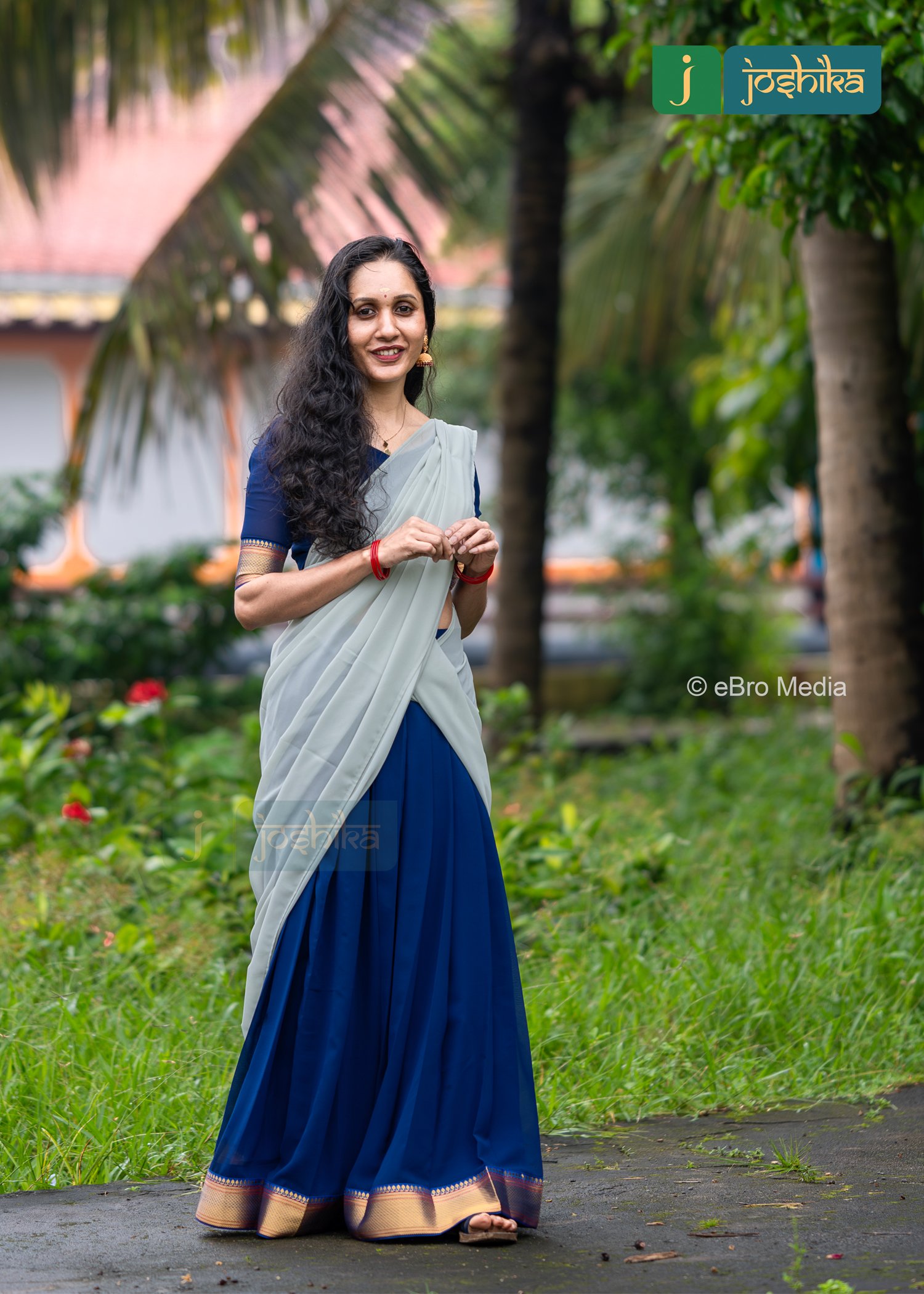 This Davani set features a stunning combination of a blue skirt with gold accents and a ash gray drape. The outfit is complemented by a blue blouse with gold detailing on the sleeves.