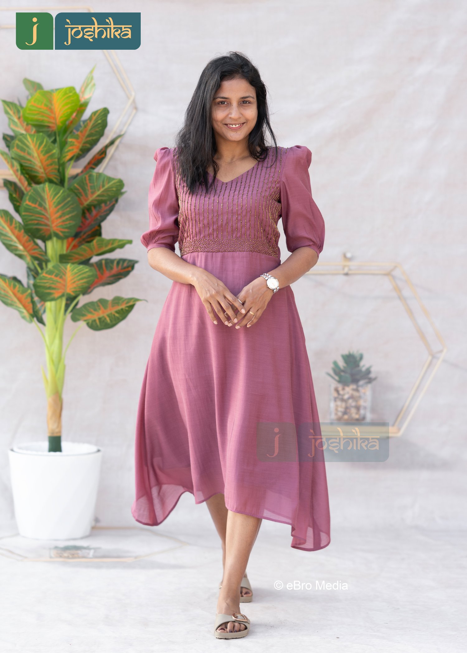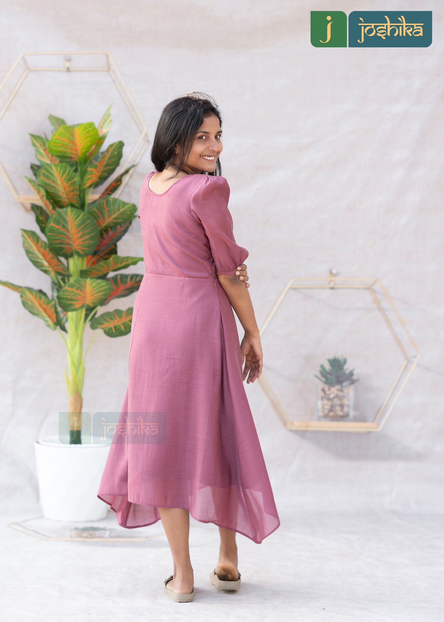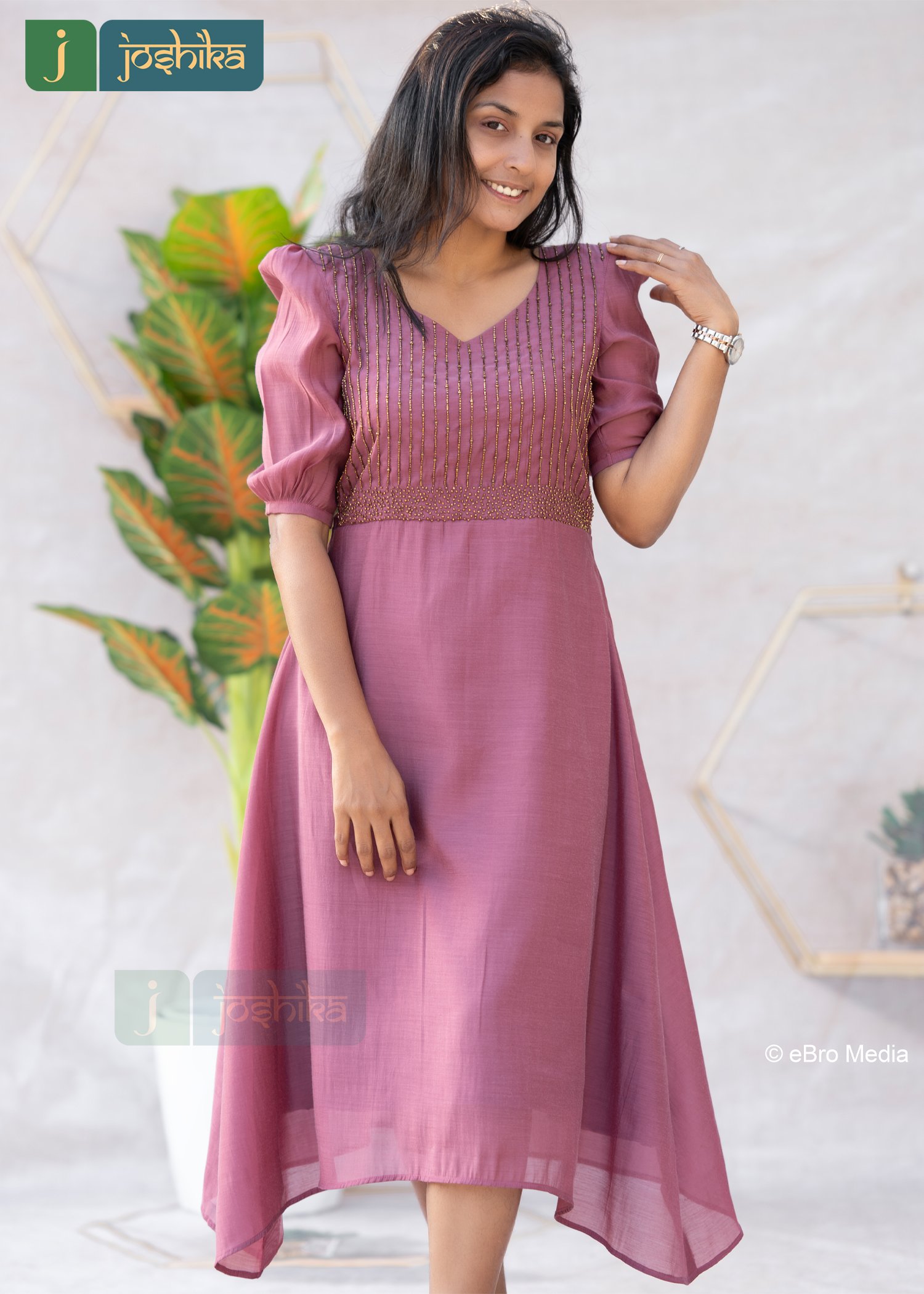 Elevate your everyday elegance with this beautifully crafted A-line kurta, designed in a soft dusky rose hue. The kurta features delicate hand embroidery on the yoke, highlighted with fine vertical detailing that adds subtle richness to the silhouette . The elegant gathered sleeves lend a graceful, feminine touch, while the flowy A-line cut ensures comfort and effortless movement. Crafted from lightweight semi Chanderi, breathable fabric , the kurta is perfect for casual outings, festive gatherings , or refined day wear.