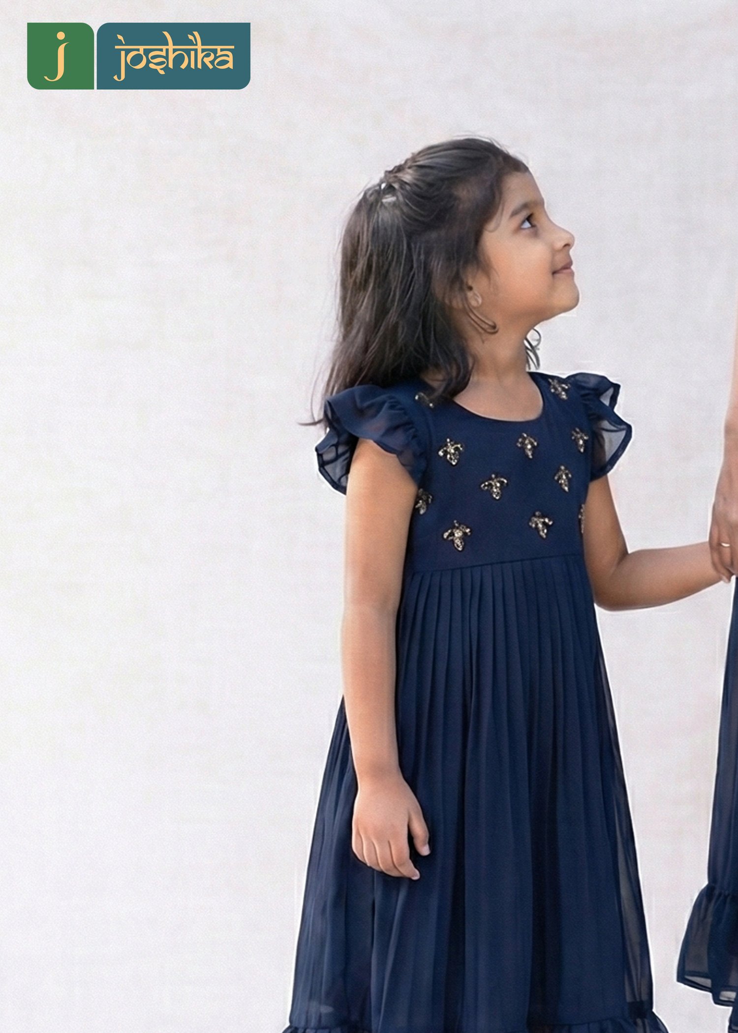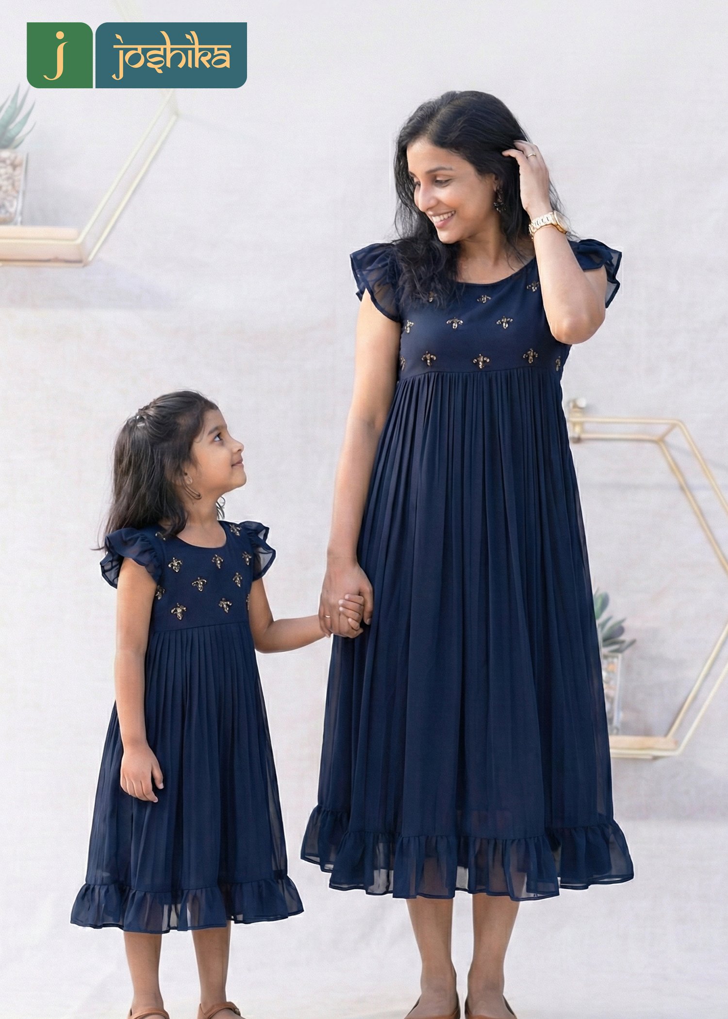 Celebrate togetherness in timeless style with this elegant mother-daughter combo frock kurta. Crafted in lightweight georgette , both outfit feature delicate hand embroidery on the yoke, soft gathers for a graceful flare, and ruffled sleeve and hem detailing for a charming finish. The rich Navy blue hue adds warmth and sophistication, making it perfect for festive occasions, family celebrations, or special moments together. Comfortable , flowy, and thoughtfully designed, this matching set beautifully blends tradition with contemporary elegance.
