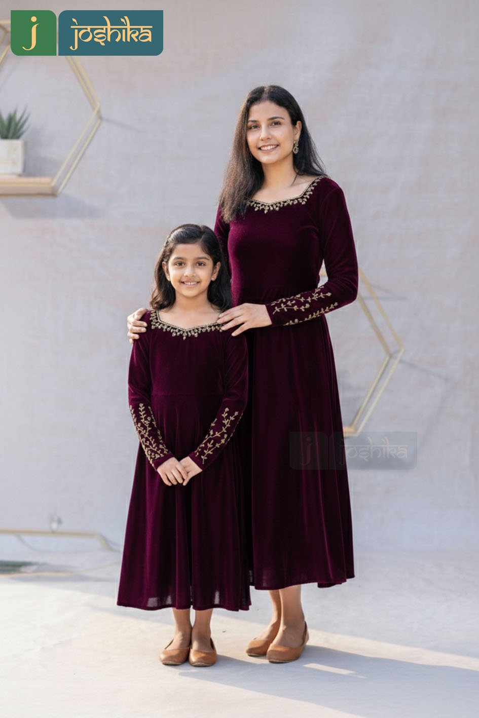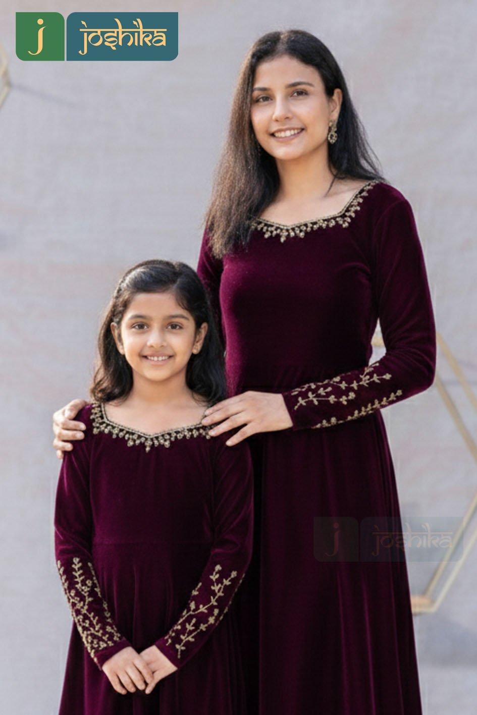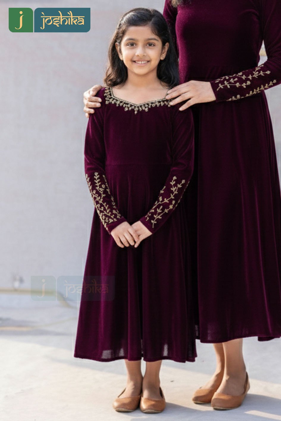 Celebrate timeless elegance with this beautifully coordinated mother–daughter dress set, crafted in rich velvet for a soft, luxurious feel. The deep wine hue is enhanced with delicate hand work along the neckline and sleeves, adding a touch of refined charm. Designed with a graceful silhouette and comfortable fit, these dresses are perfect for festive occasions, family celebrations, and special moments together. Classic, elegant, and effortlessly stylish—made to create memories in matching style.