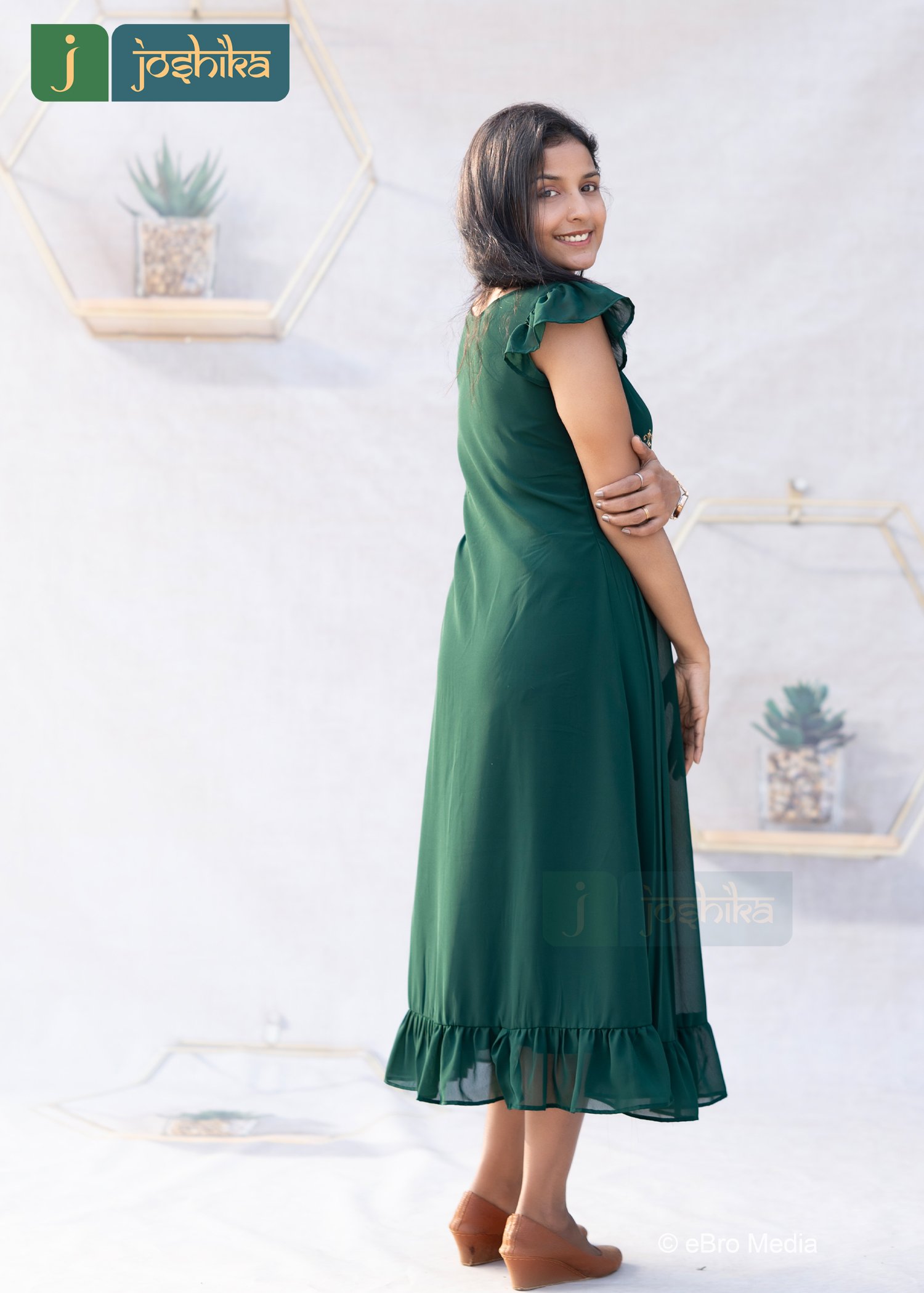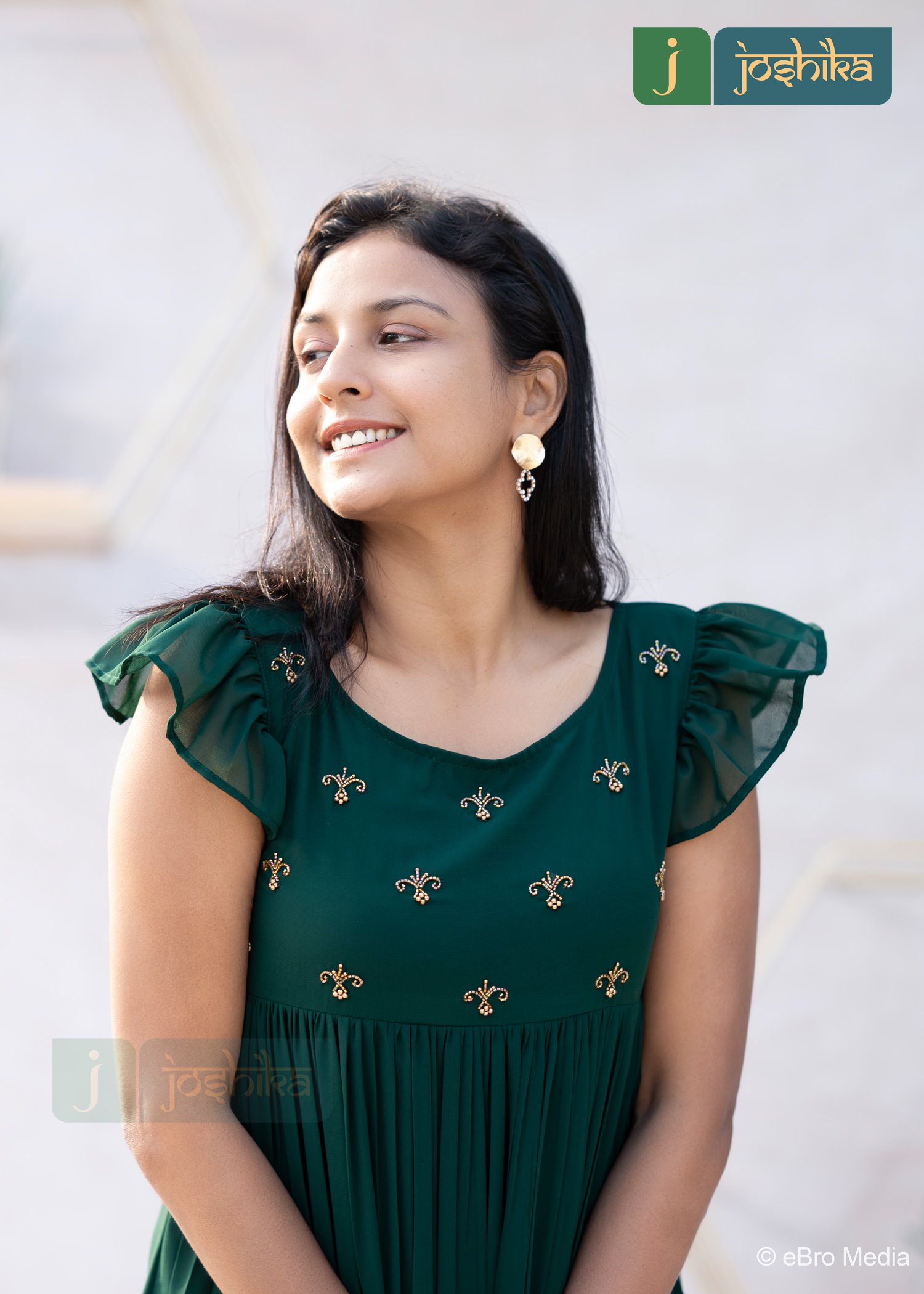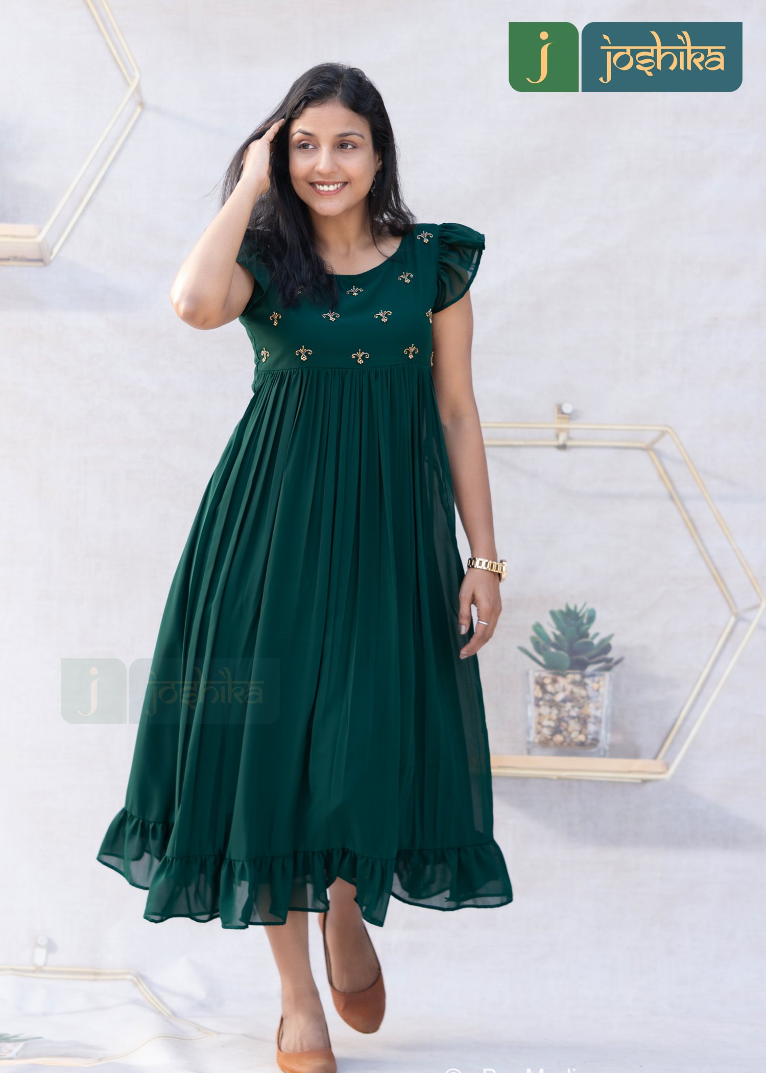 Elevate your everyday elegance with this beautifully crafted georgette frock kurta. Designed in a rich emerald hue, it features delicate embroidery on the yoke that adds a subtle touch of artisanal charm. The soft, flowy georgette fabric drapes effortlessly, while the frock style silhouette with gentle gathers and a ruffled hem creates a flattering , feminine look. Finished with flutter hem sleeves for added grace, this kurta is perfect for festive mornings, casual celebrations, or elegant day outings. Pair it with minimal accessories and flats for a timeless ensemble.