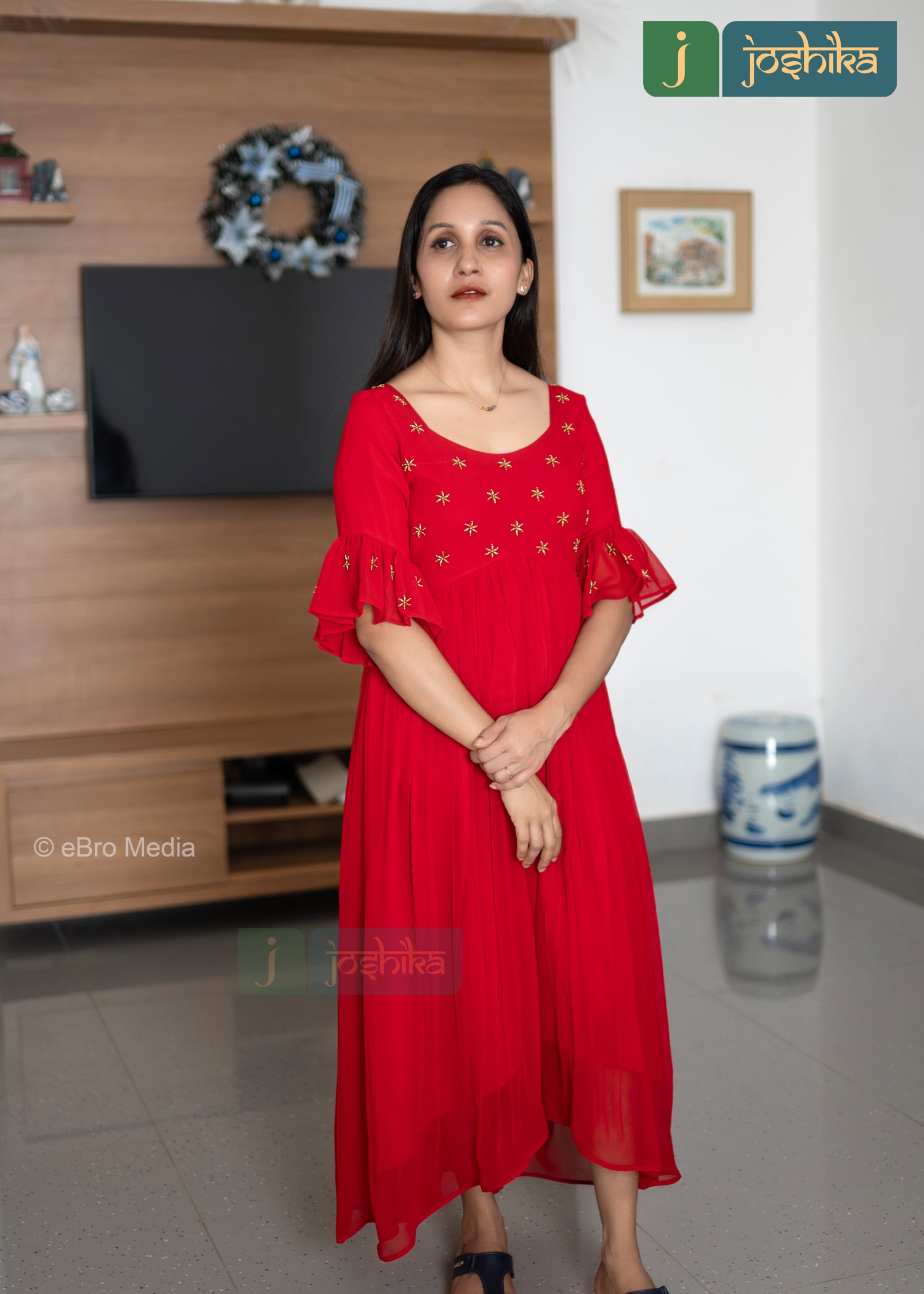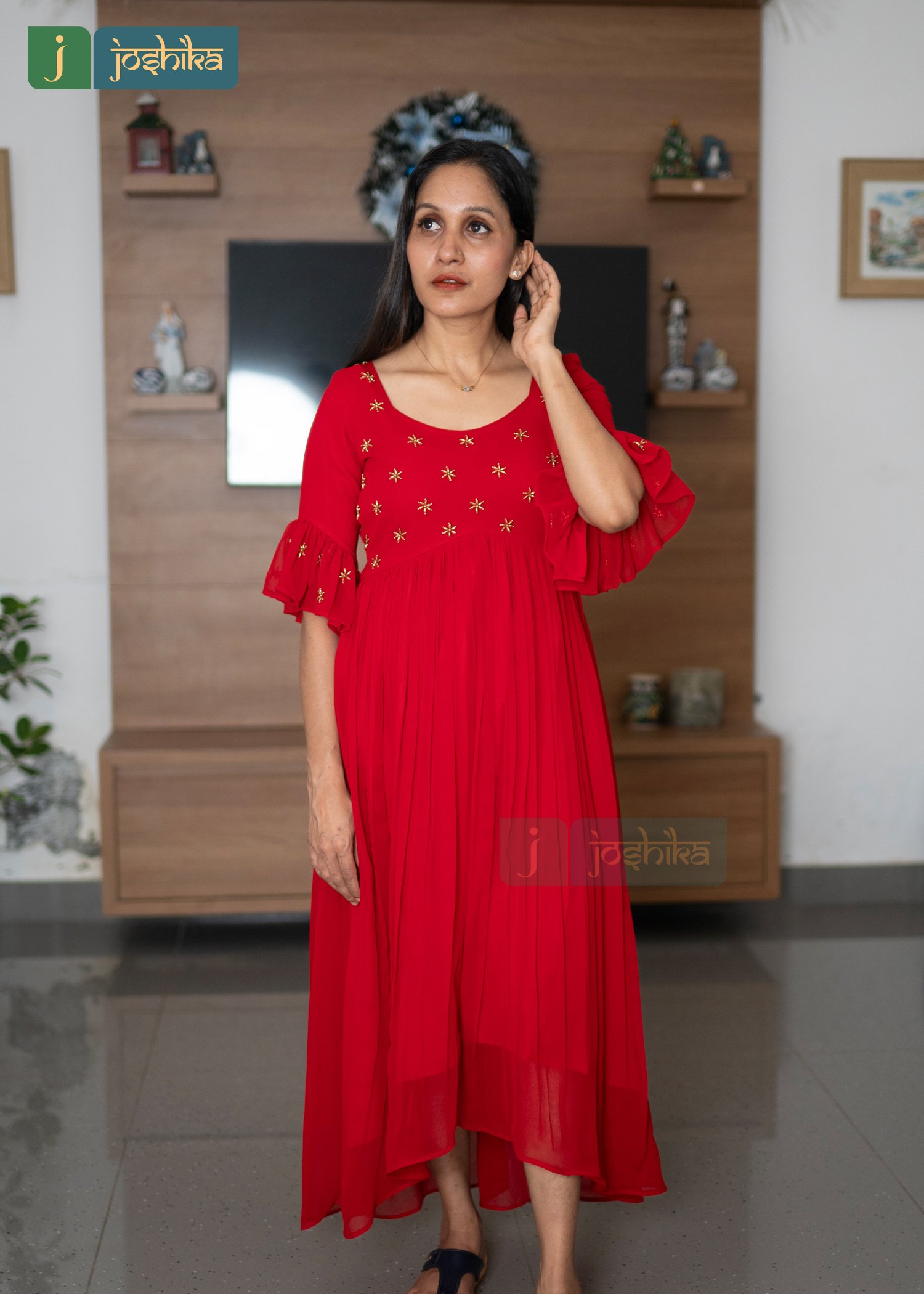Stylish and feminine , this high low kurta is crafted in airy georgette for a flowy silhouette. The gold tone embroidered motifs and beautifully embroidered star motifs .The soft georgette fabric drapes gracefully while the ruffle sleeves add a playful touch. perfect for both ethnic and Indo- western look.