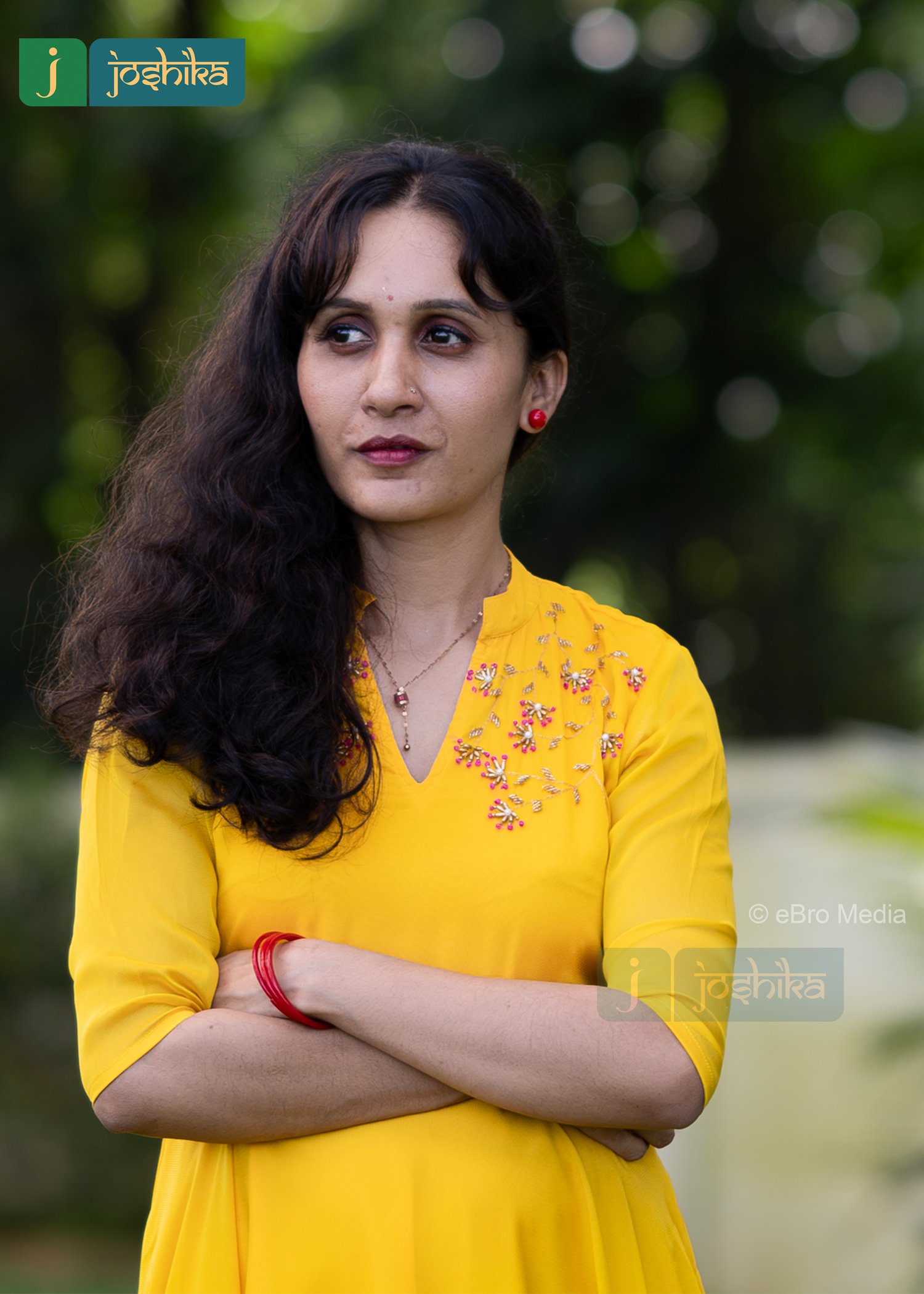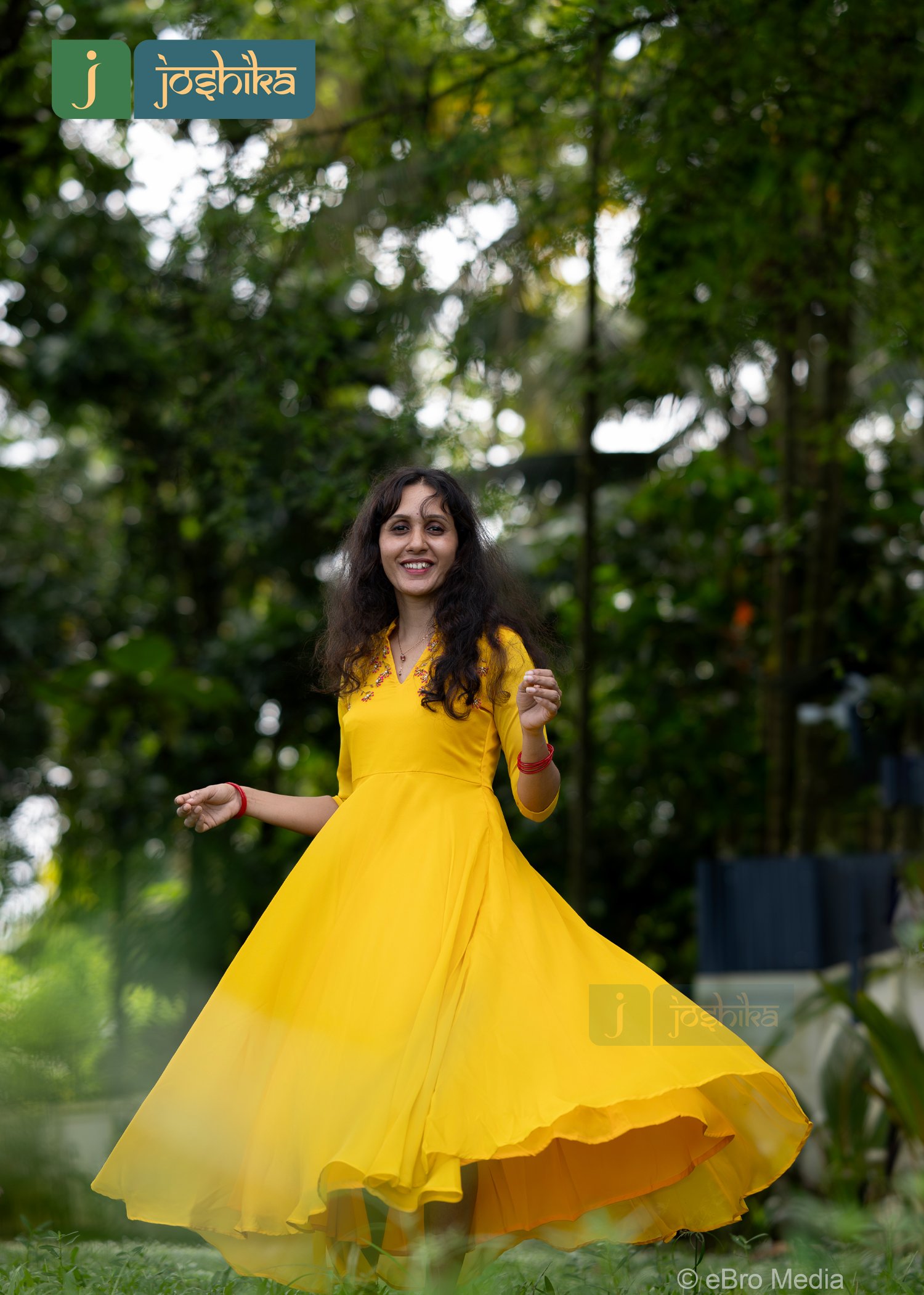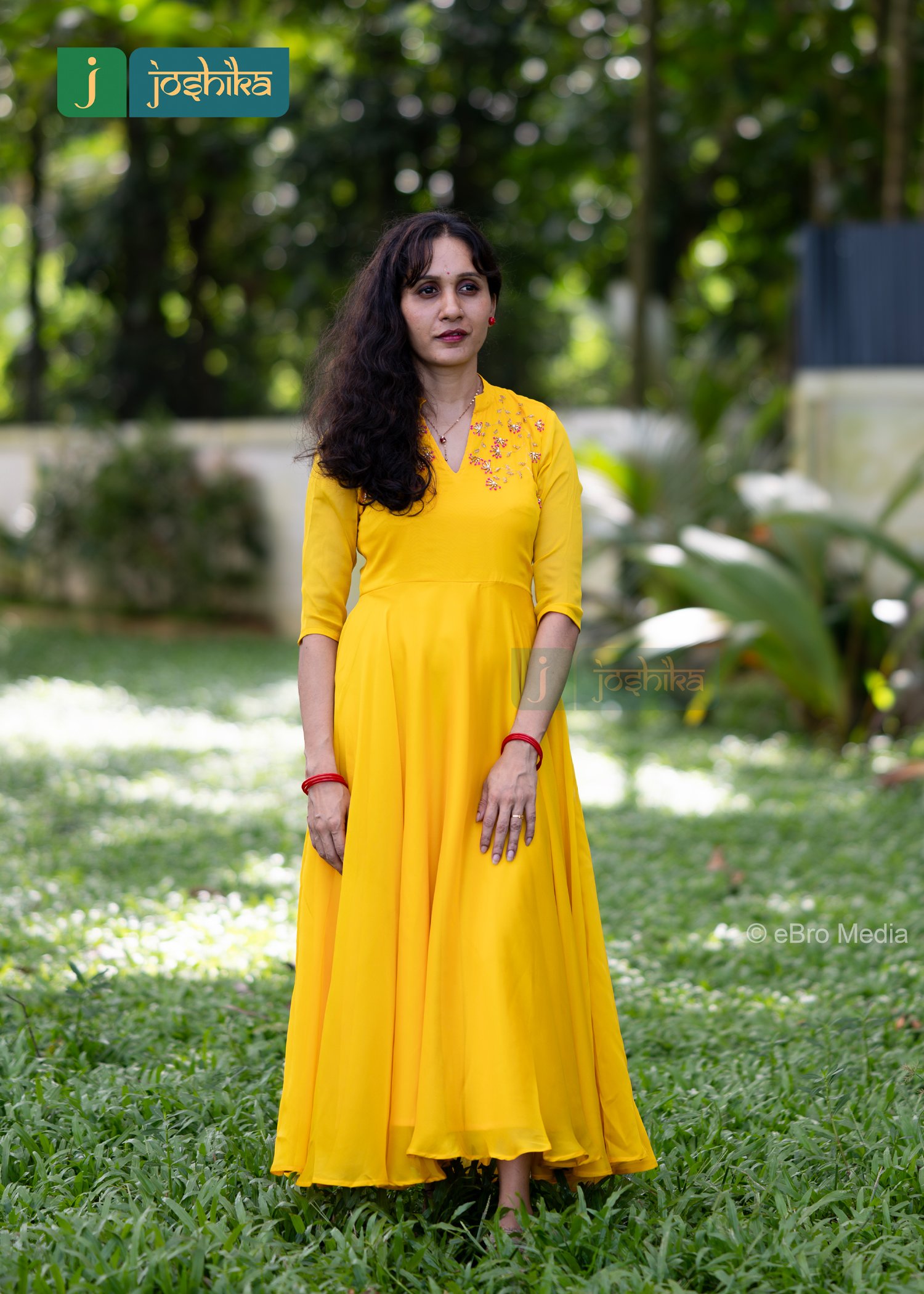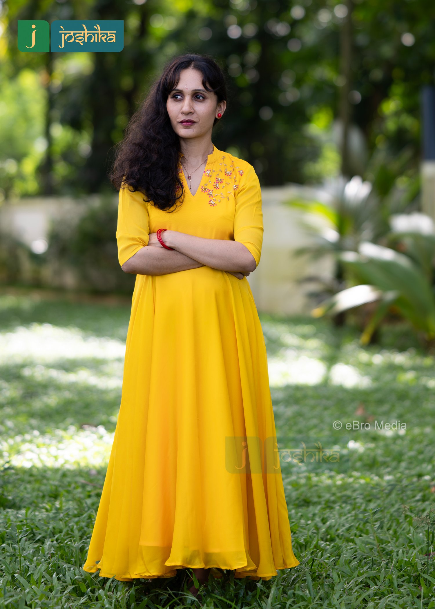 A vibrant yellow flared kurta, adorned with intricate hand embroidery on the chest area. The kurta features a V neckline and three -quarter sleeves, exuding a sense of elegance and cultural heritage .