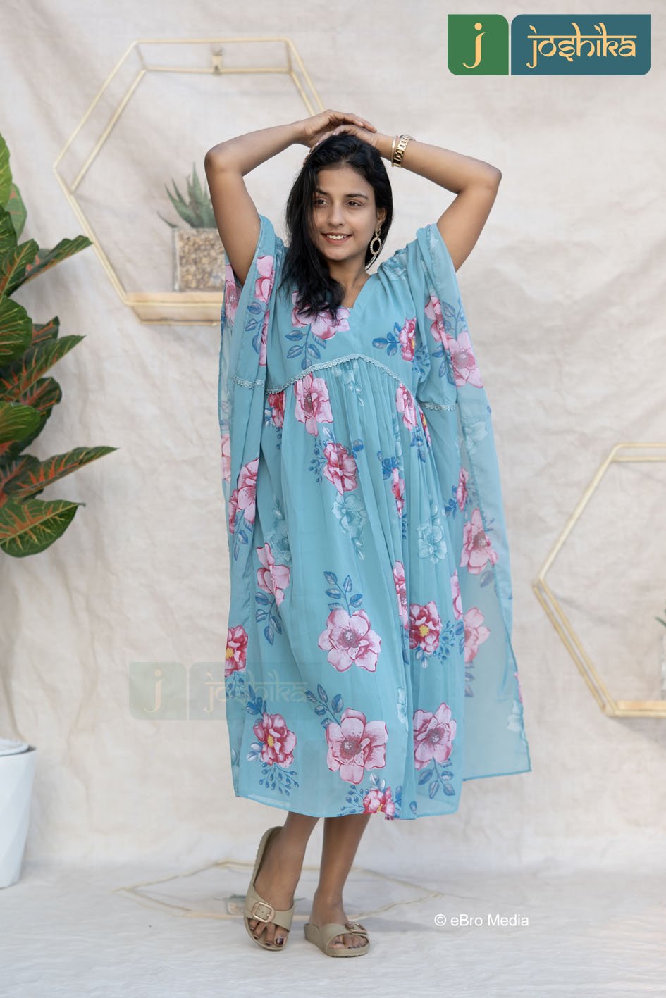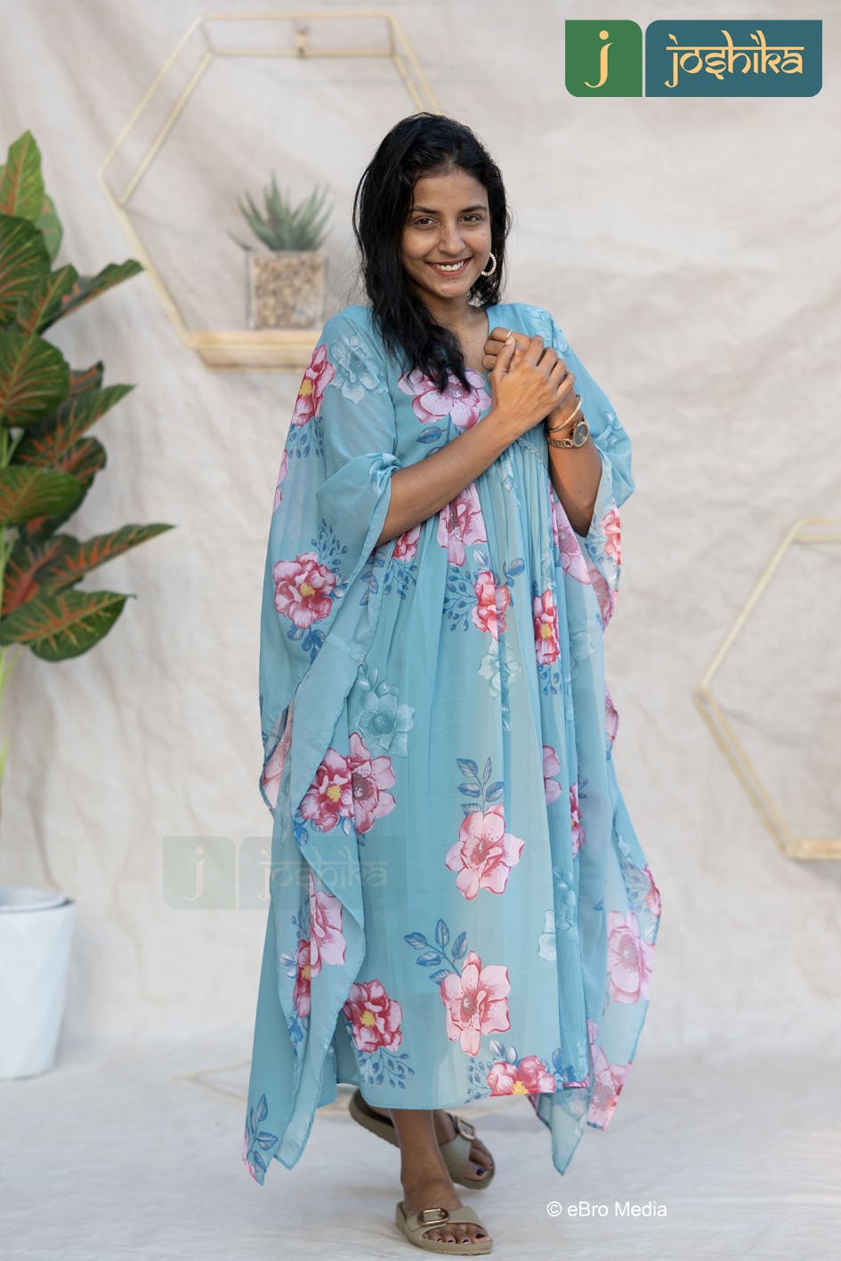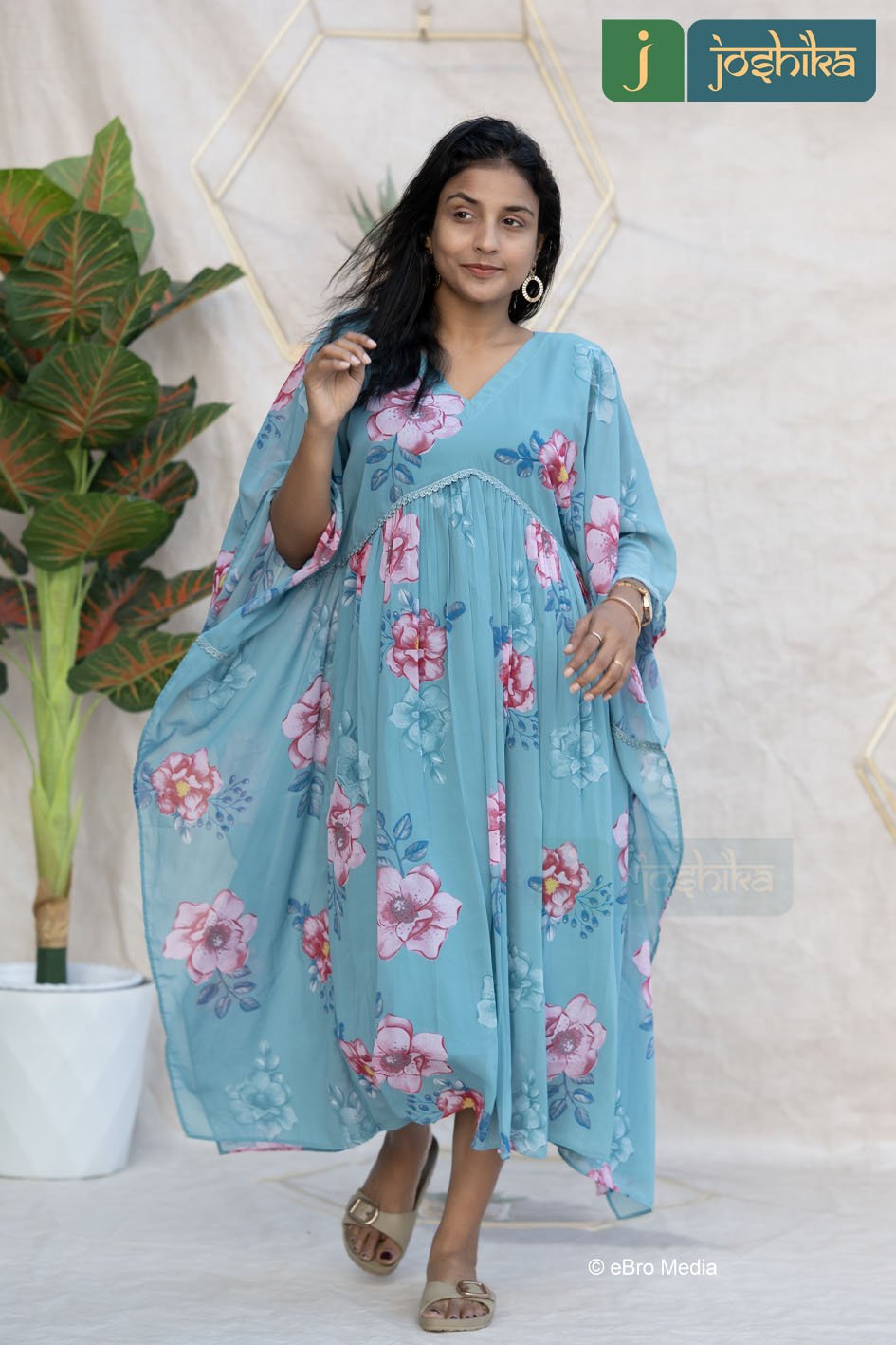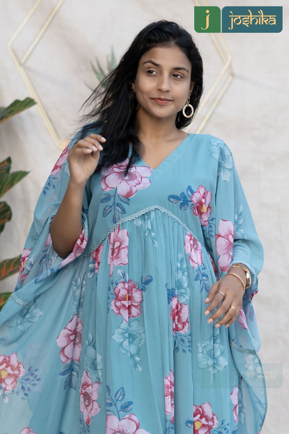 Refresh your wardrobe with this effortlessly elegant sky blue georgette kaftan, designed to combine comfort with graceful style. Crafted from lightweight, flowy georgette fabric, this kaftan features delicate pleats that add soft texture and beautiful movement. The floral print enhances its feminine charm, while the subtle lace detailing along the yoke adds a refined touch.