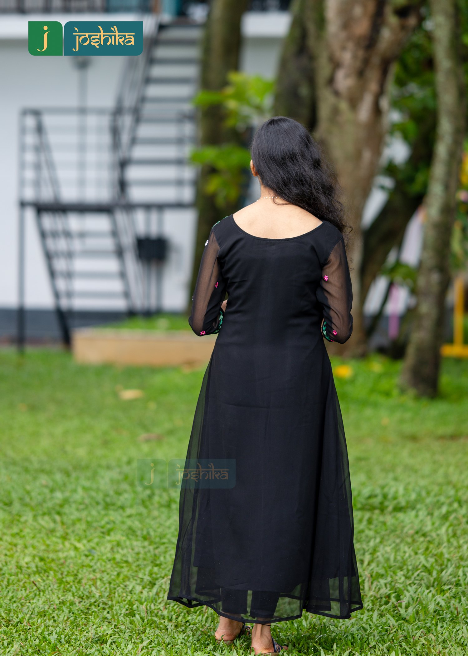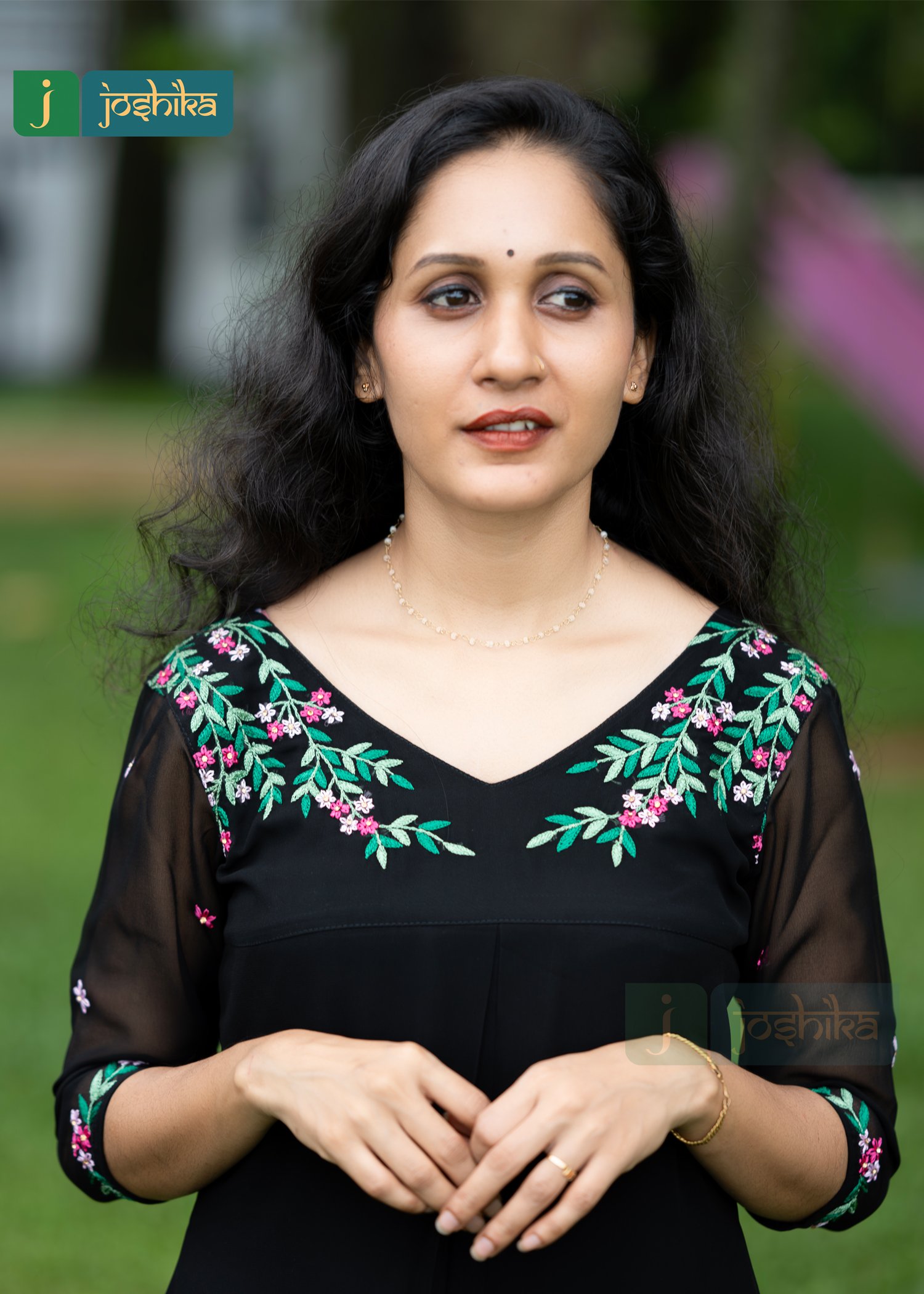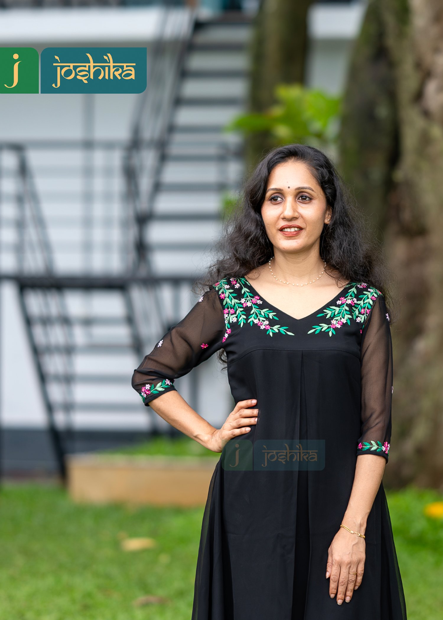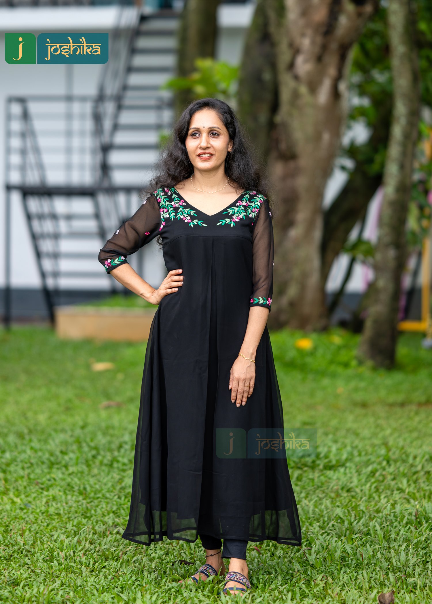 Floral embroidered Aline kurta, Georgette material , Silk threads used for hand embroidery, Yoke and sleeves are embroidered, Inverted pleated kurta.