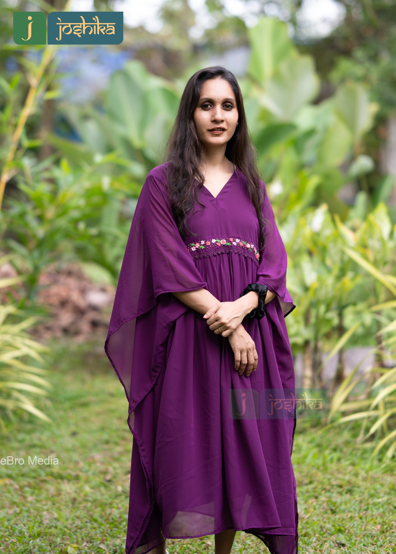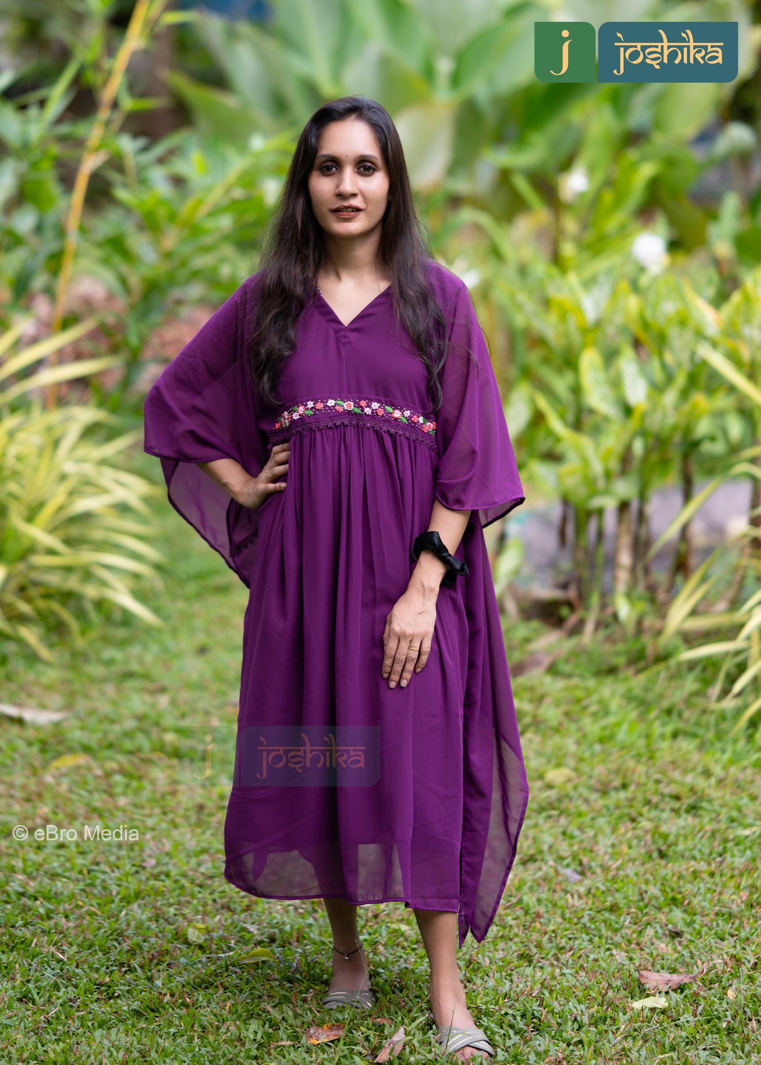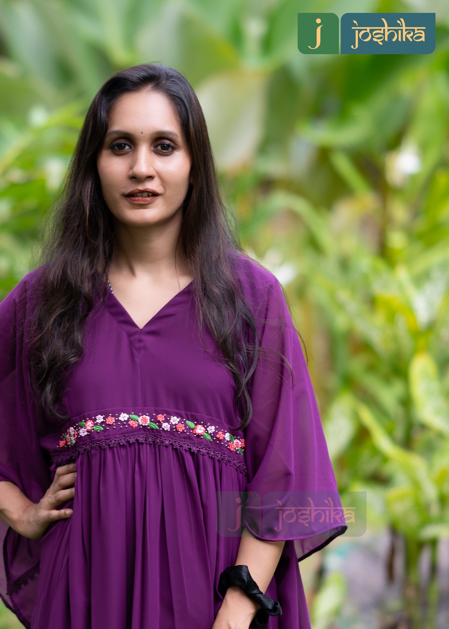 A kaftan is a type of loose-fitting garment often worn for comfort and style. Floral embroidery at the waist, Loose fitting-neck design, Purple color premium georgette material ,attached Purple color lace at the waist.
