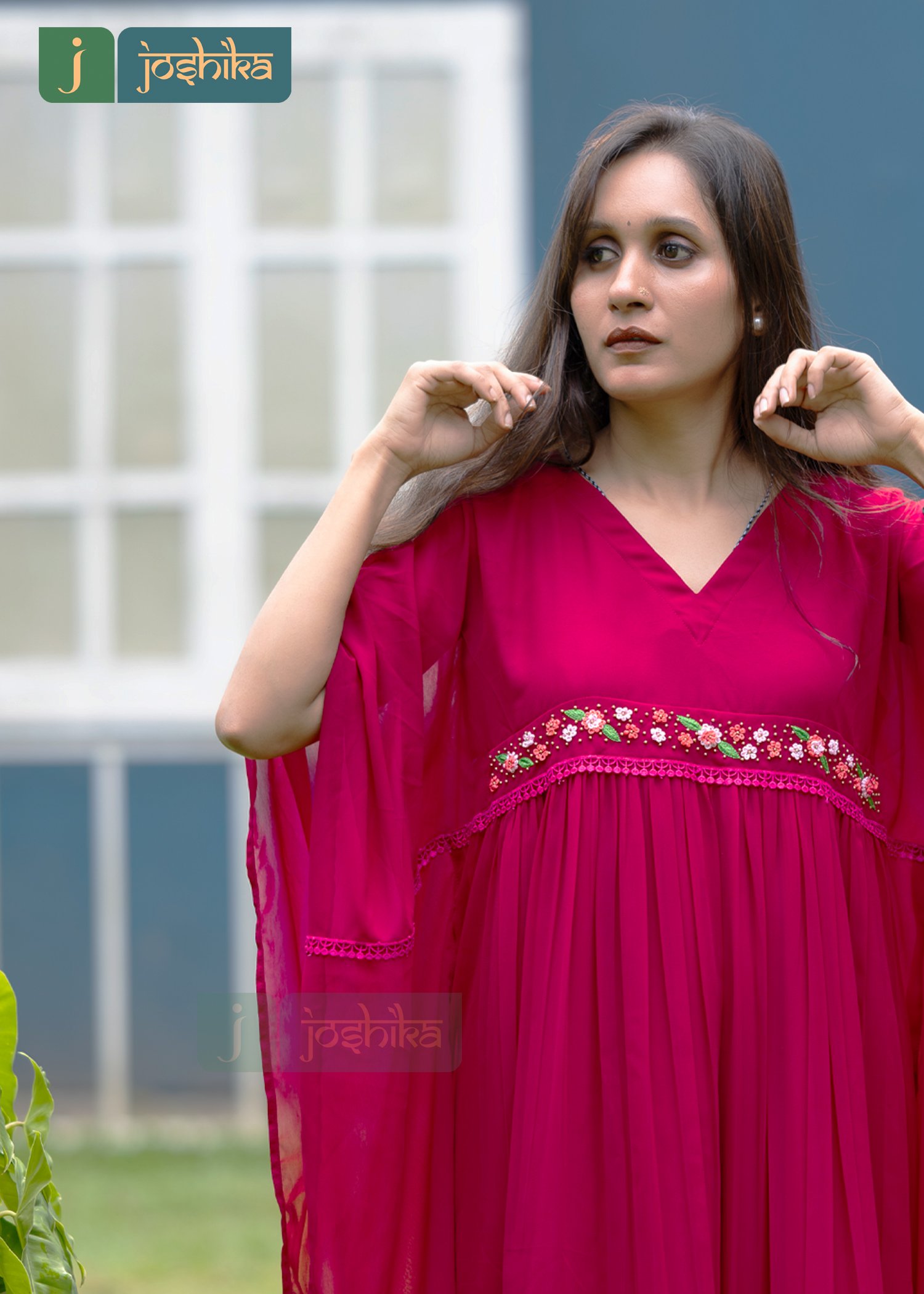 A kaftan is a type of loose-fitting garment often worn for comfort and style. Floral embroidery at the waist, Loose fitting-neck design, Rani pink color premium georgette material ,attached Rani pink color lace at the waist.
