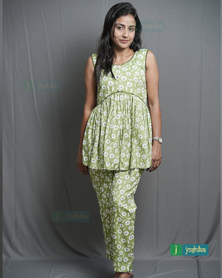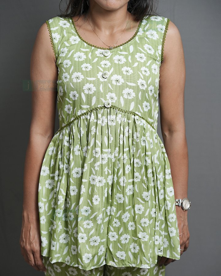 Green color floral printed crape co ord set attached with green leaf lace.