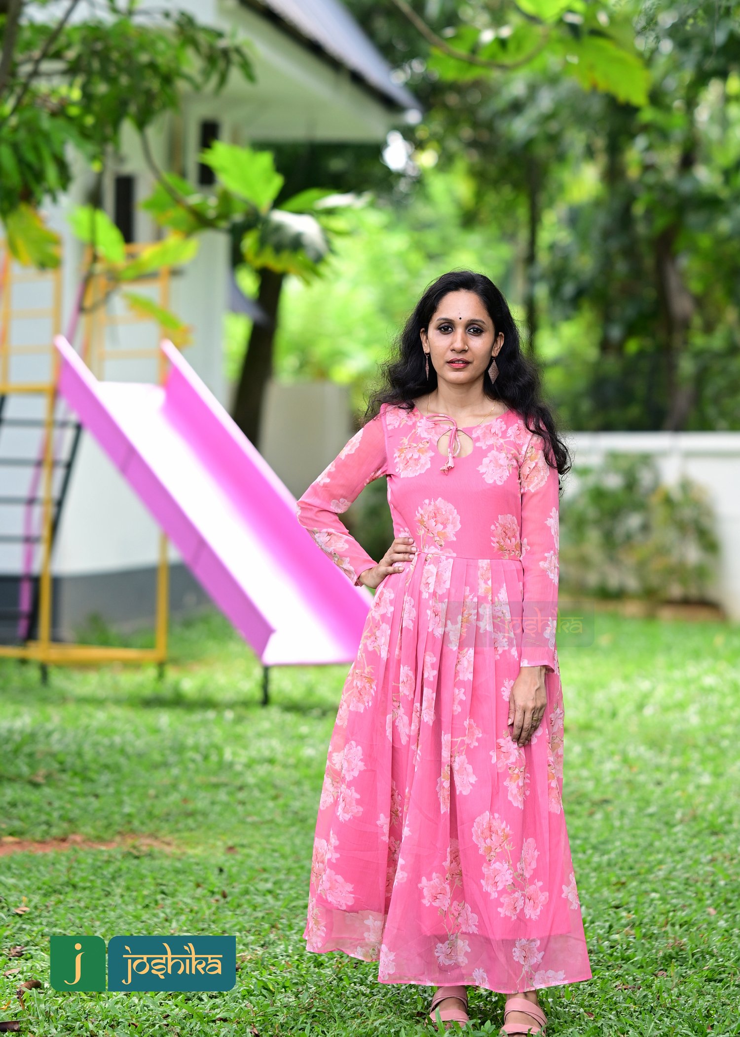 Magenta color printed georgette kurta, pleated design, full sleeves, neck drop design.