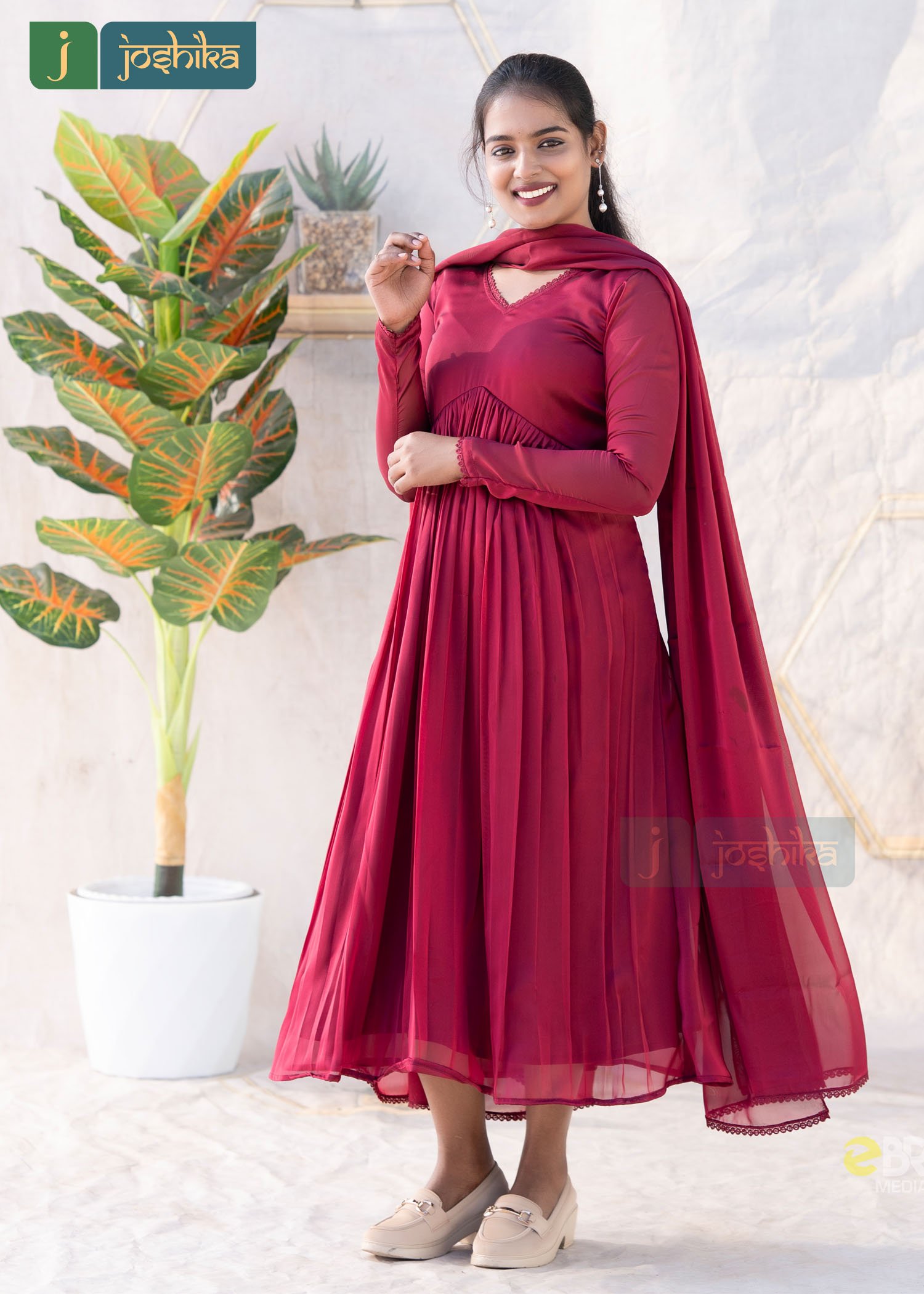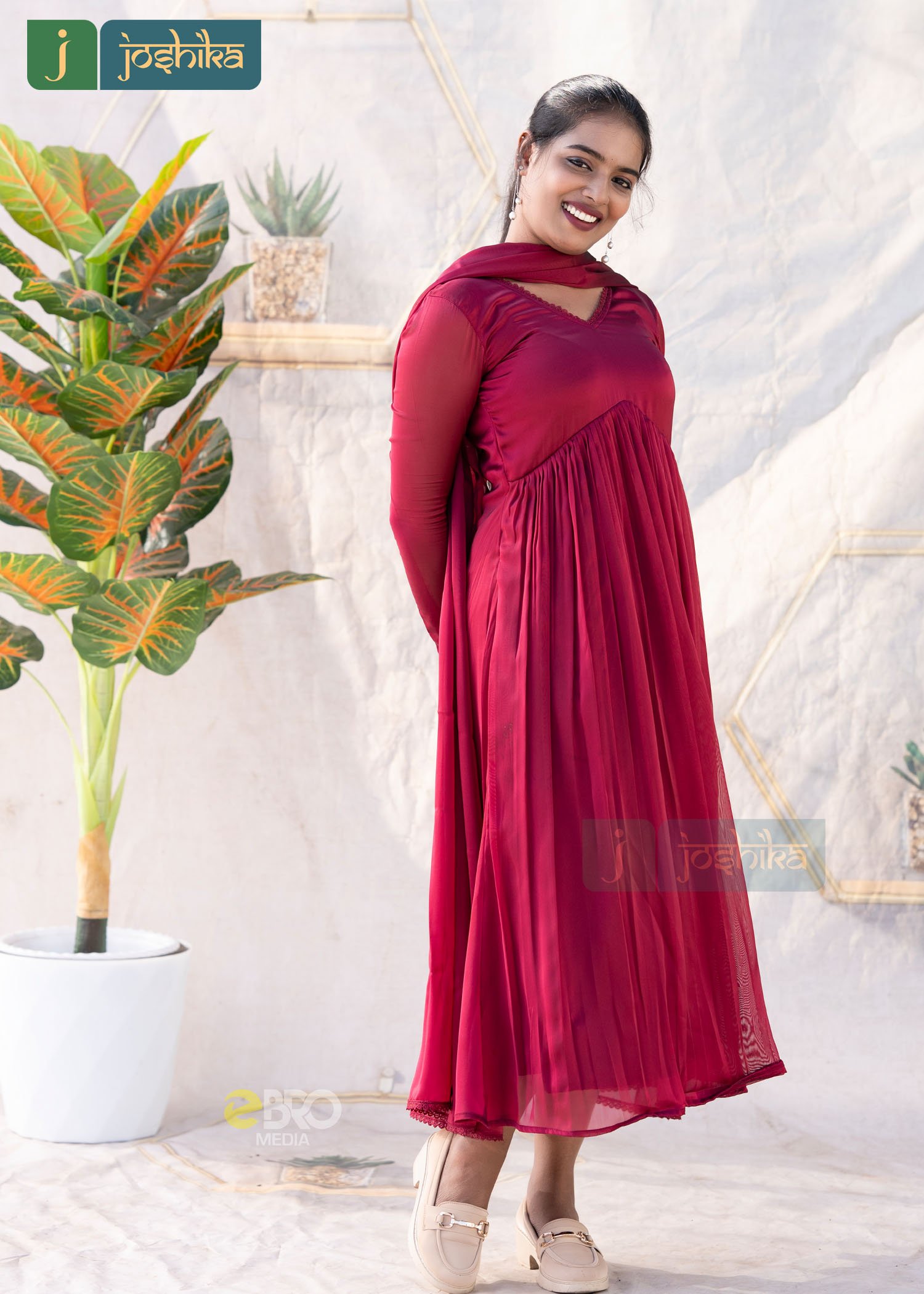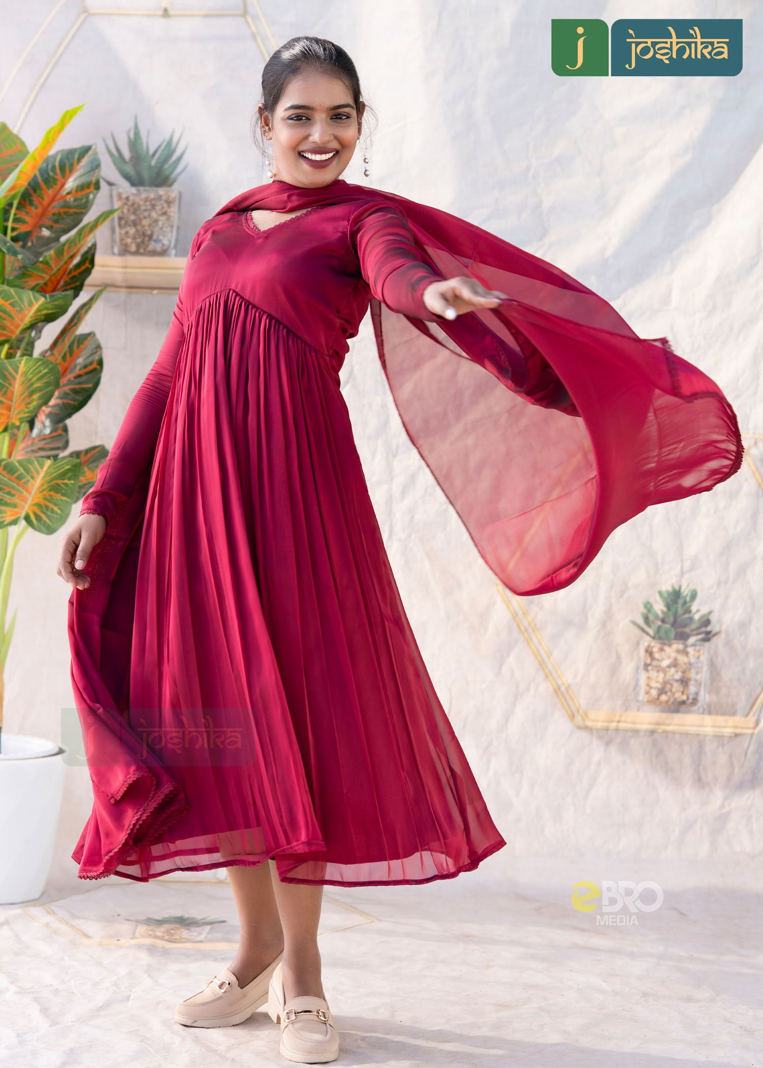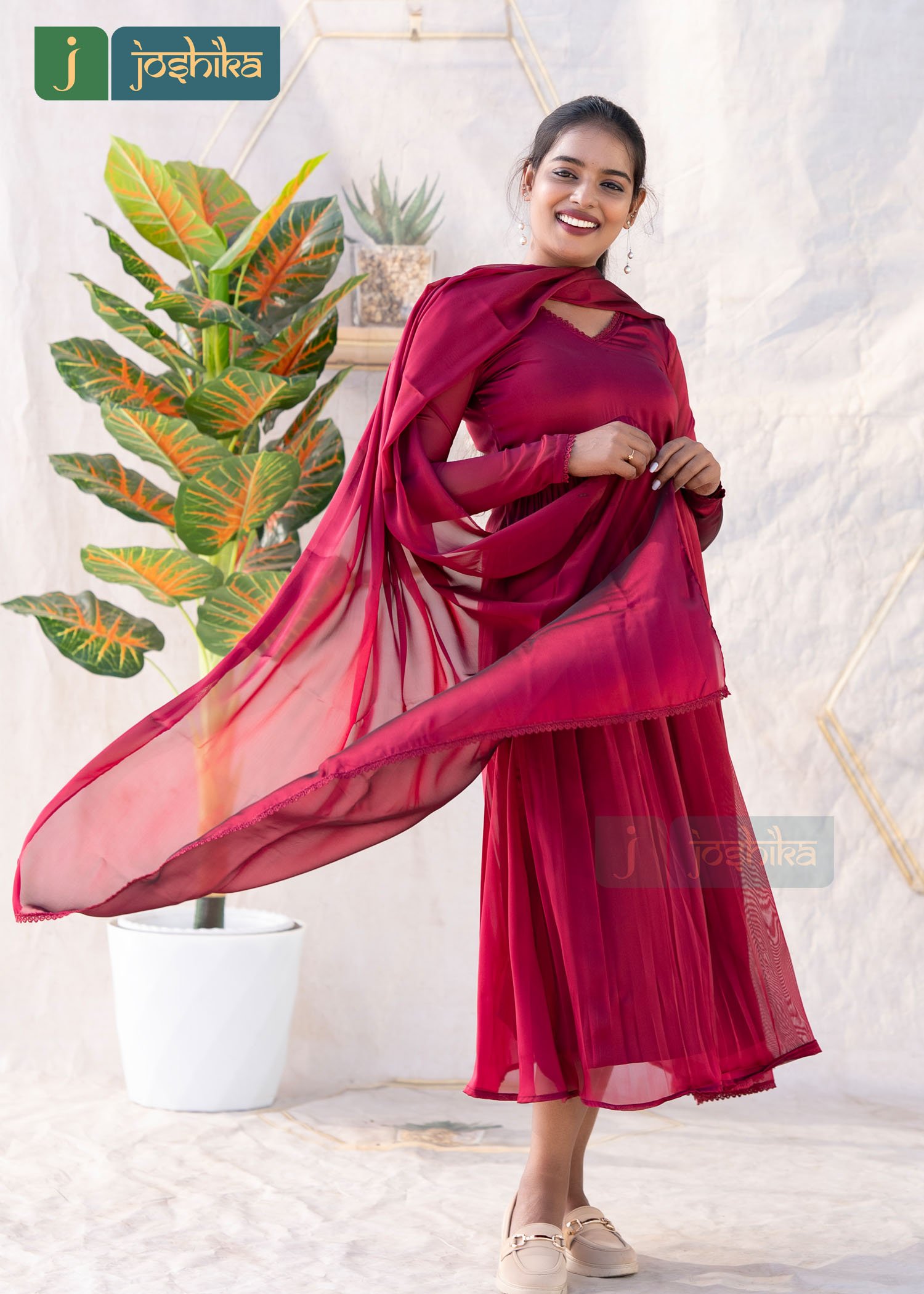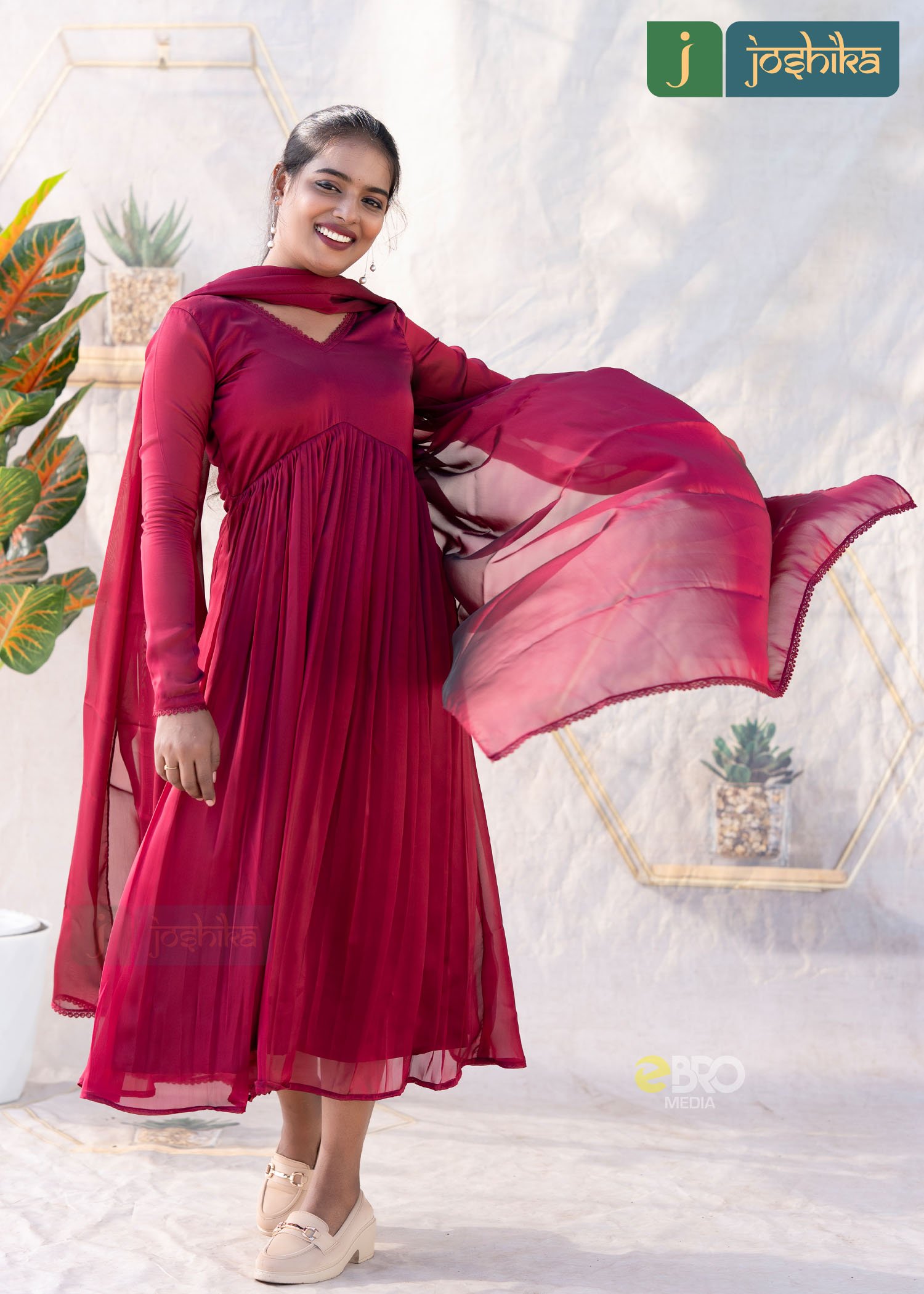 Embrace effortless elegance with this beautifully designed silky georgette A-line kurta, paired with a matching dupatta. Crafted in a rich, flowing fabric, the kurta features a flattering Aliya cut silhouette with soft pleats that create graceful movement and a refined look.