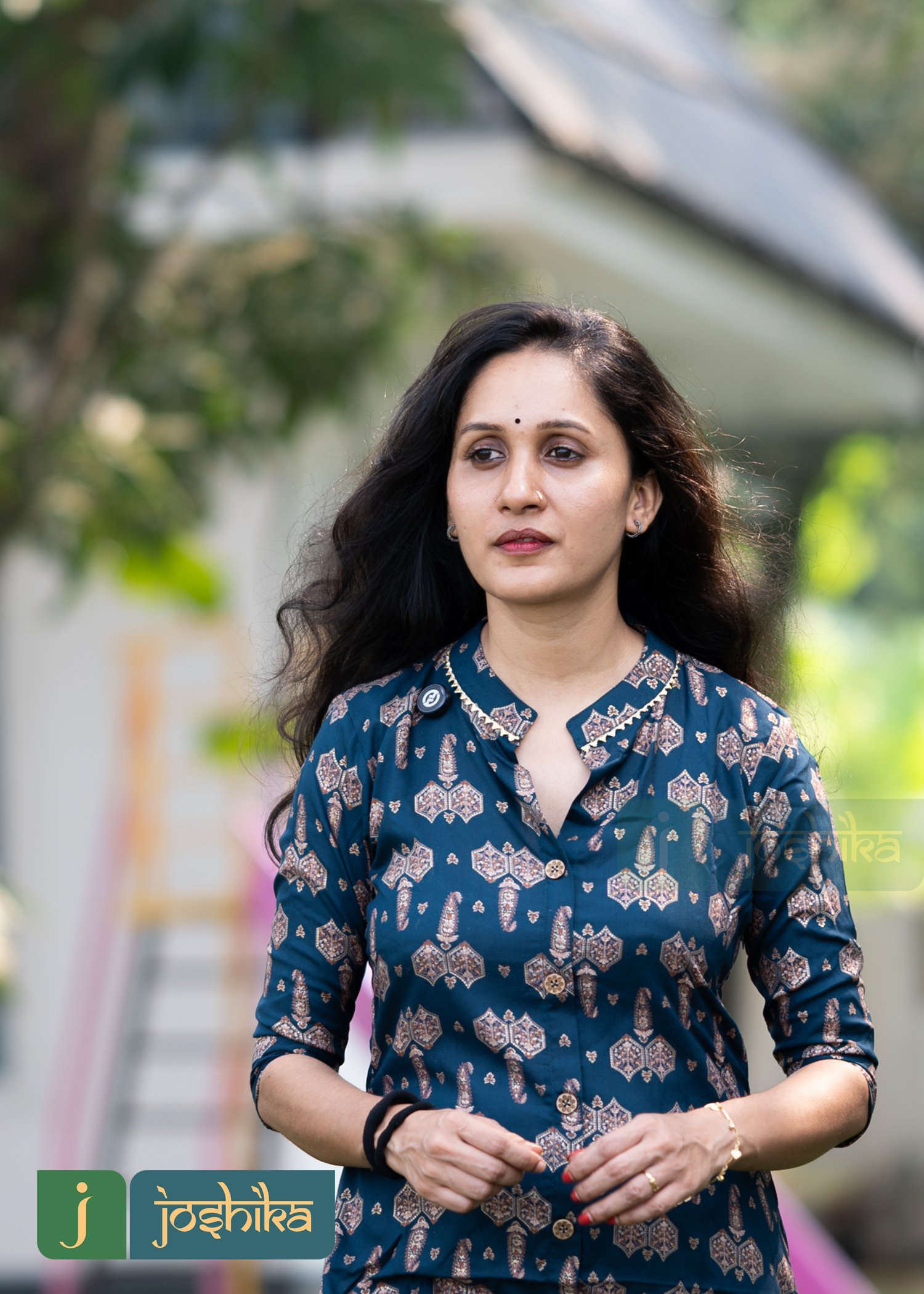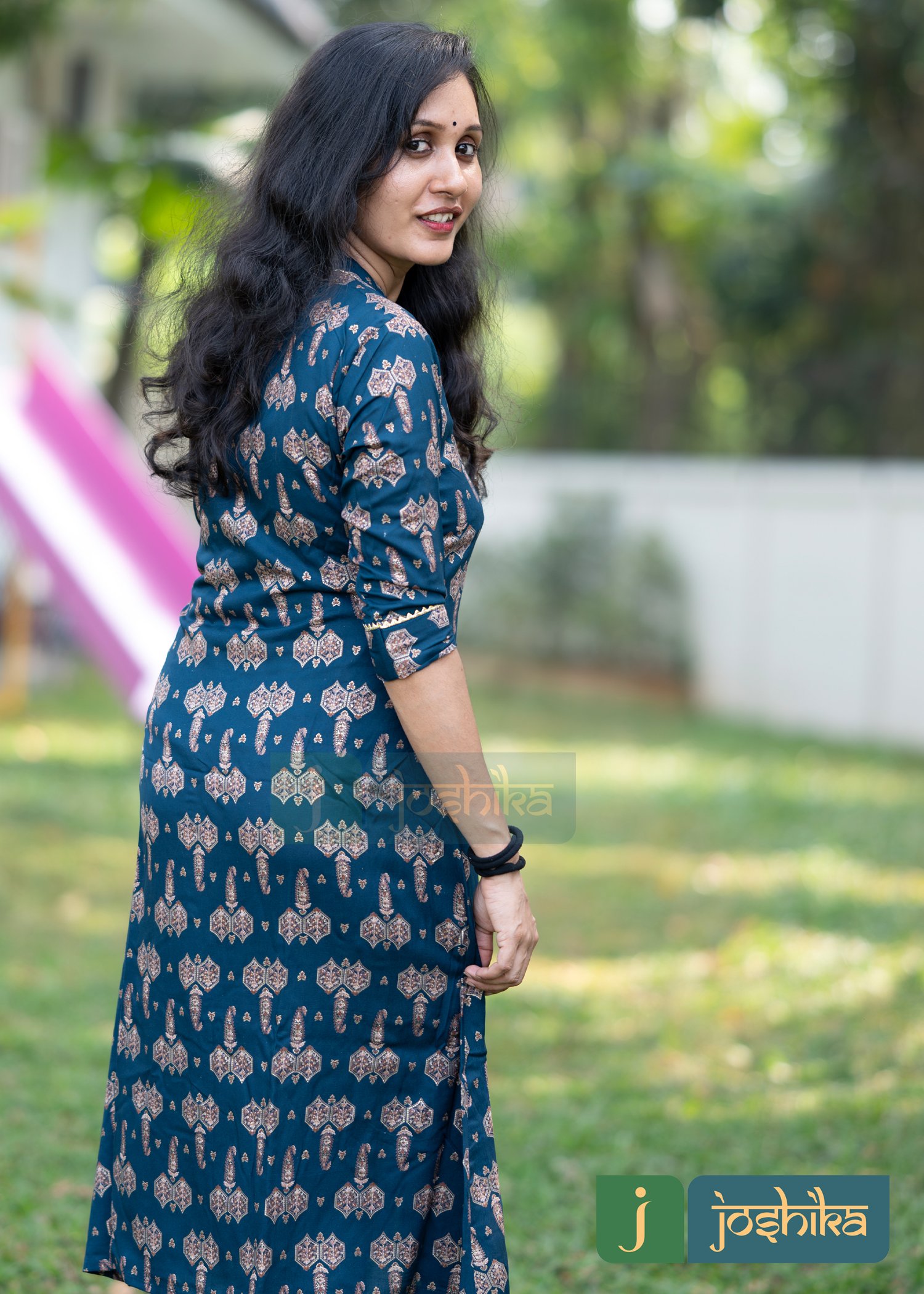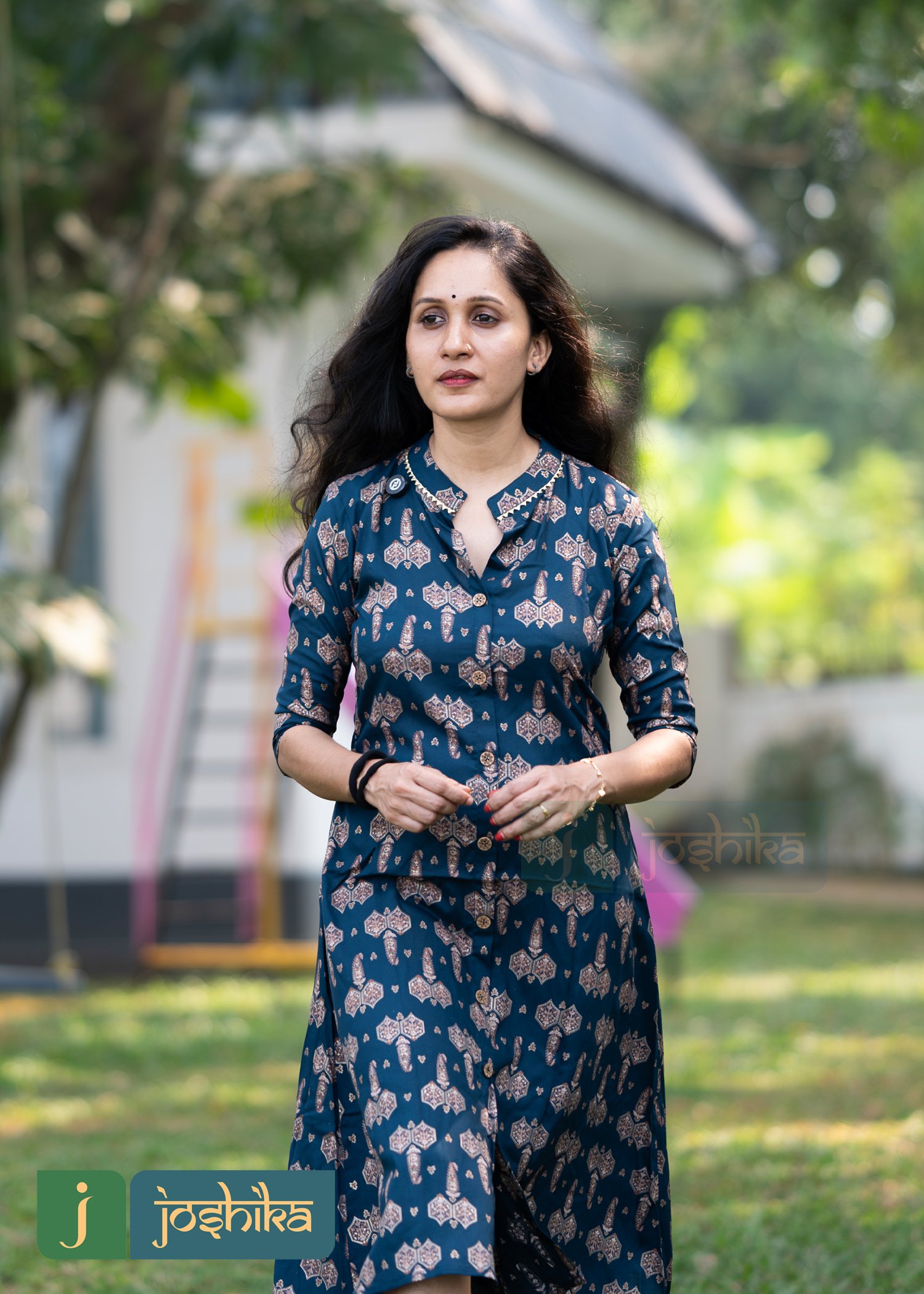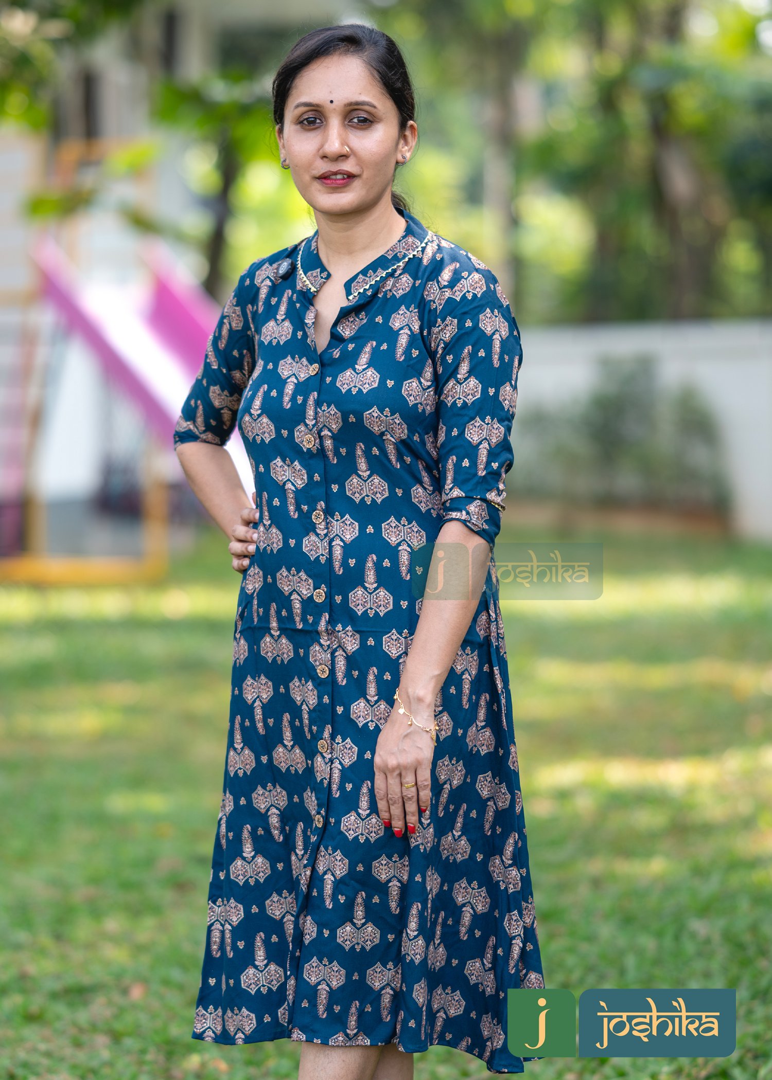Foil printed rayon kurta ,collar with golden lace, coconut shell buttons ,sleeves with border and lace.