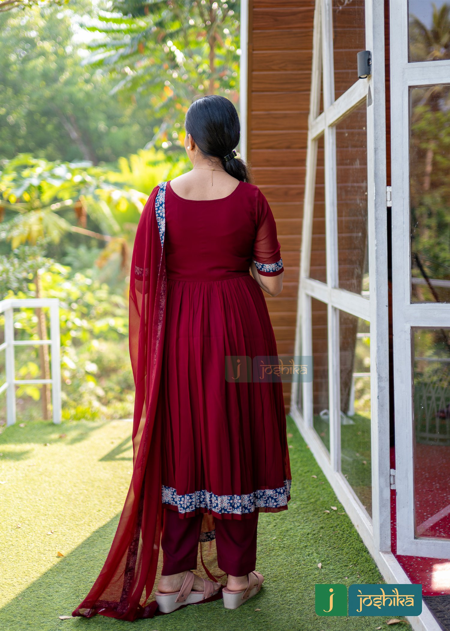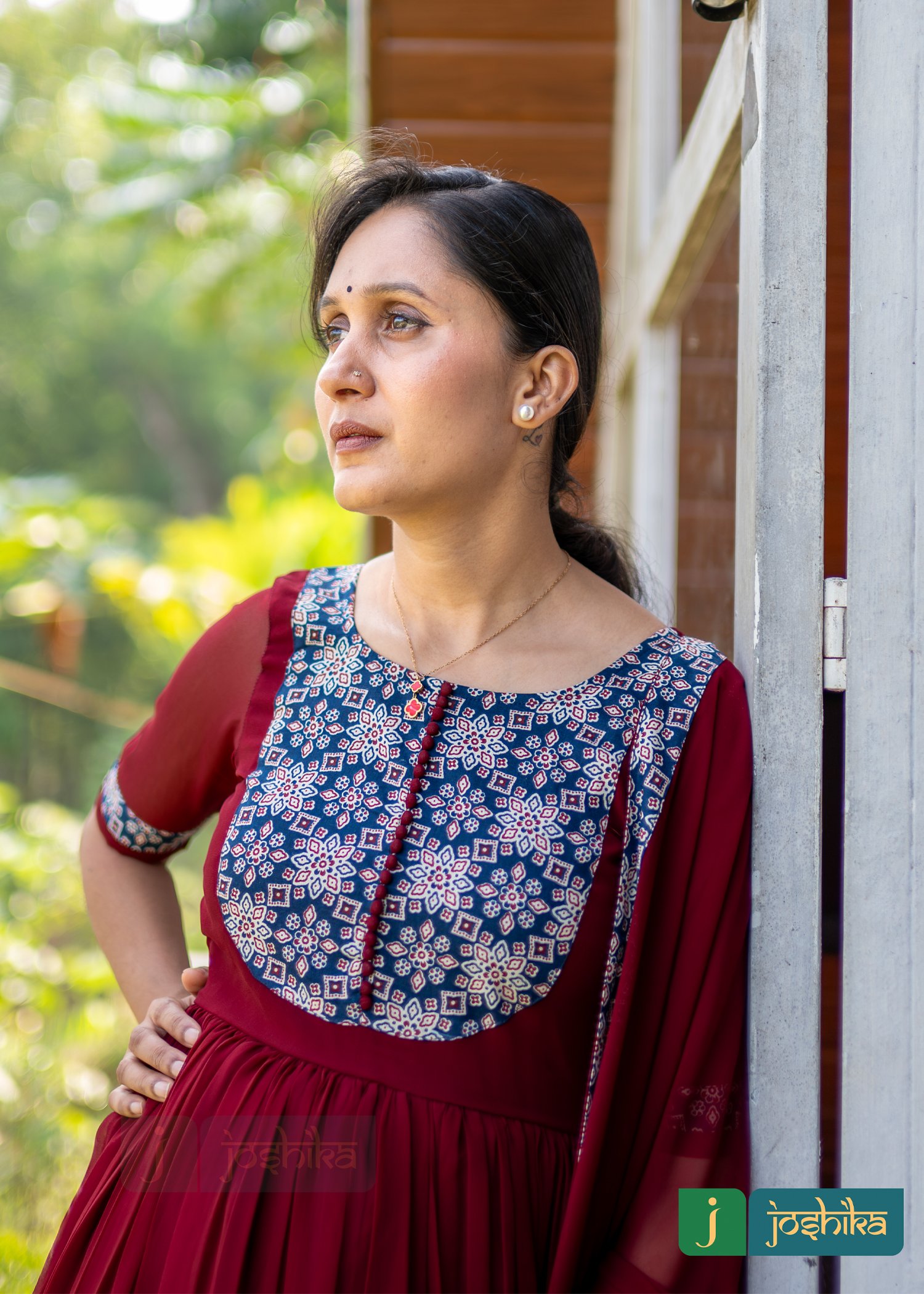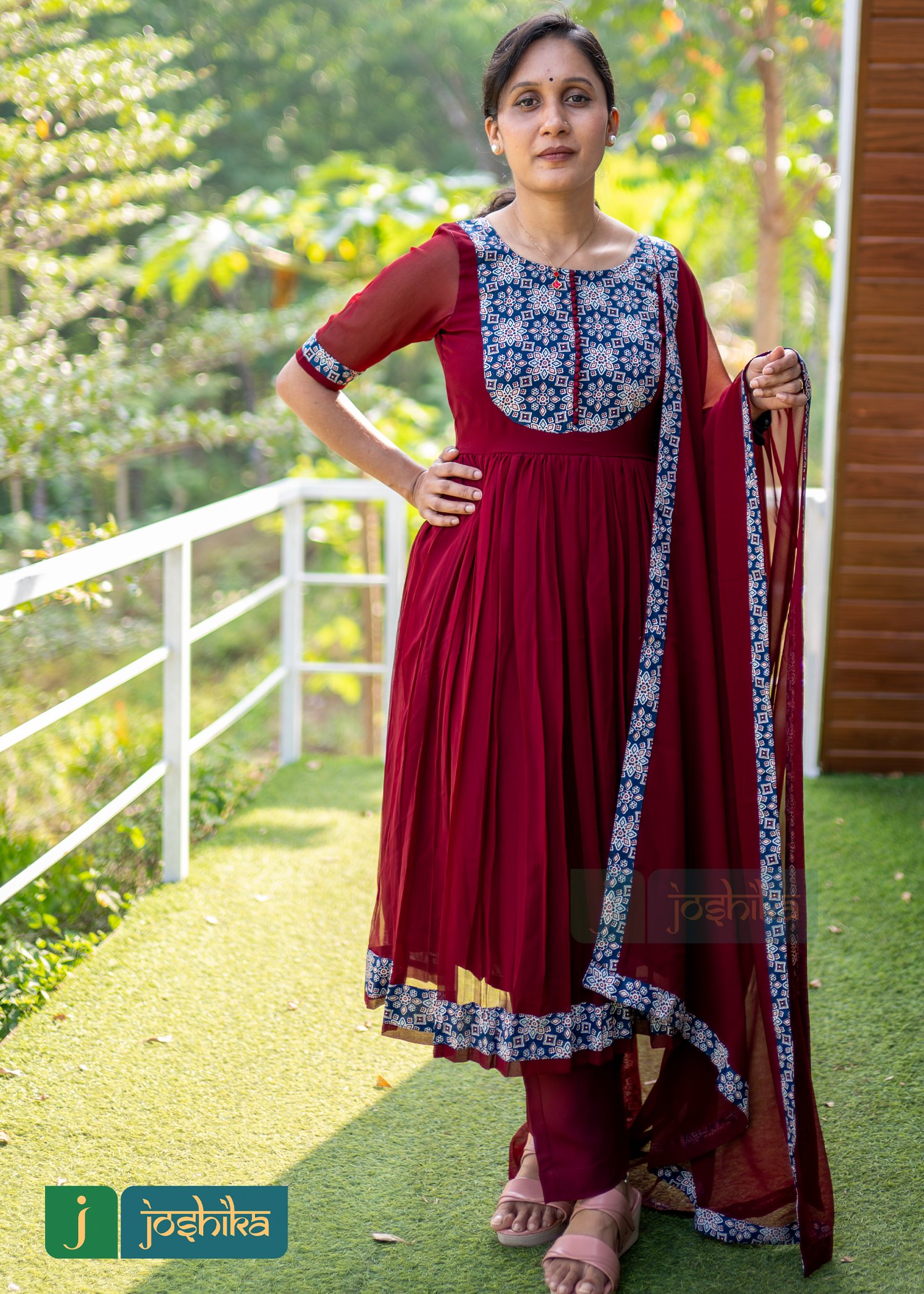 Gathered georgette kurta set with ajrakh printed yoke and ajrakh border, butter crape pencil bottom.