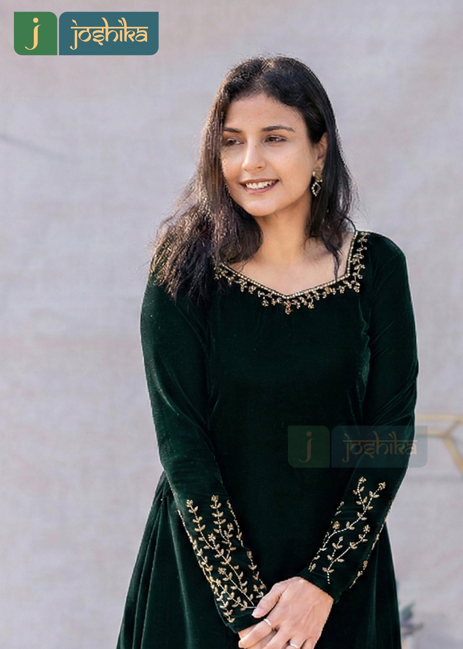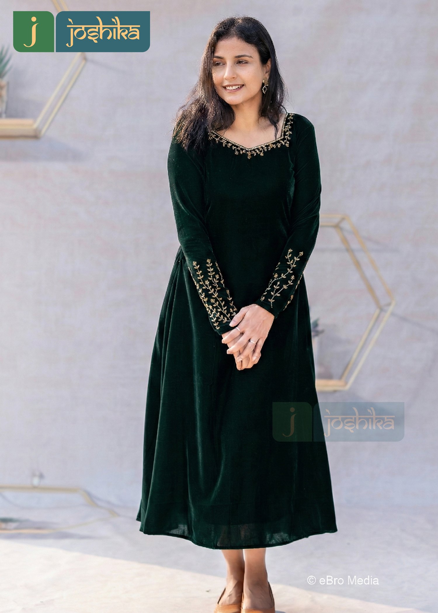 Elevate your festive wardrobe with this elegant green velvet A-line dress, designed to bring together comfort and timeless charm. Crafted in rich velvet, the dress features delicate hand embroidery along the neckline and sleeves, adding a refined touch of traditional artistry. The flattering A-line silhouette drapes beautifully, making it perfect for festive gatherings, evening celebrations, and special occasions.