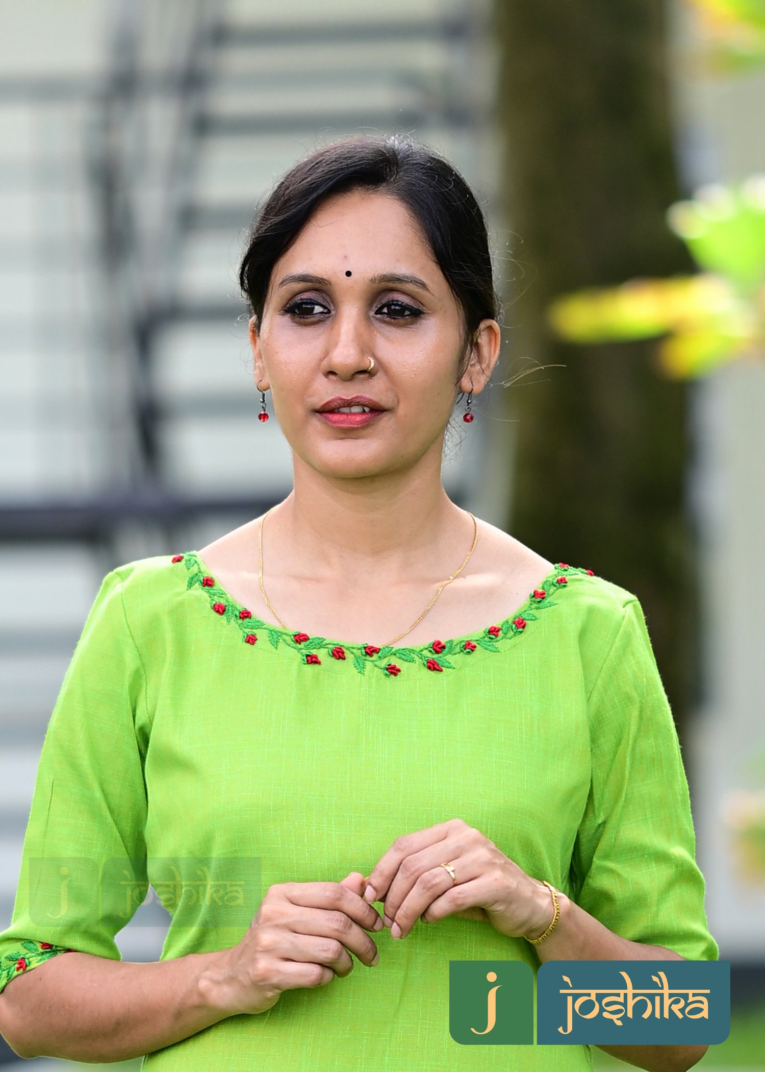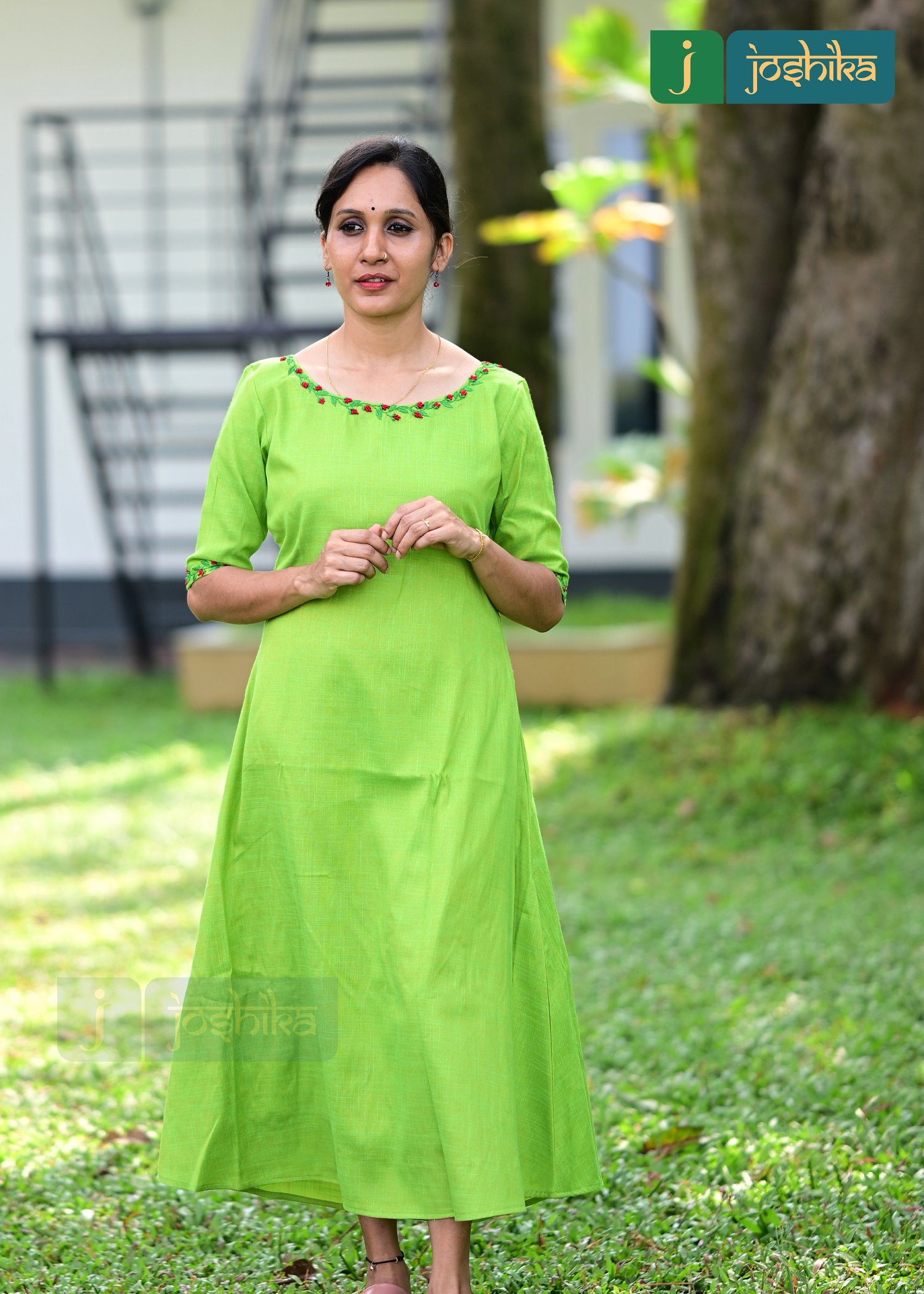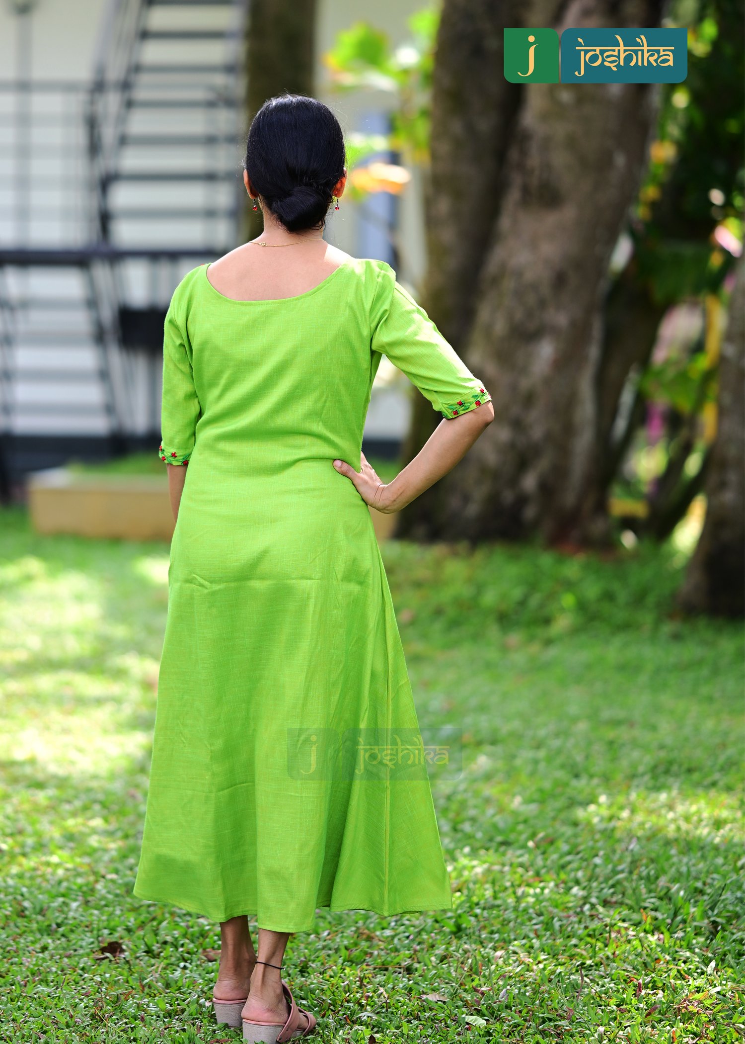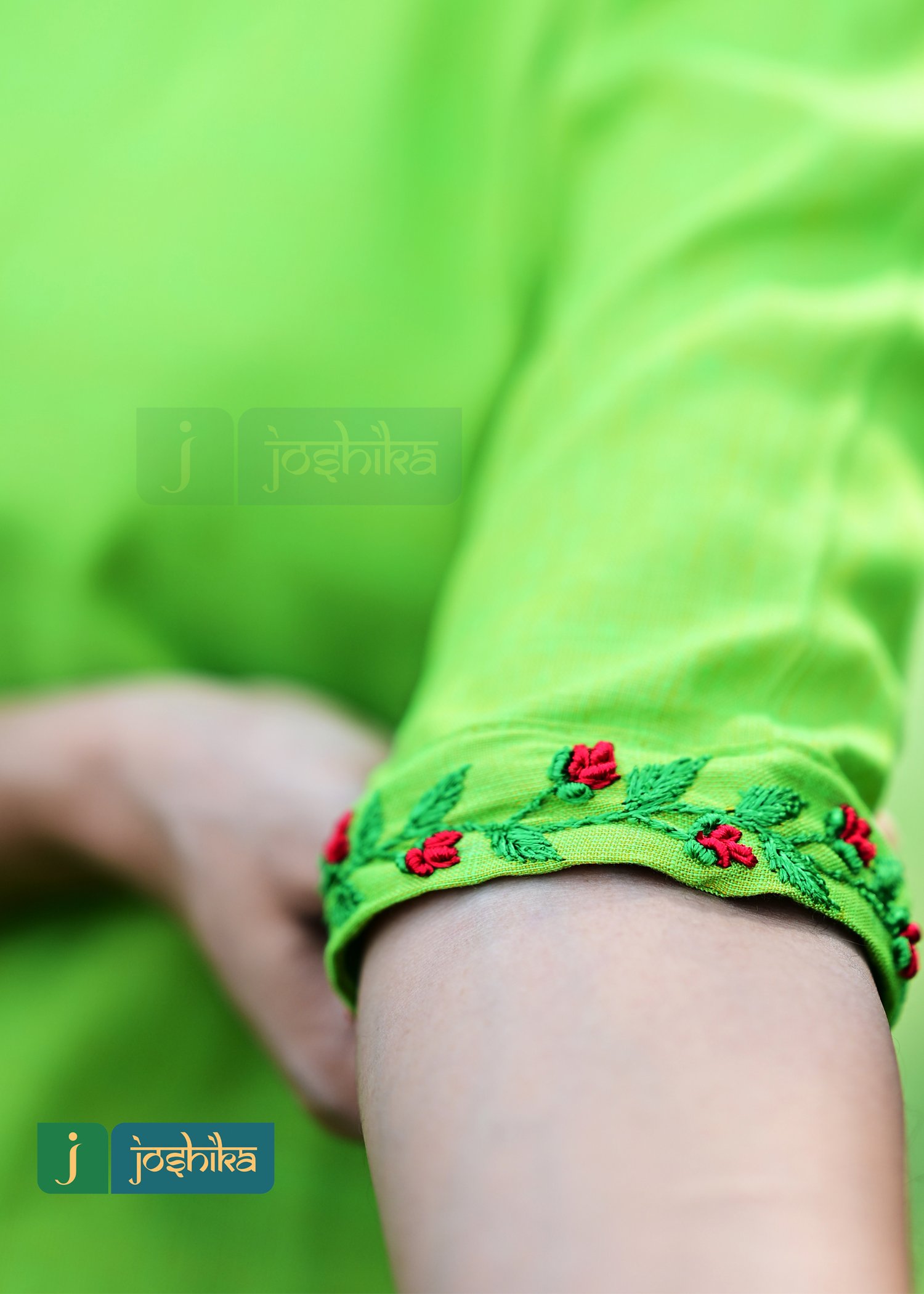 Hand embroidered Aline kurta, green and red combo thread work in neck and sleeves, boat neck .