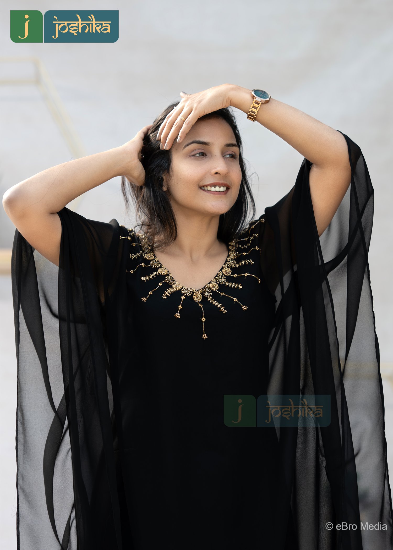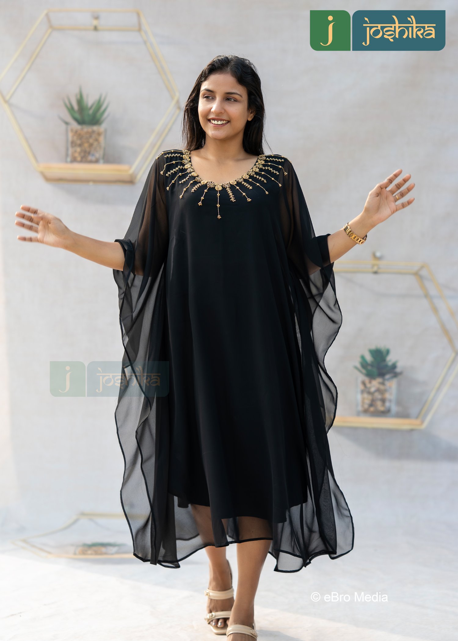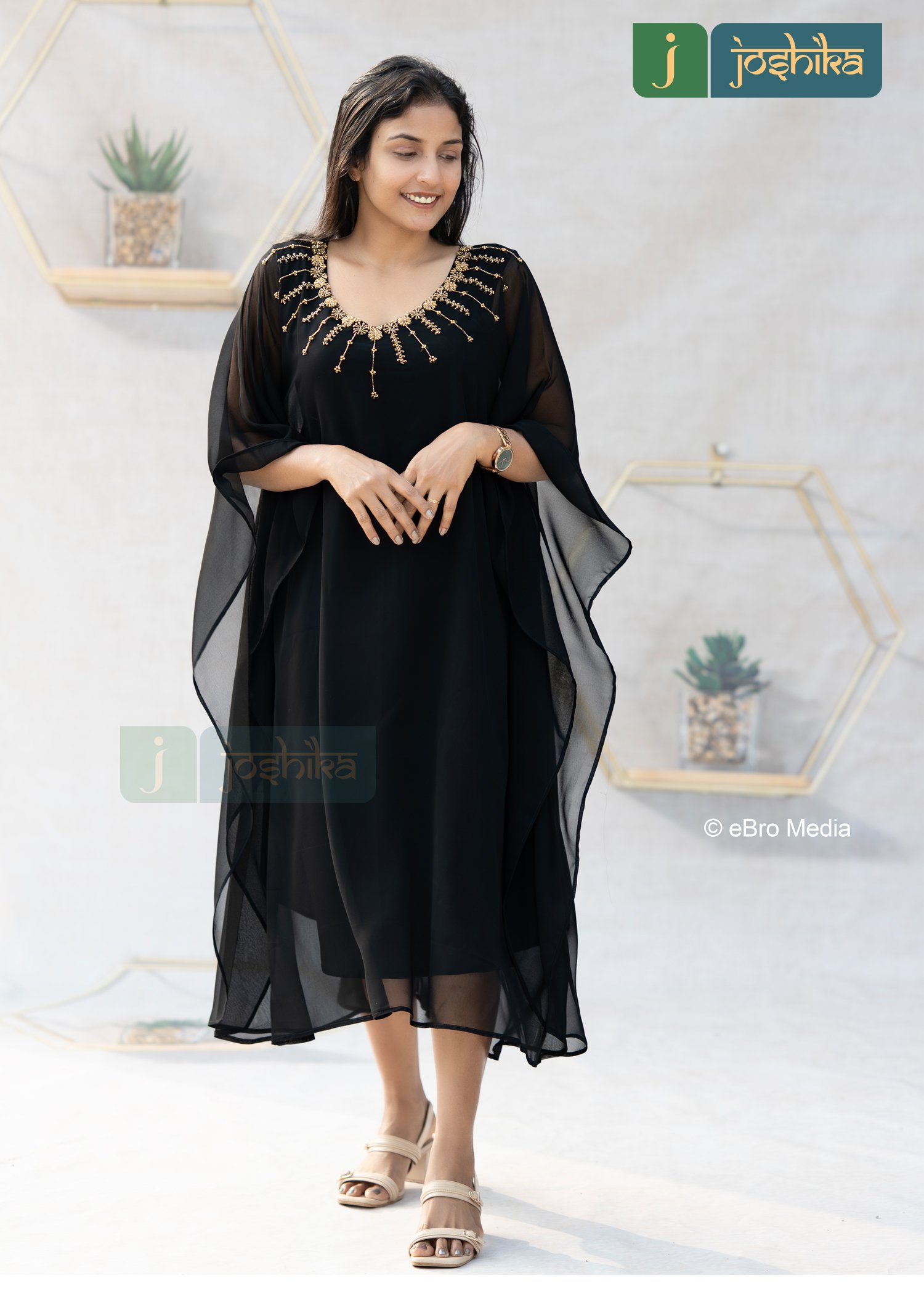 Hand embroidered georgette kaftan. Elevate your occasion wear with this luxurious georgette kaftan, designed to offer effortless elegance and comfort . Crafted from lightweight , flowy georgette , it features intricate hand embroidery around the neckline that adds a touch of refined glamour . The relaxed kaftan silhouette drapes beautifully , making it ideal for festive evening, celebrations, or elegant resort wear . style it with minimal accessories for a graceful, statement look.