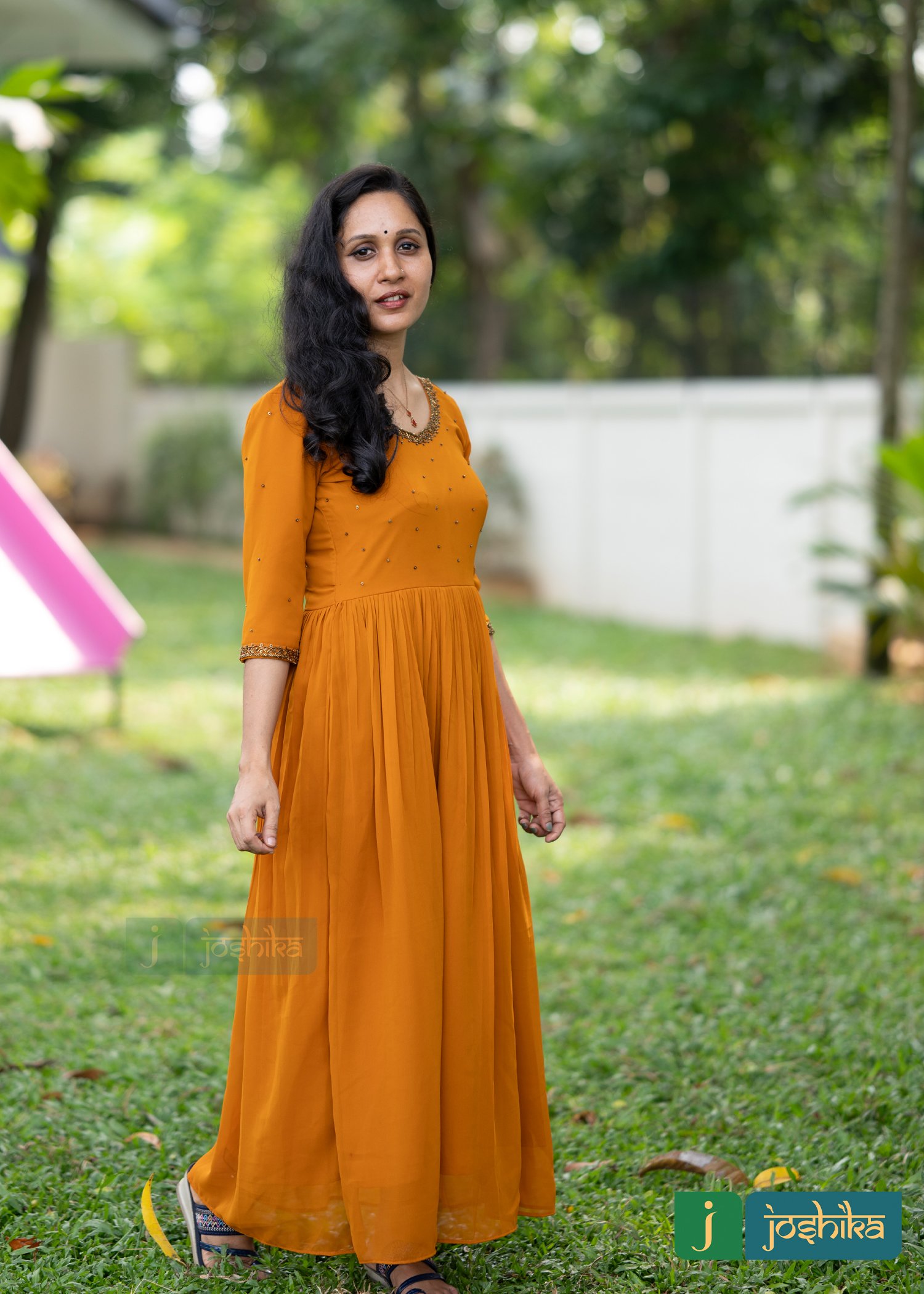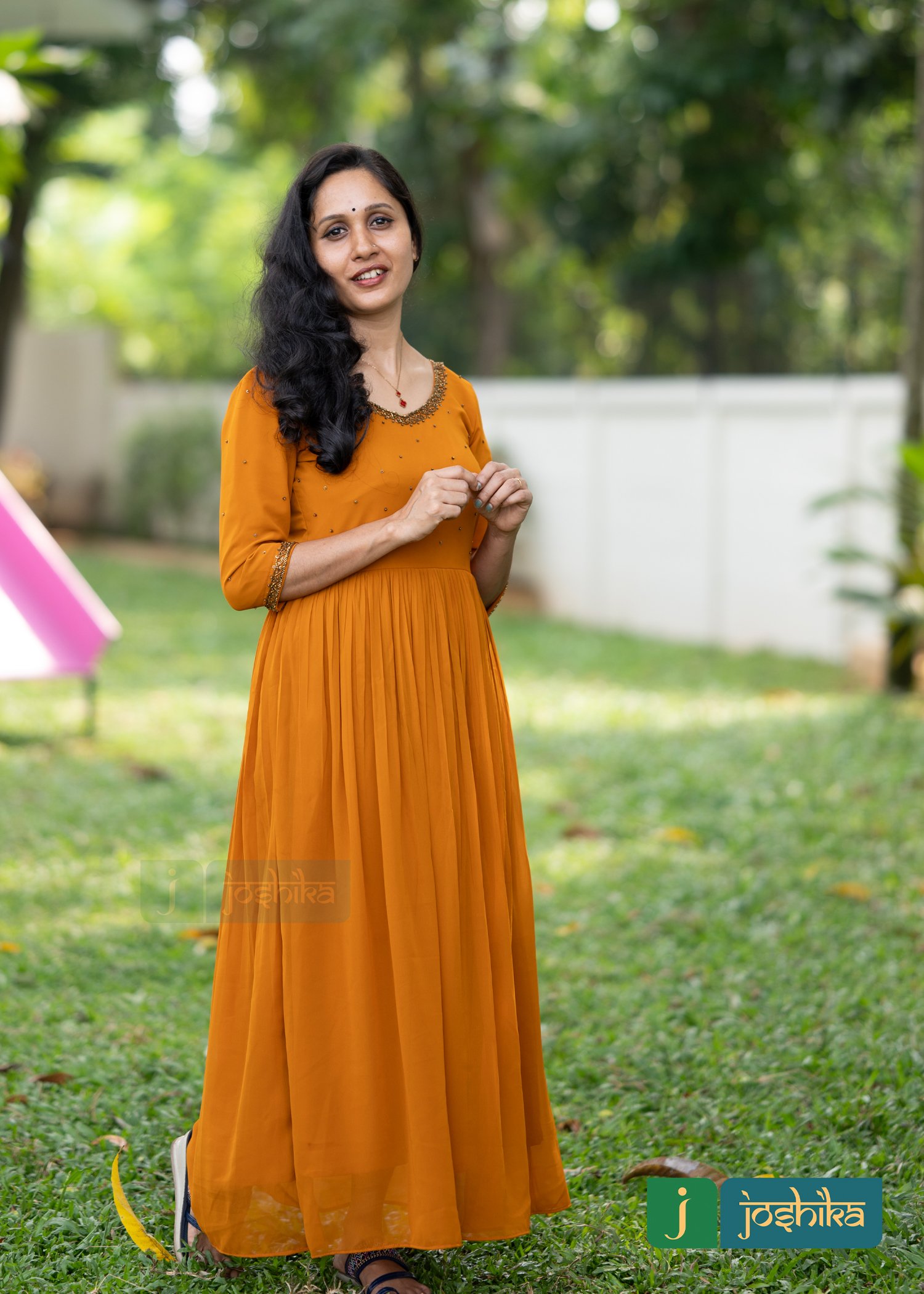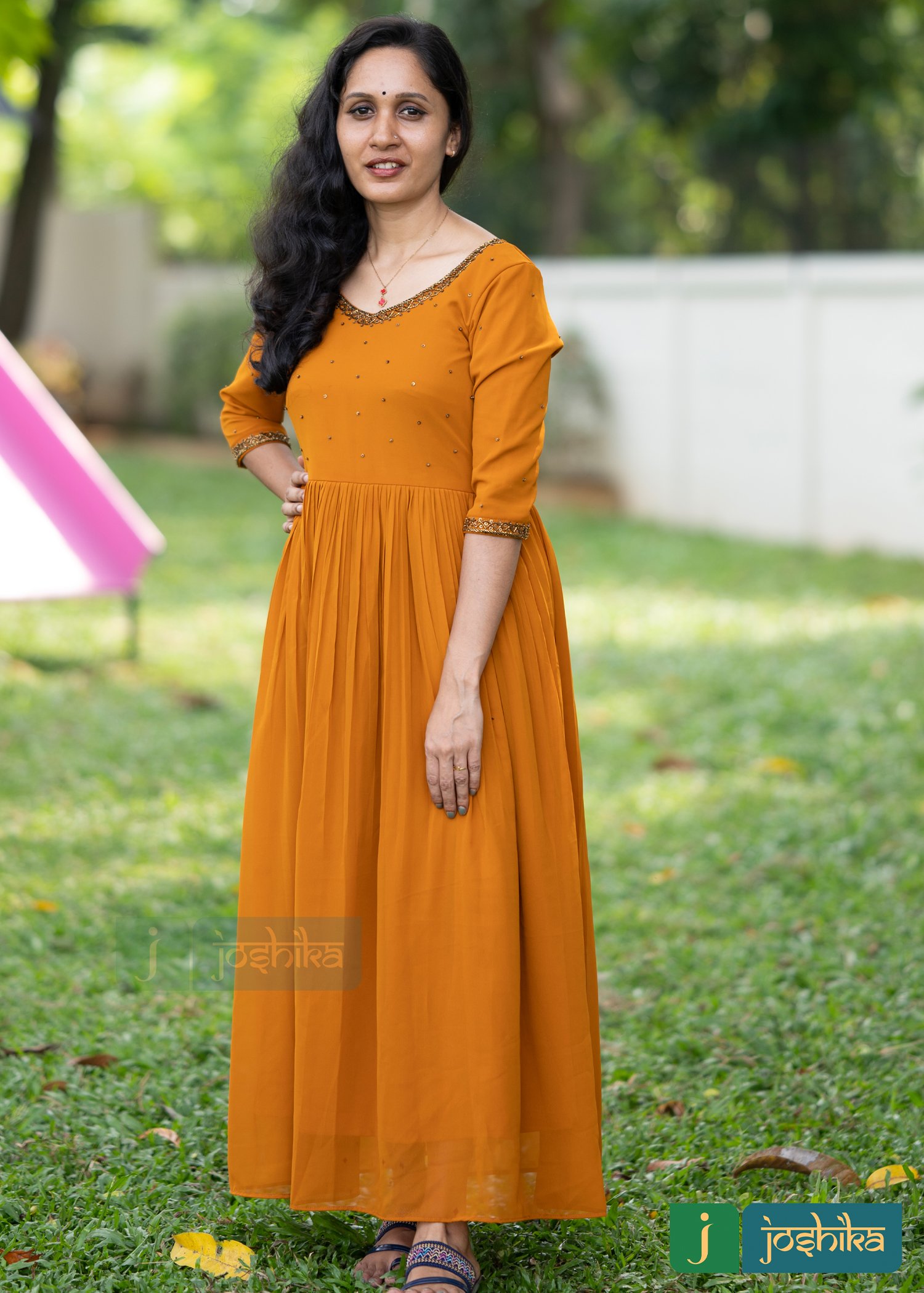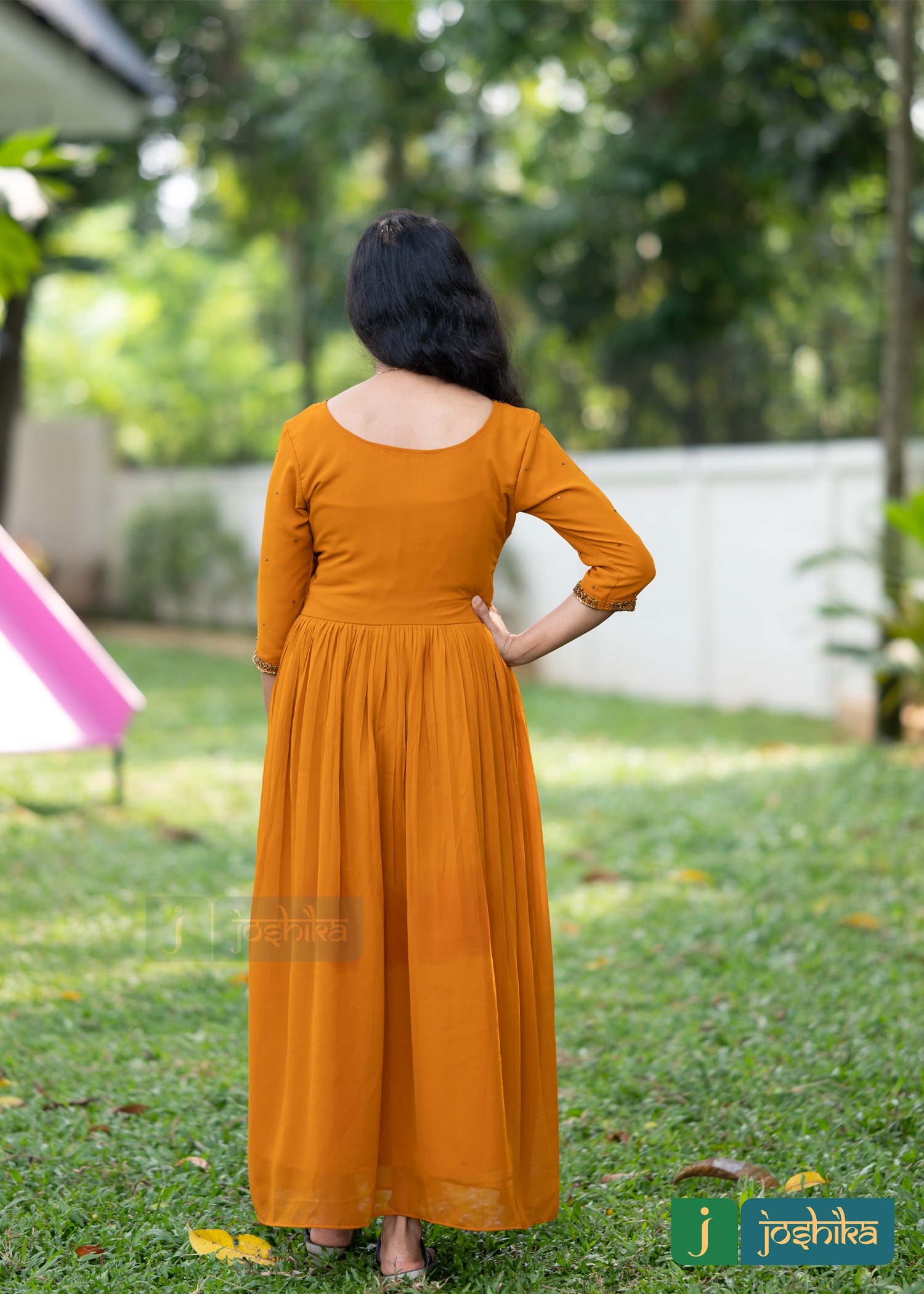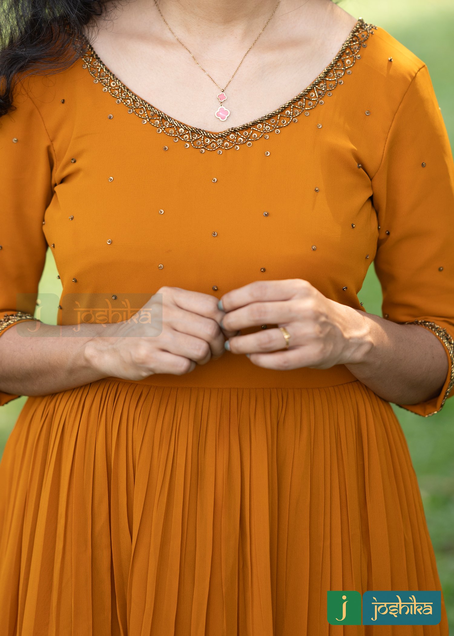 Hand embroidered pleated georgette kurta, Antique color beads and sequences are used for embroidery work.