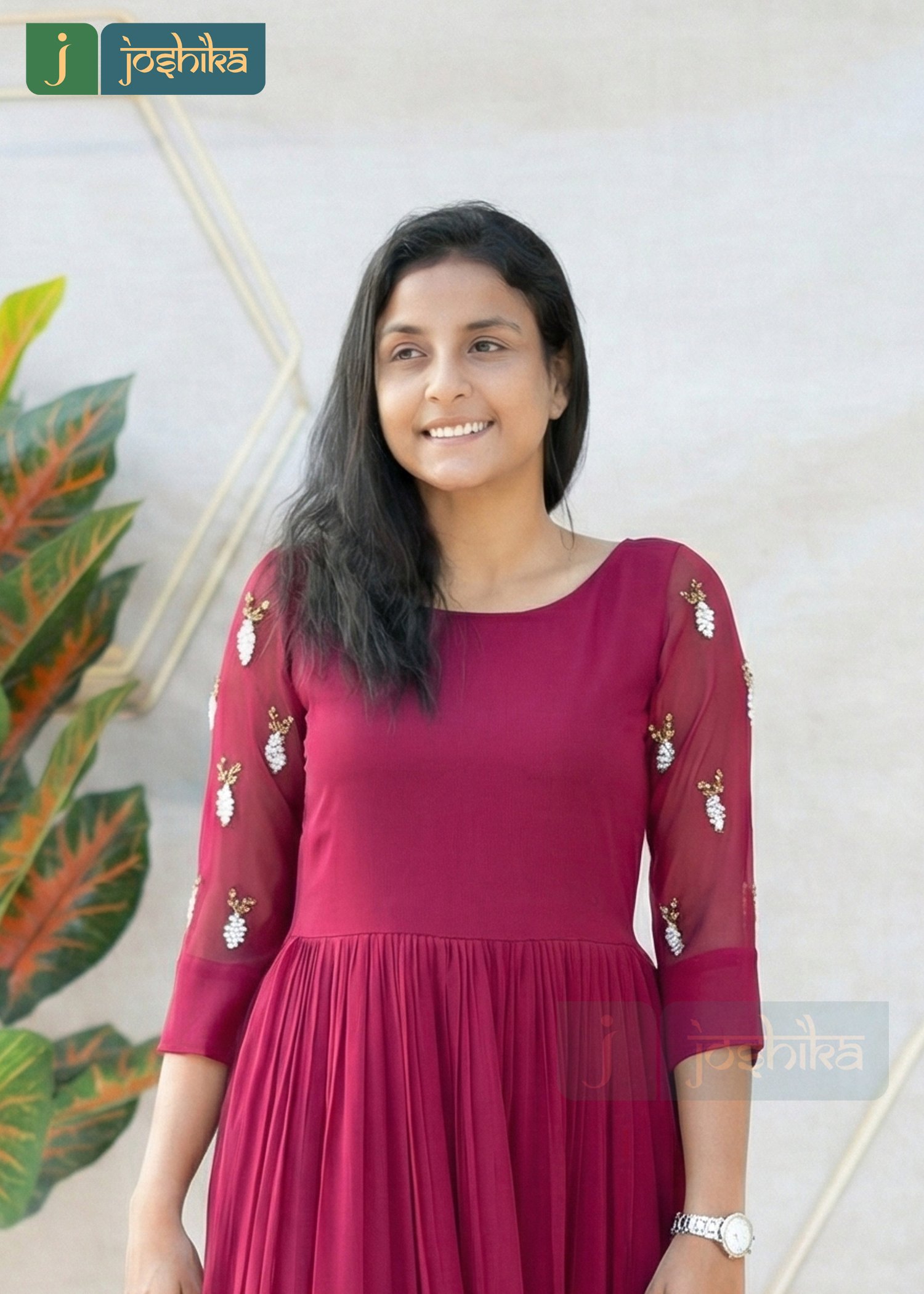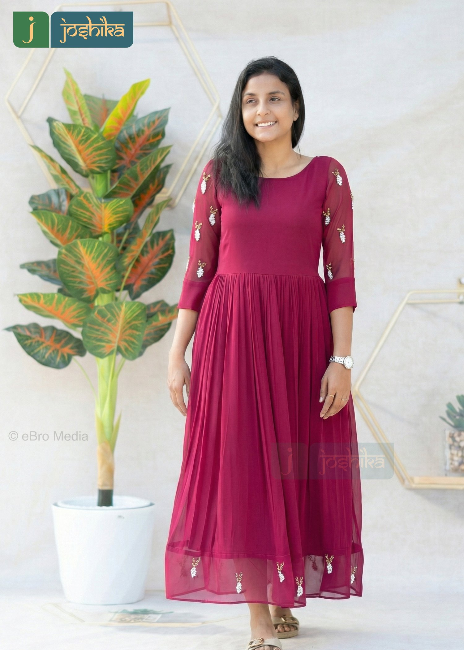 Crafted from flowy georgette fabric, this rani pink pleated kurta features delicate hand embroidery on sheer sleeves and subtle motifs along the hem. The softly flared silhouette offers graceful movement while maintaining all-day comfort. Elegant yet versatile, this kurta is perfect for festive occasions, evening gatherings, and refined everyday wear.