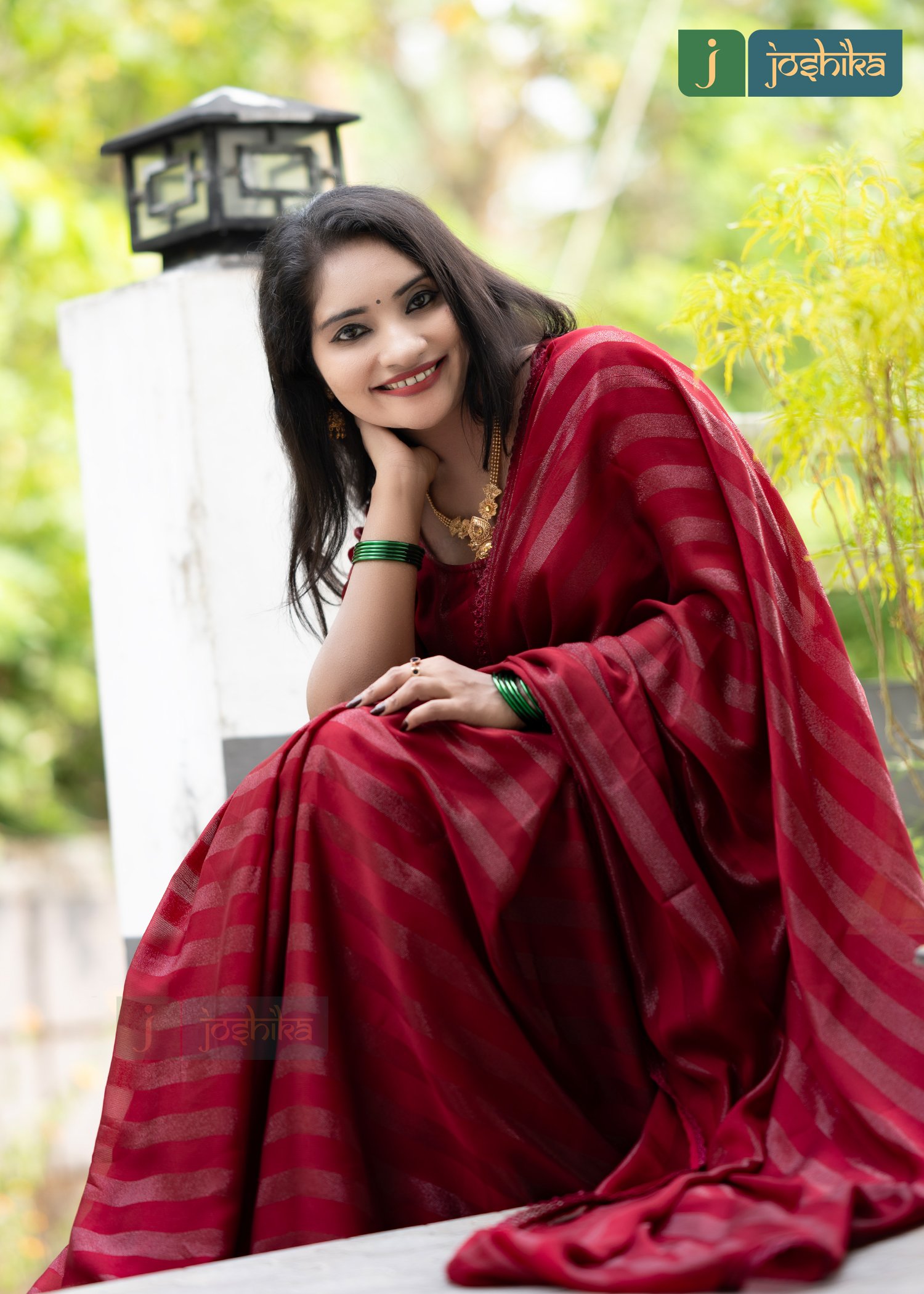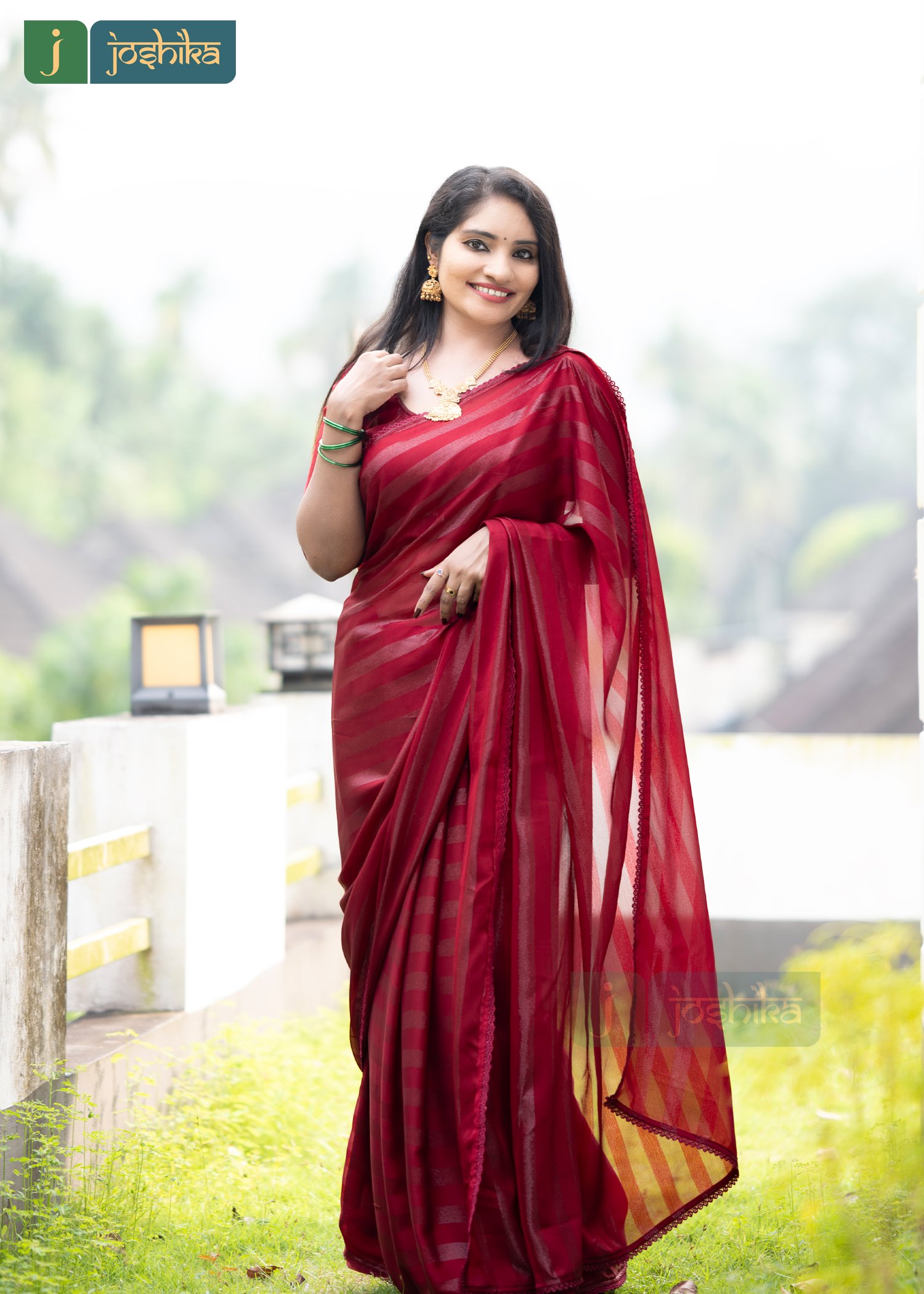 Elegant maroon georgette saree with subtle silver striped patterns and delicate lace border, perfect for festive occasions, weddings, or any special events.