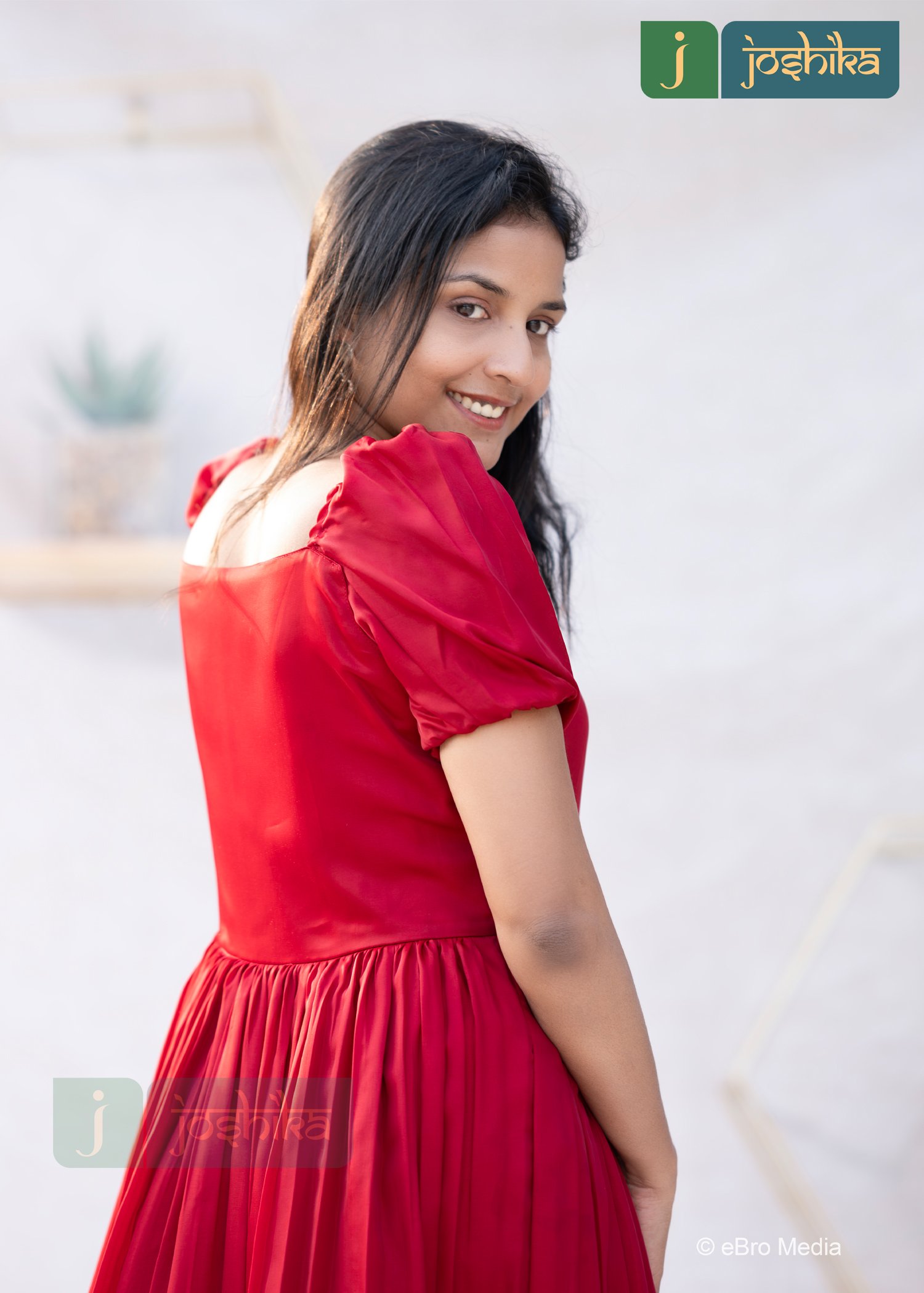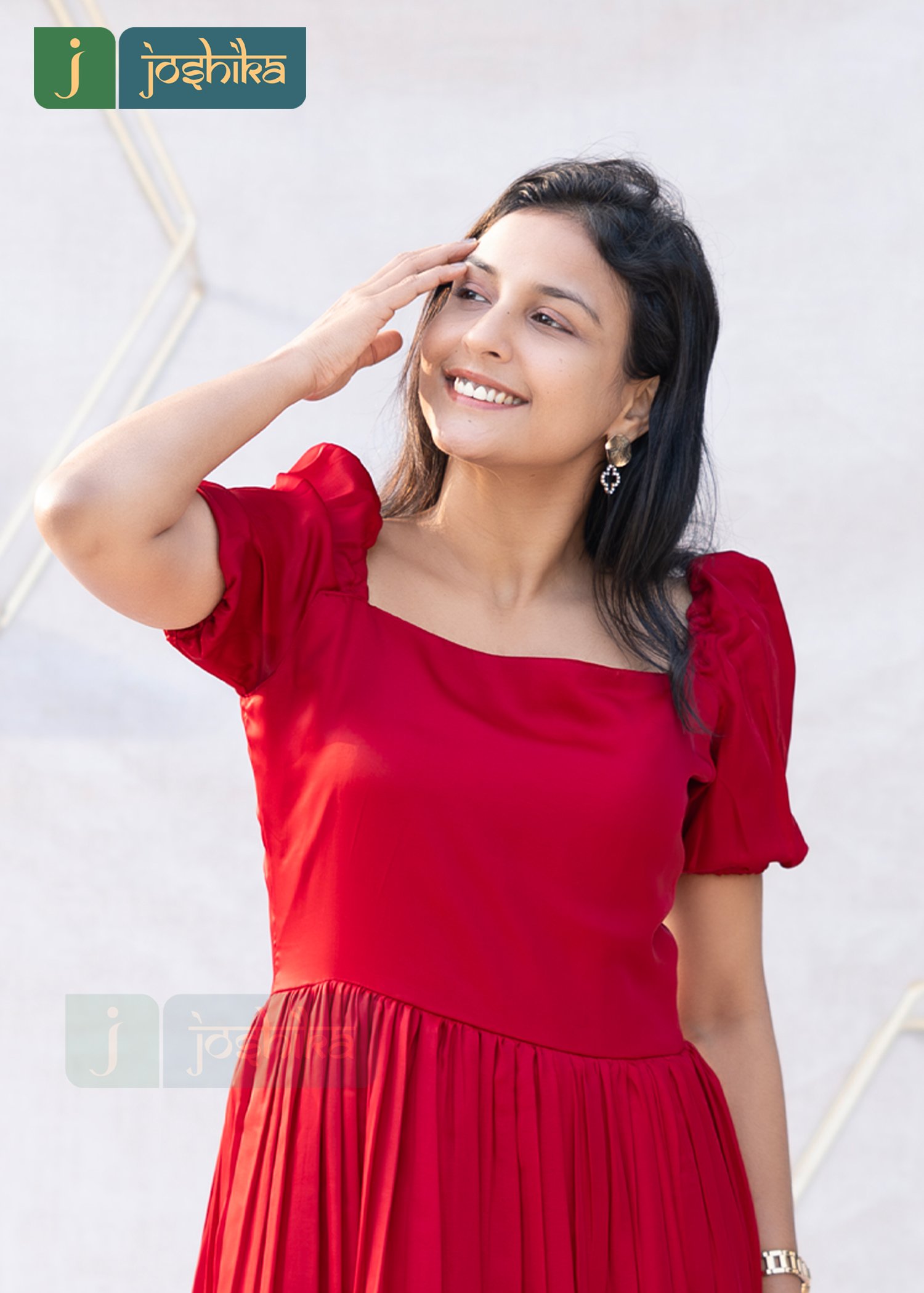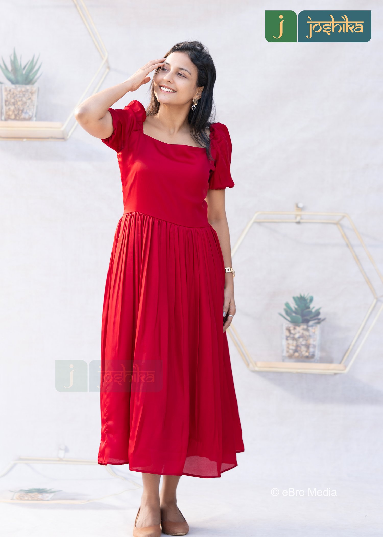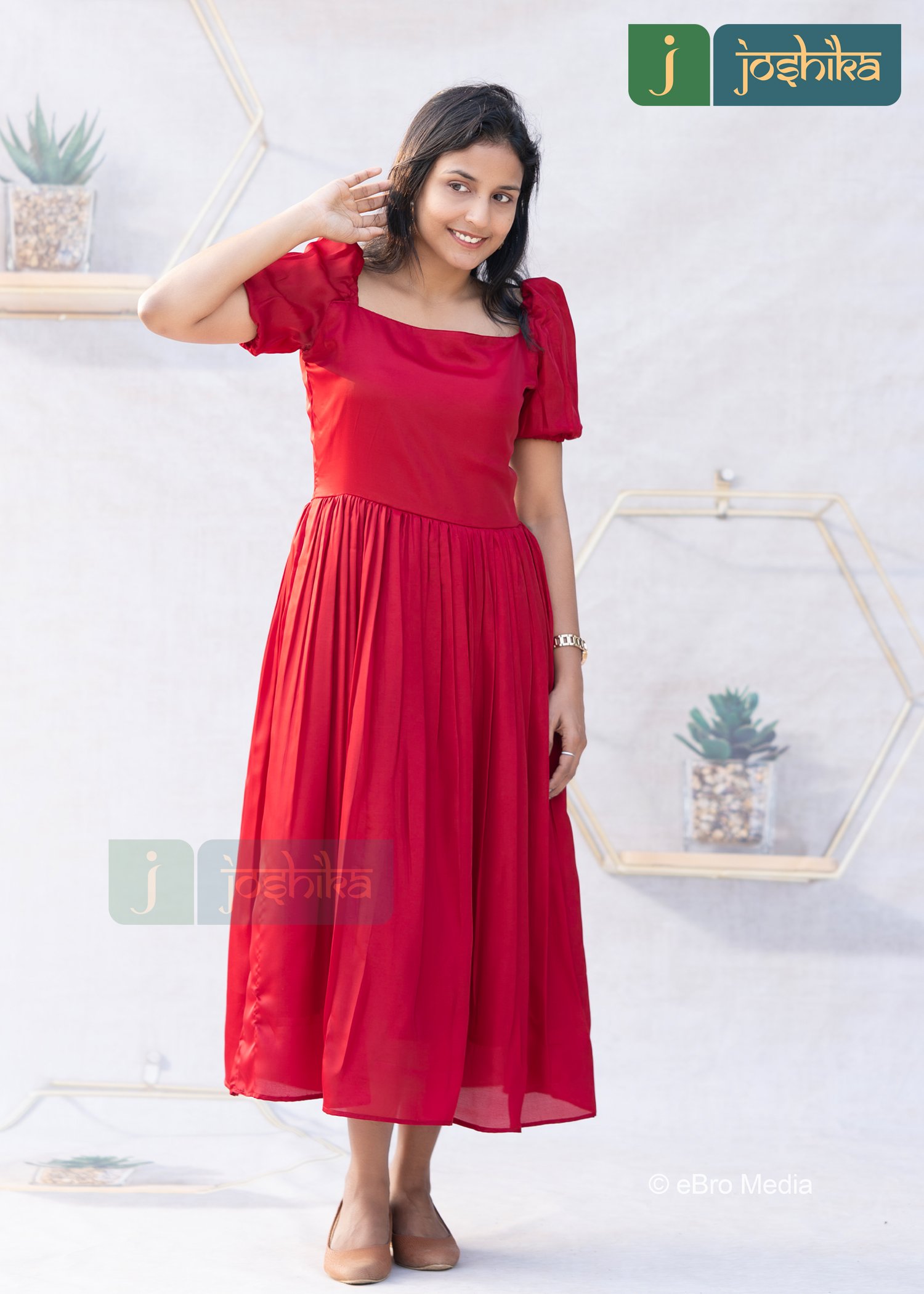 Graceful and effortlessly elegant, this maroon red frock is designed to flatter with its soft gathers and flowy silhouette .Crafted in a lightweight fabric, it features elasticated short sleeves for a comfortable yet feminine fit. The gathered skirt adds beautiful movement, making it perfect for both casual outings and special occasions. Pair it with flats for a relaxed day look or dress it up with heels for evening charm.