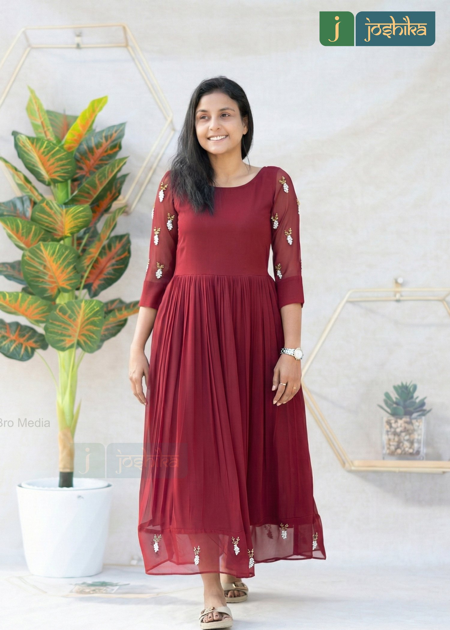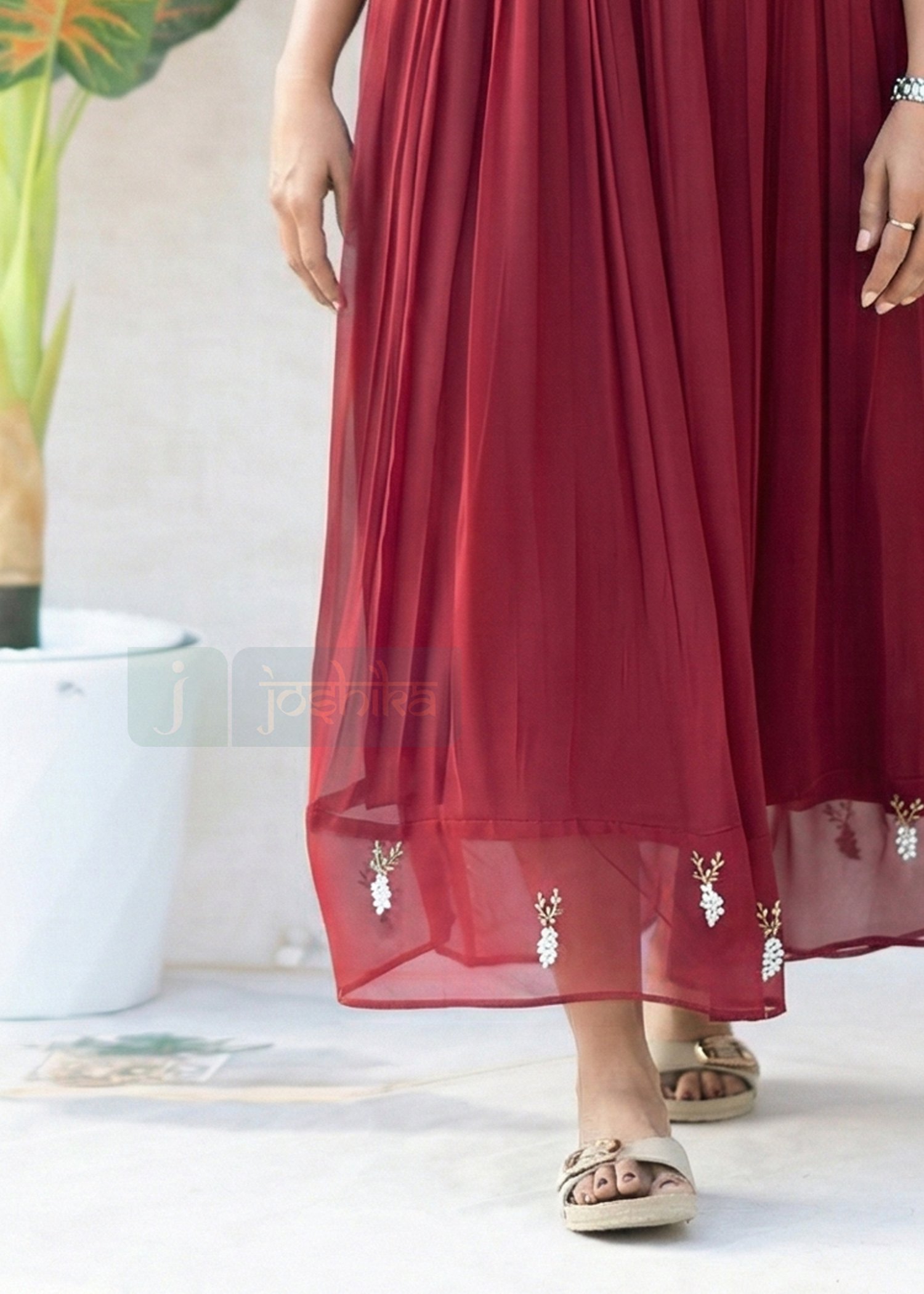 Crafted from flowy georgette fabric, this maroon red pleated kurta features delicate hand embroidery on sheer sleeves and subtle motifs along the hem. The softly flared silhouette offers graceful movement while maintaining all-day comfort. Elegant yet versatile, this kurta is perfect for festive occasions, evening gatherings, and refined everyday wear.