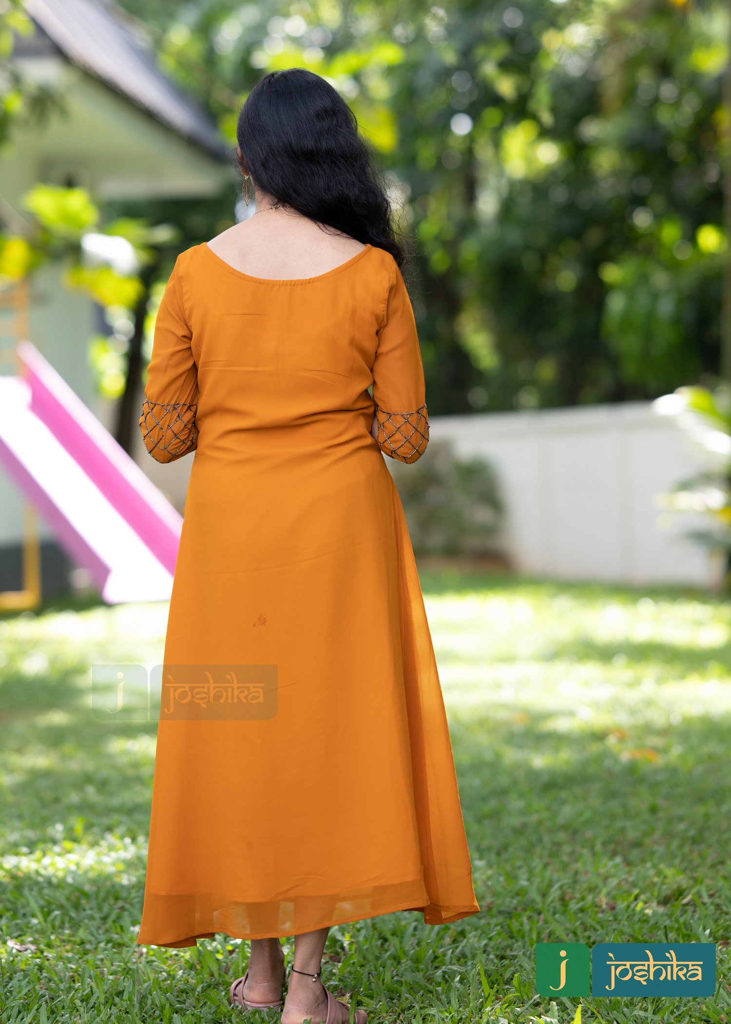 Mustard yellow Aline kurta with hand embroidery, sleeves are beads work, balls design in yoke.
