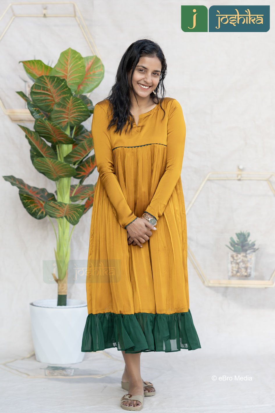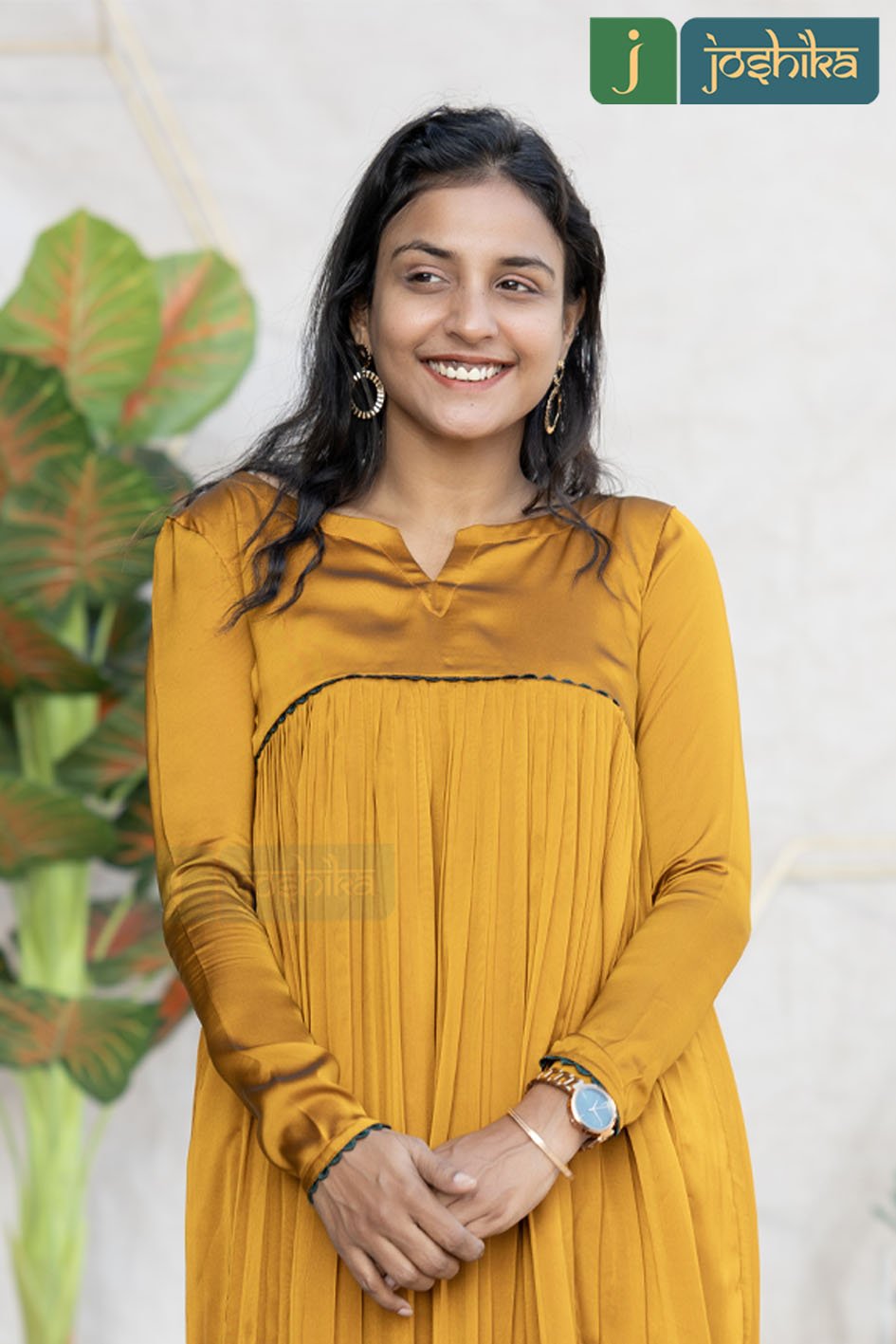 Elegant & eye-catching, this mustard yellow dress is crafted from silky georgette fabric for a soft, flowing look. Featuring delicate pleats with subtle lace detailing & contrasting green pleats at the hem, it adds a unique stylish touch. Lightweight & comfortable, it’s perfect for casual outings, festive occasions, or graceful everyday wear.