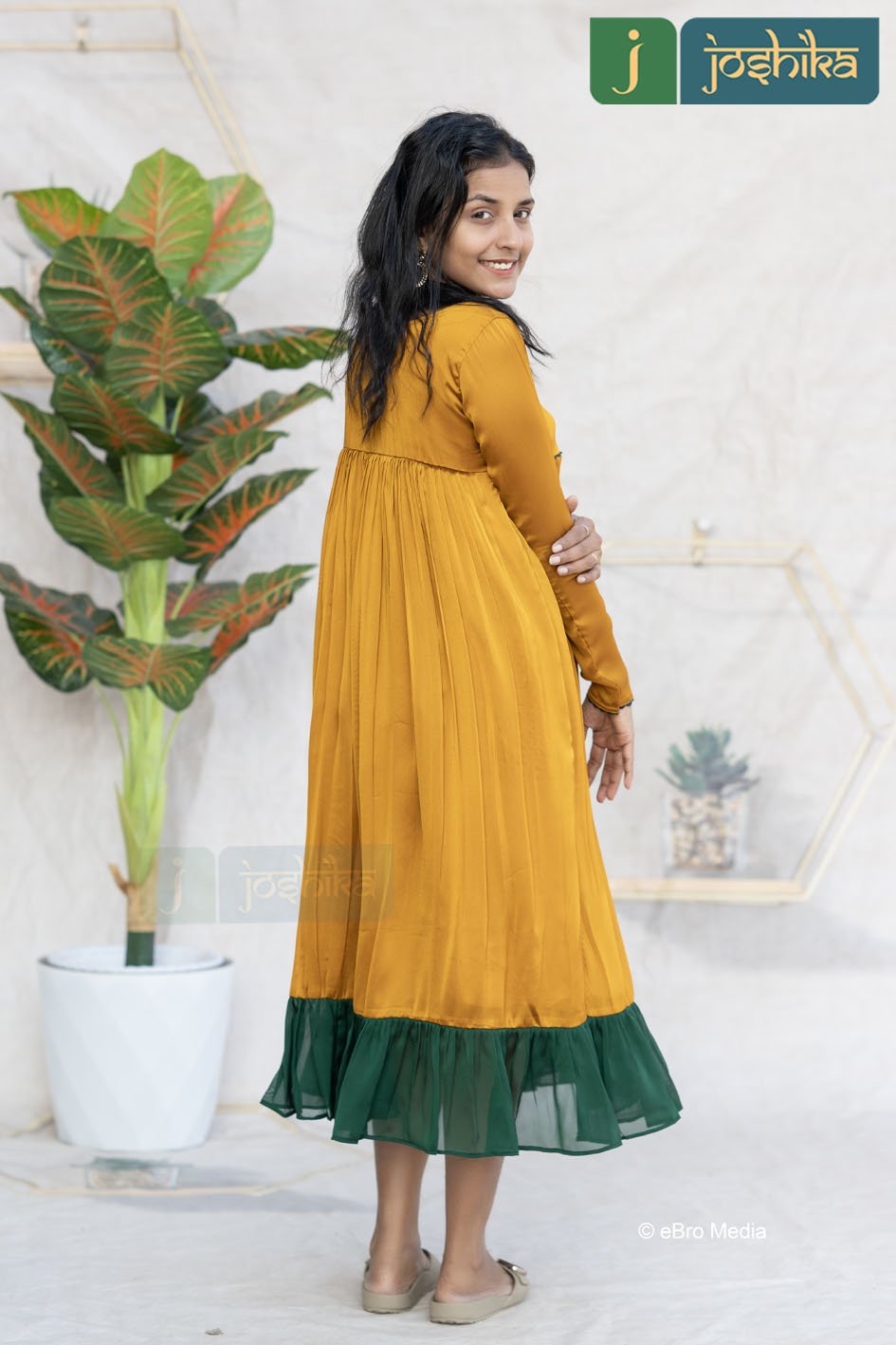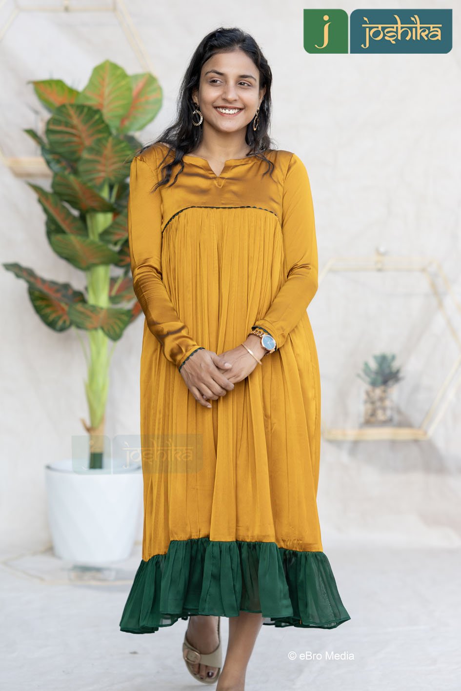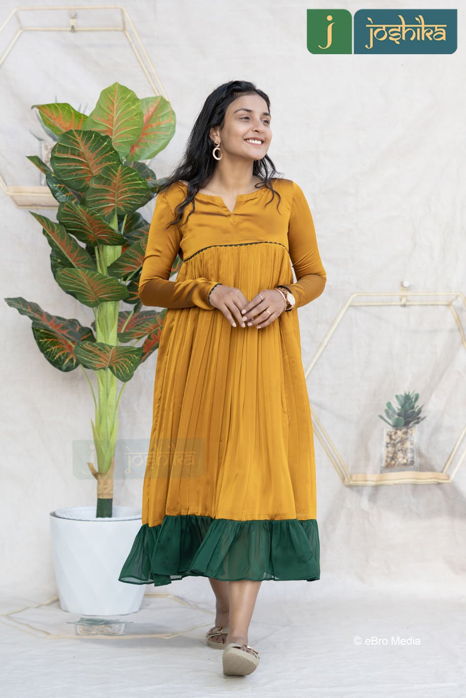 MUSTARD YELLOW SILKY GEORGETTE DRESS WITH GREEN PLEATED DETAIL