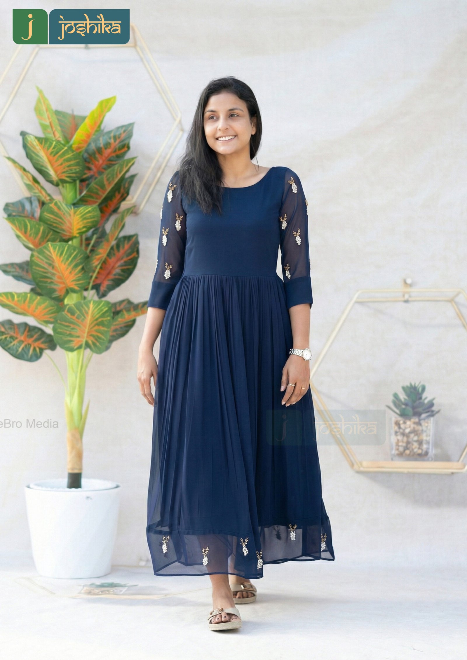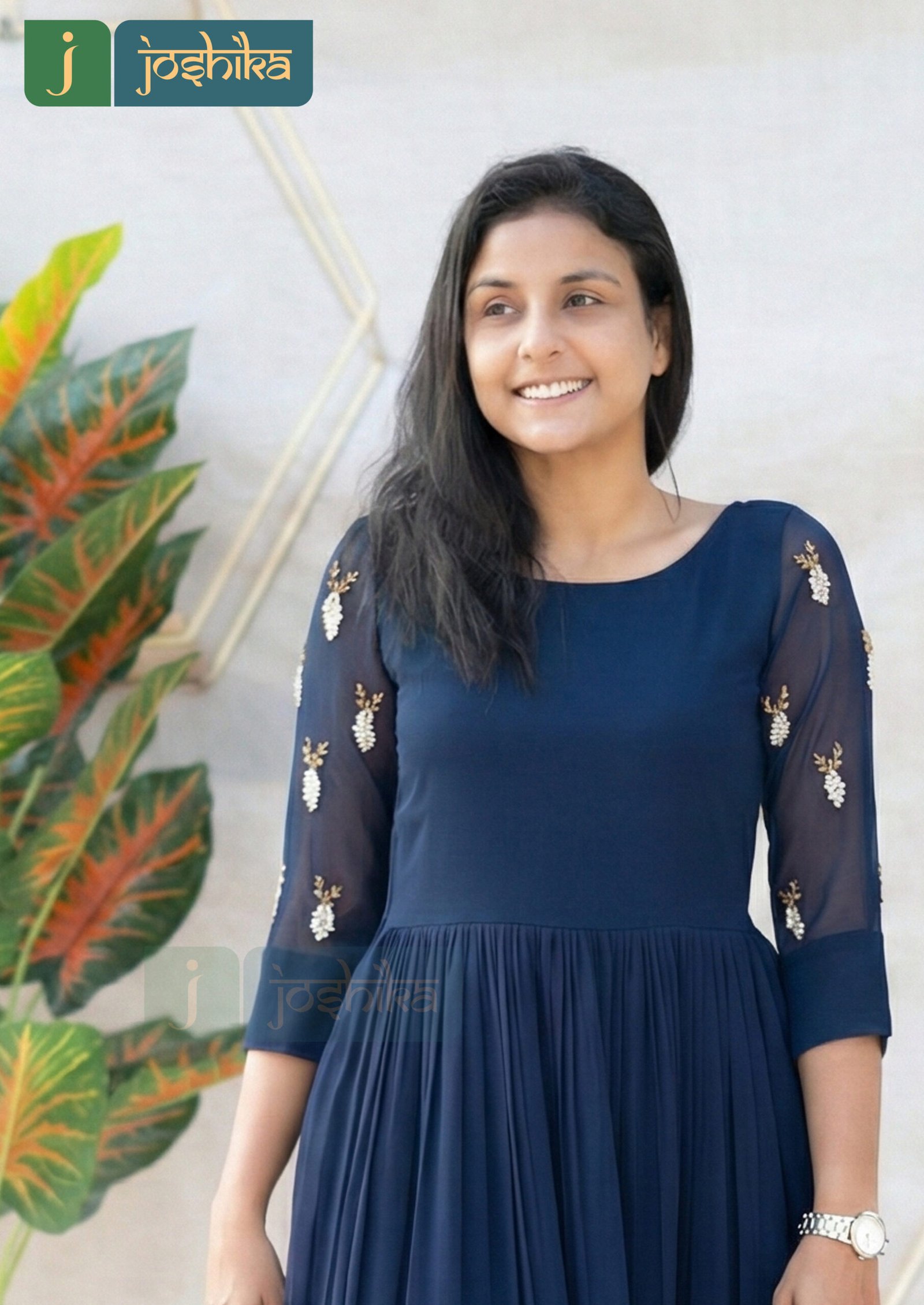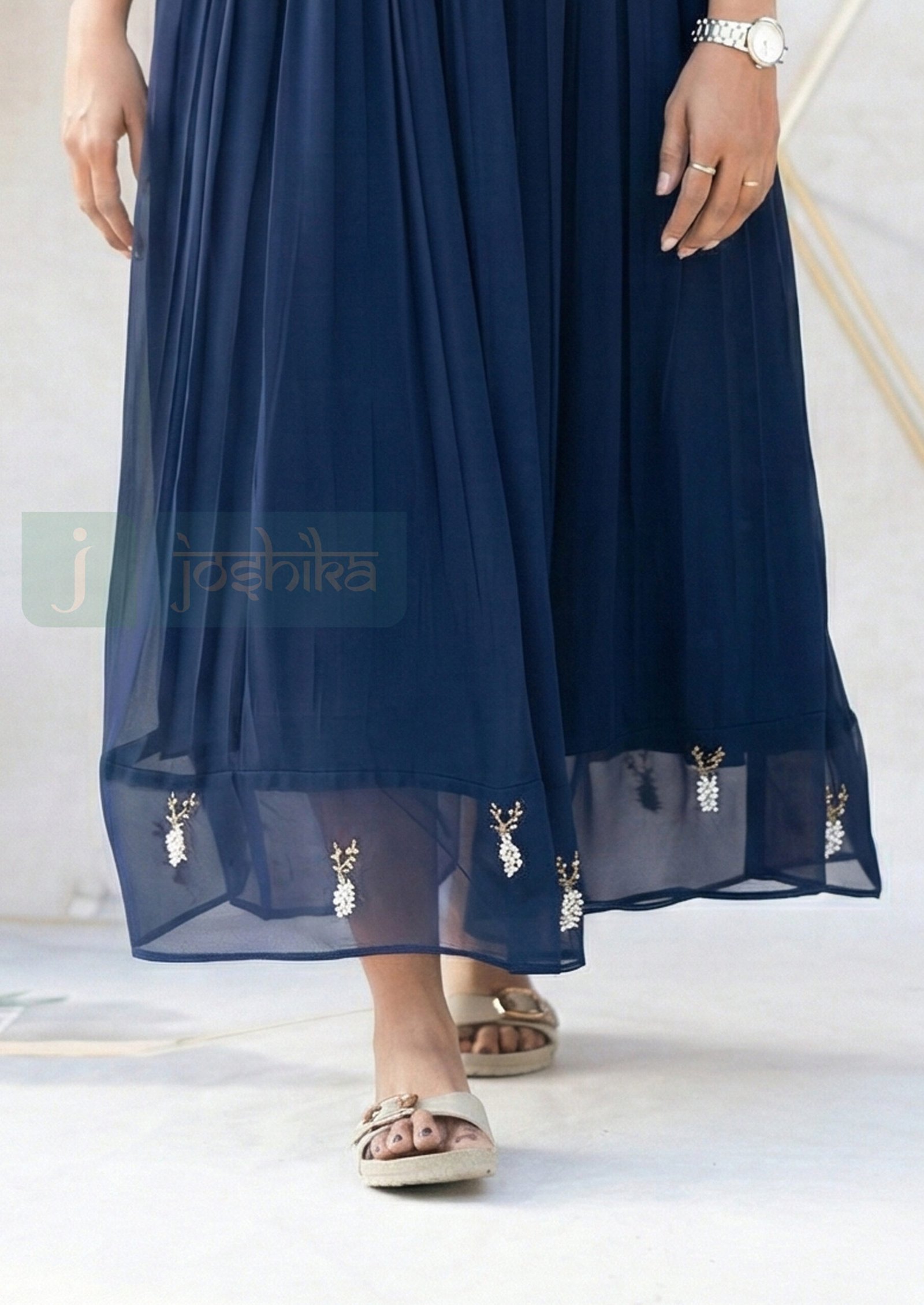 Elevate your everyday elegance with this navy blue pleated kurta, crafted in a flowy fabric that drapes beautifully. The kurta features soft pleats from the waist down, creating a graceful silhouette, while delicate hand embroidery on the sleeves and hem adds a refined artisanal touch. Designed with a round neckline and three quarter sheer sleeves, this kurta is perfect for festive gatherings , office wear, or casual celebrations.