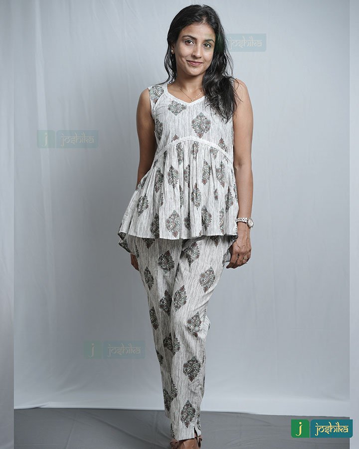 Printed cotton co-ord set with attached white lace