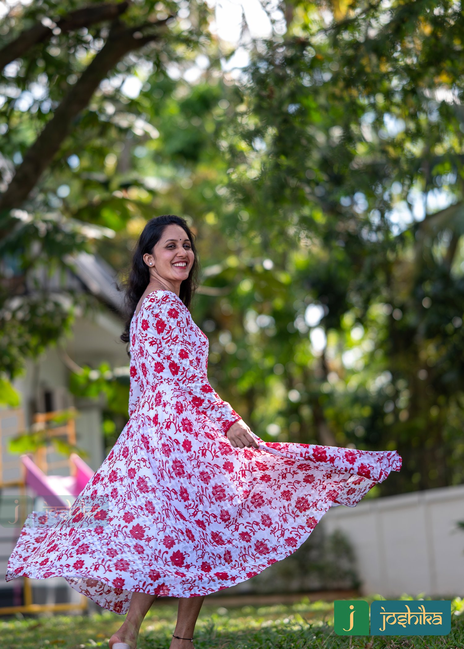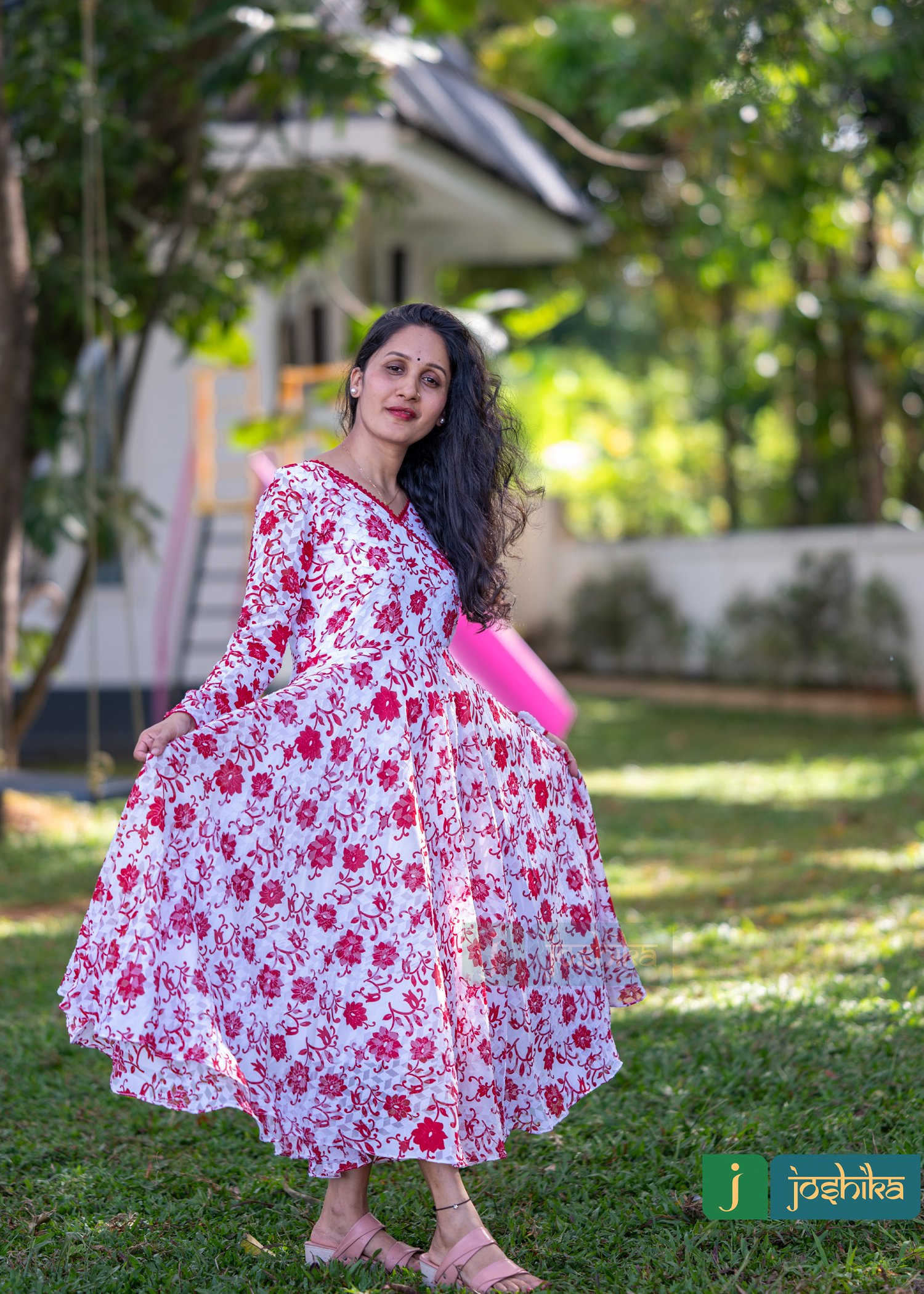printed Georget umbrella kurta, V neck with red lace.