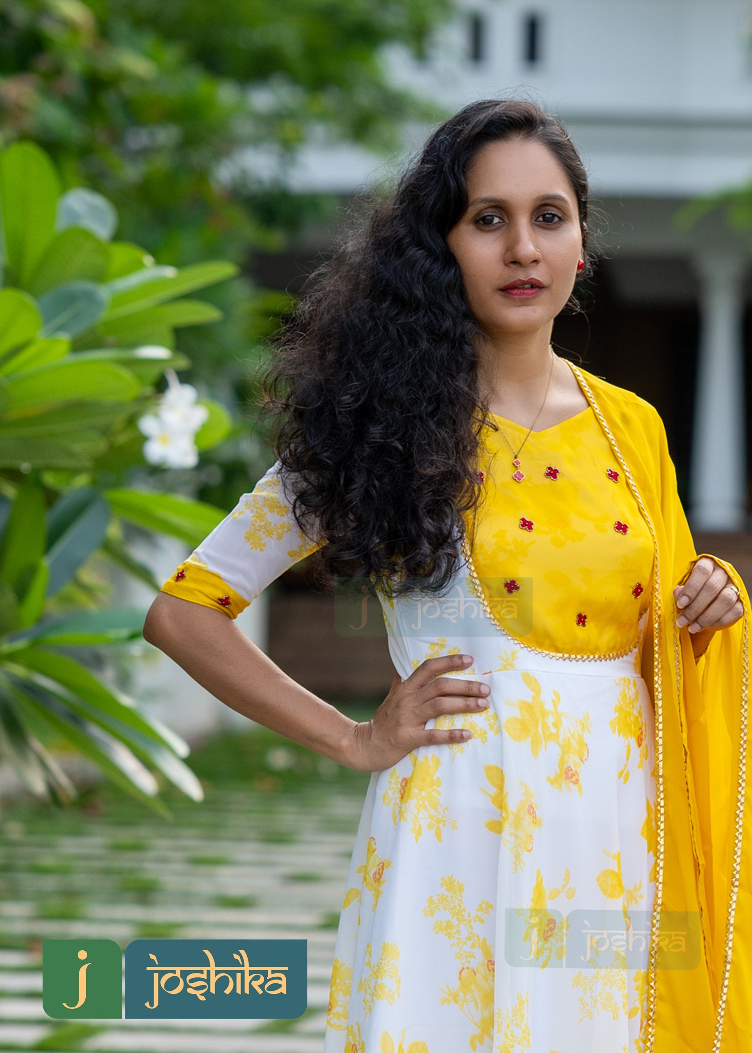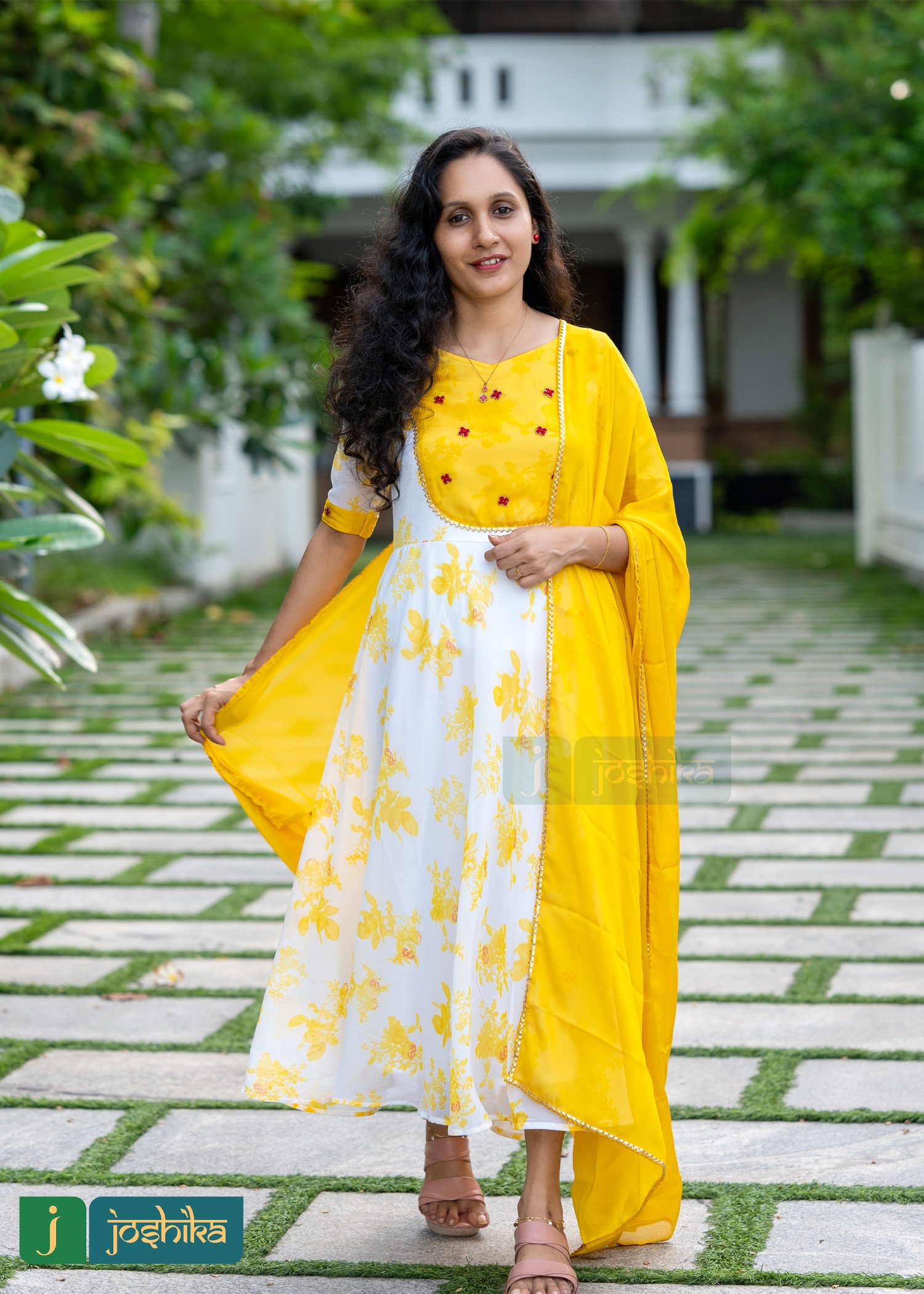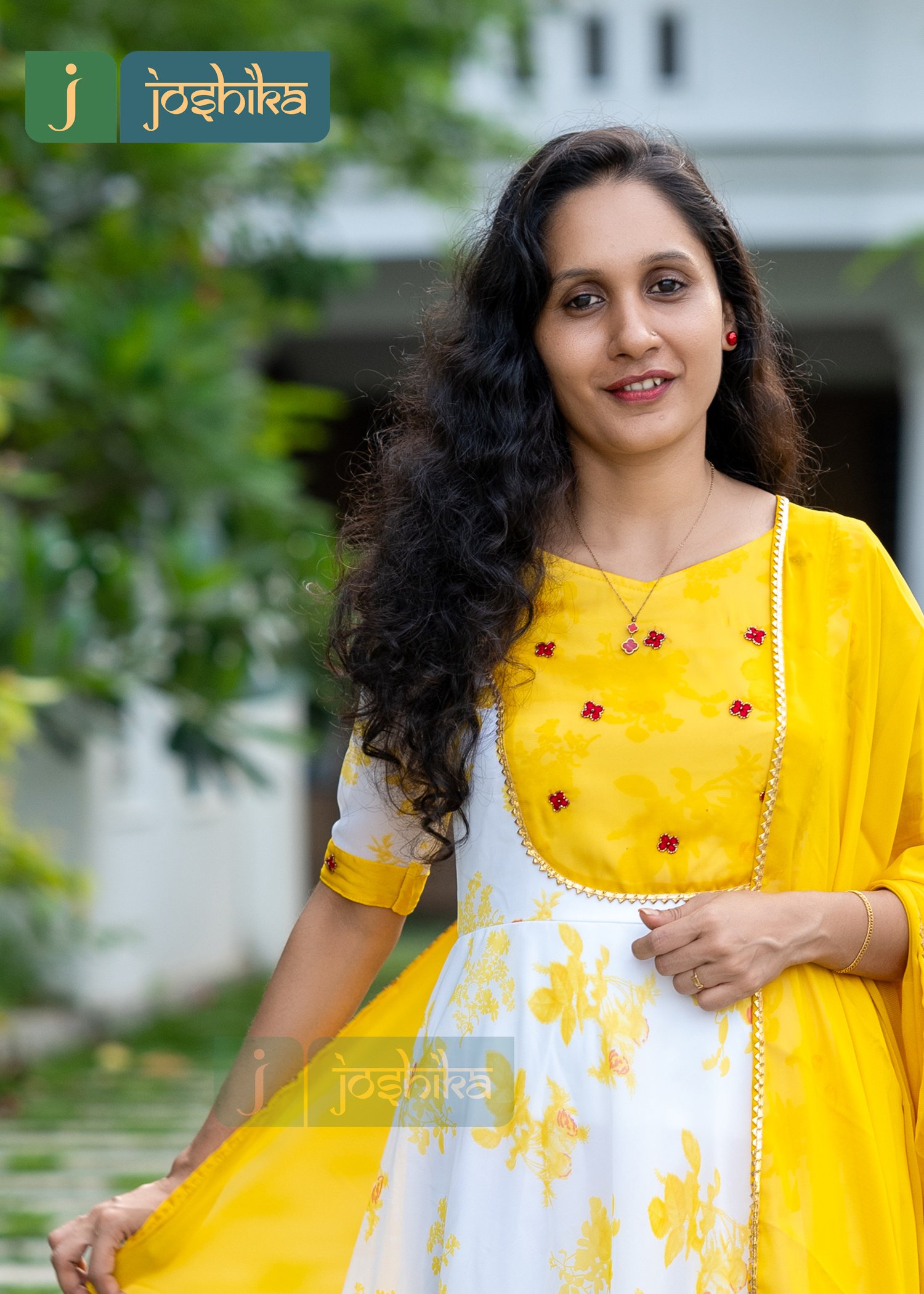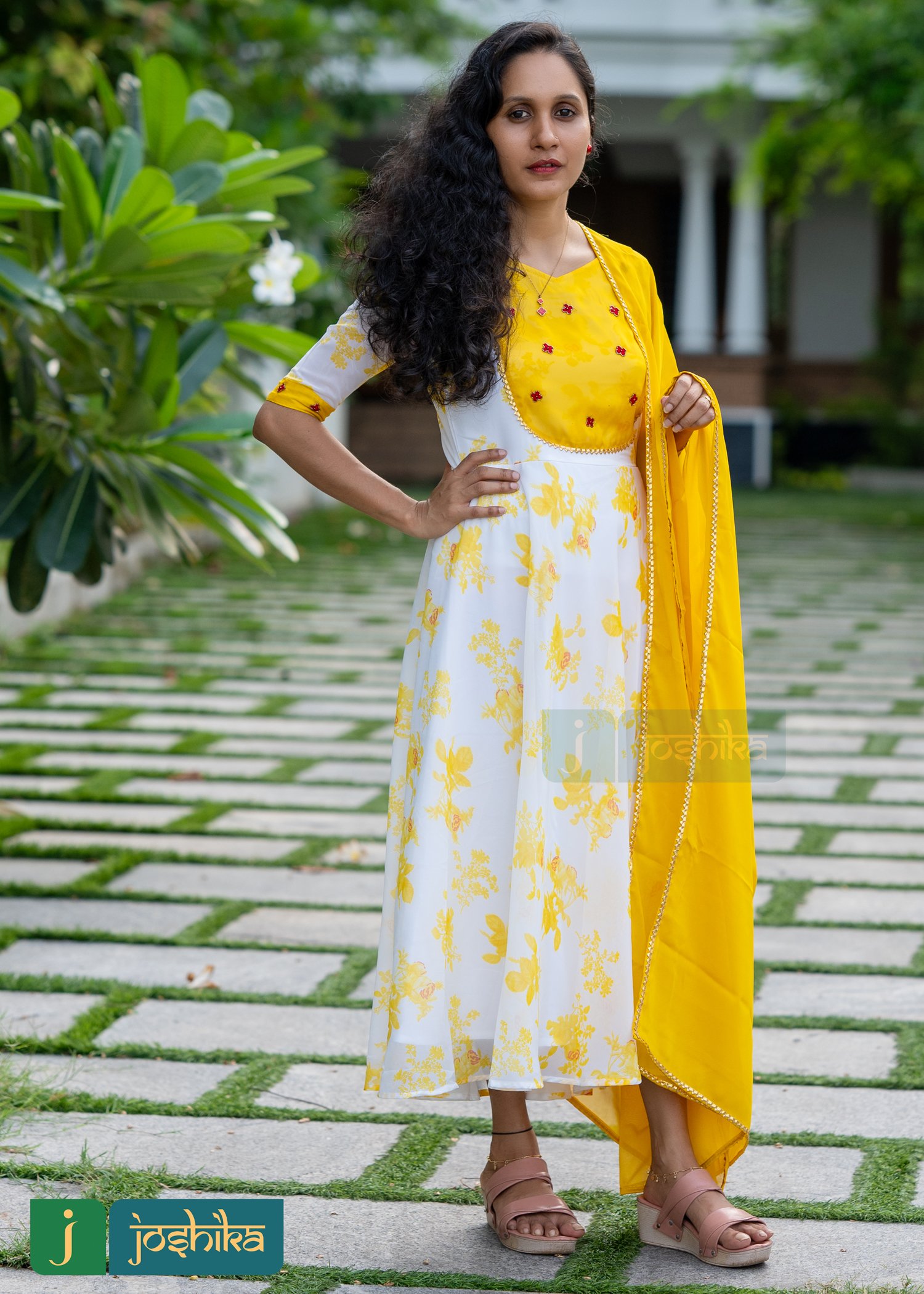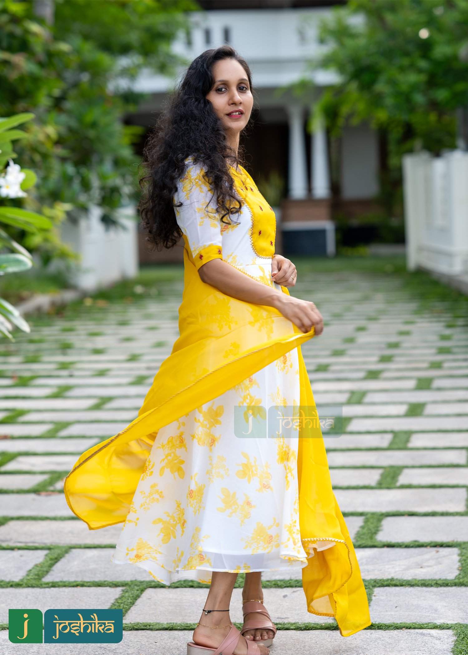 Printed georgette embroidered Anarkali kurta with dupatta, thread work on yoke, dupatta 4 side golden lace, sleeves border also embellished with thread work.