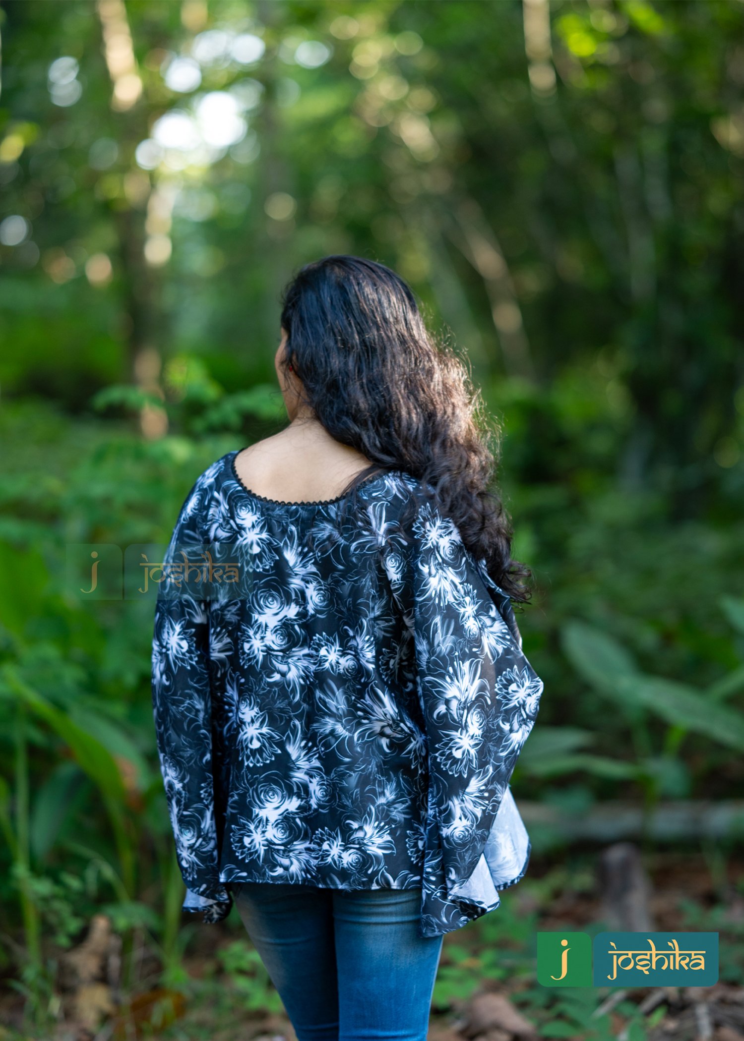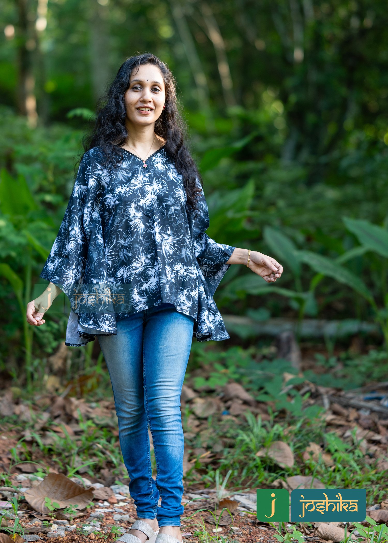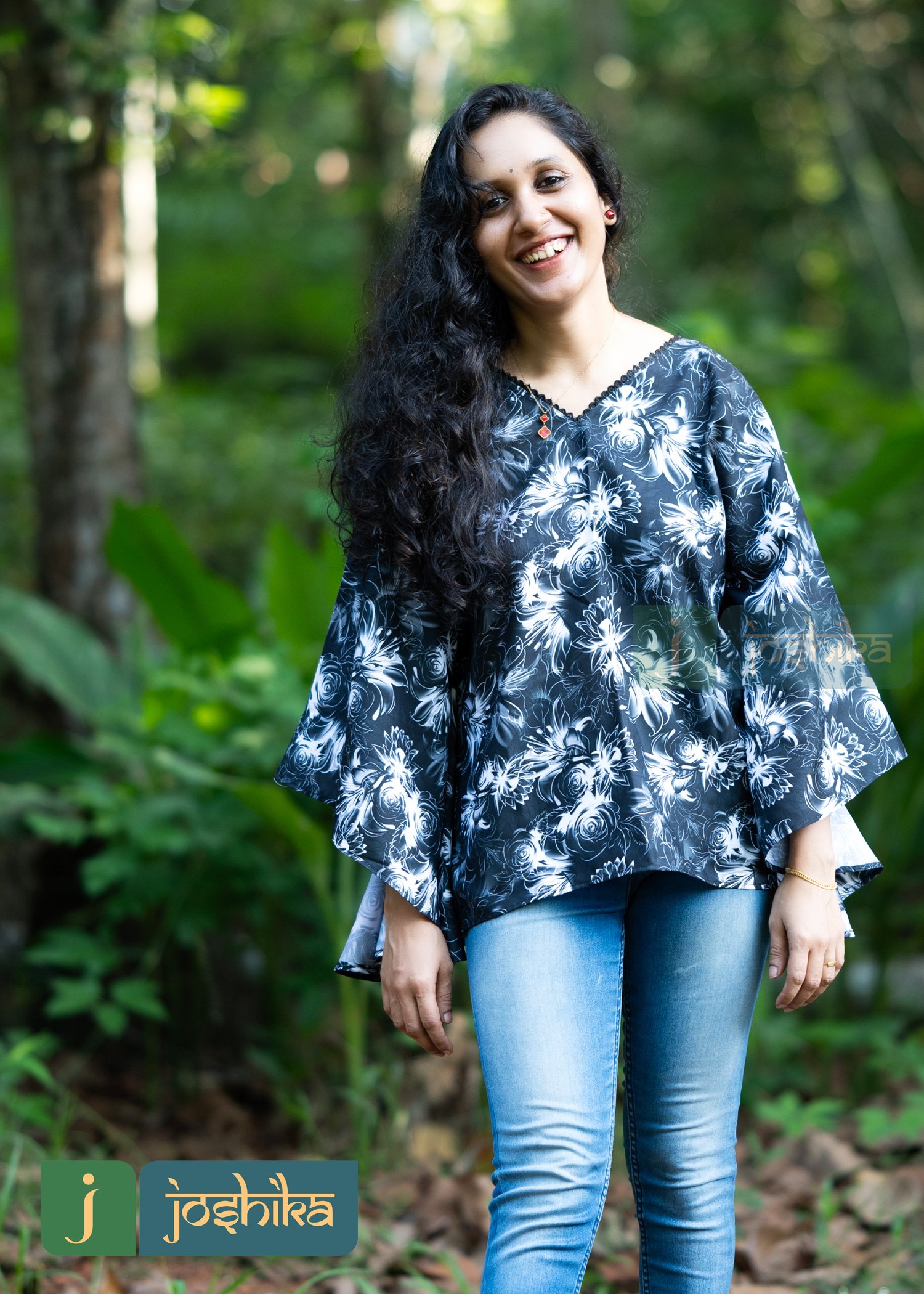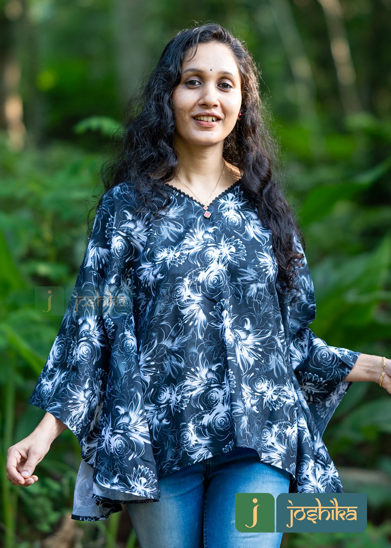 Printed rayon premium kaftan, V neck with black lace, short kaftan suitable for jeans.