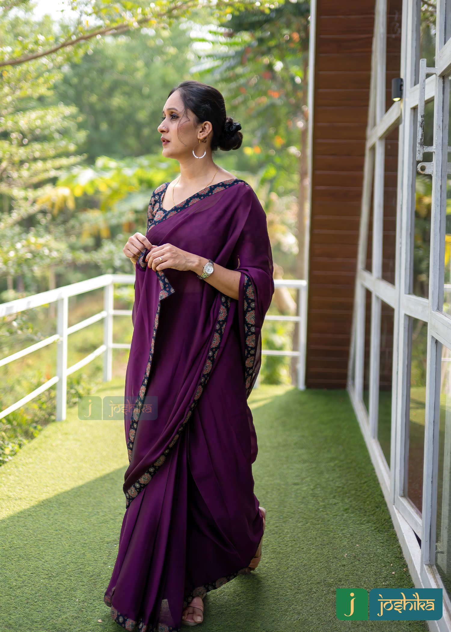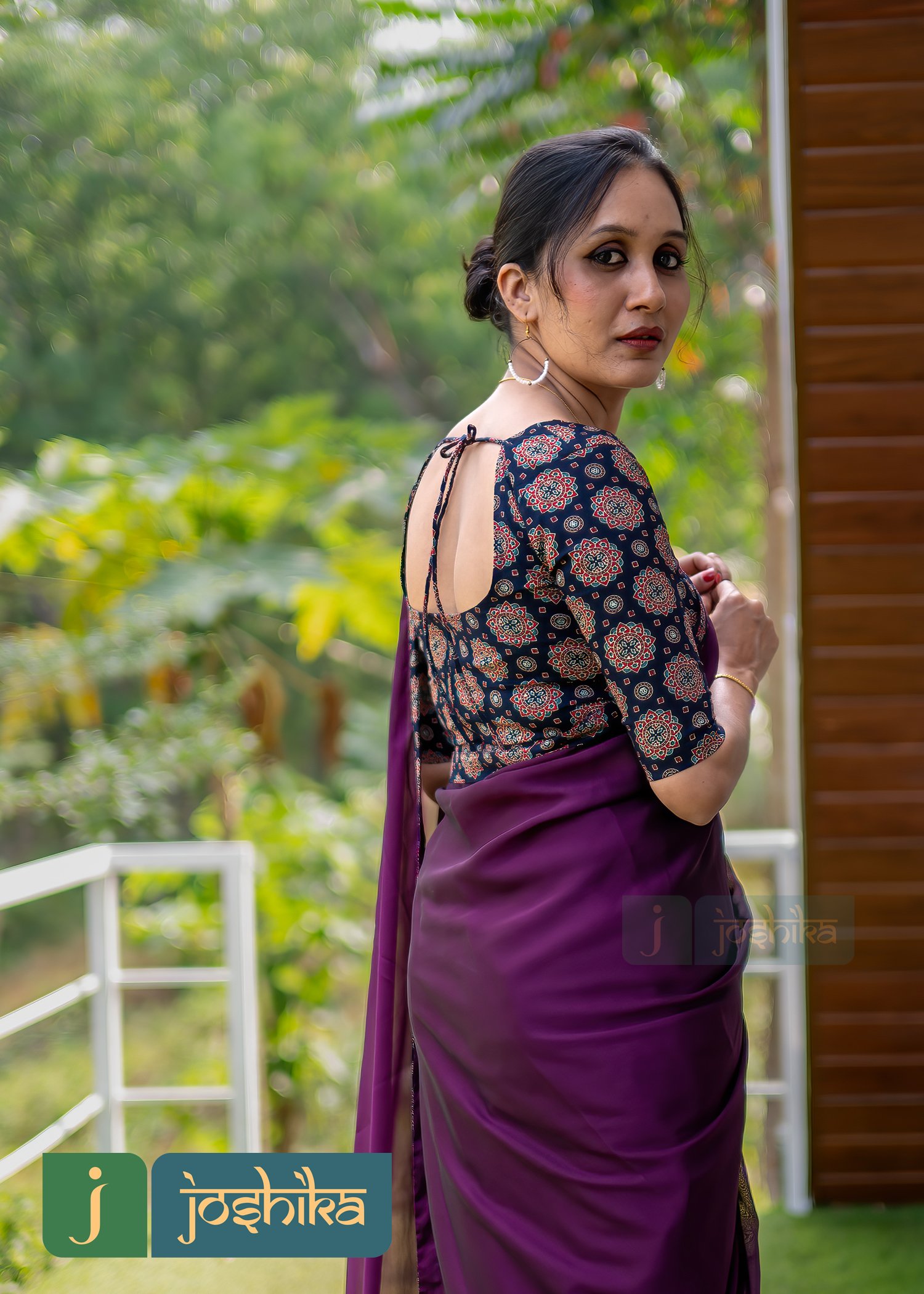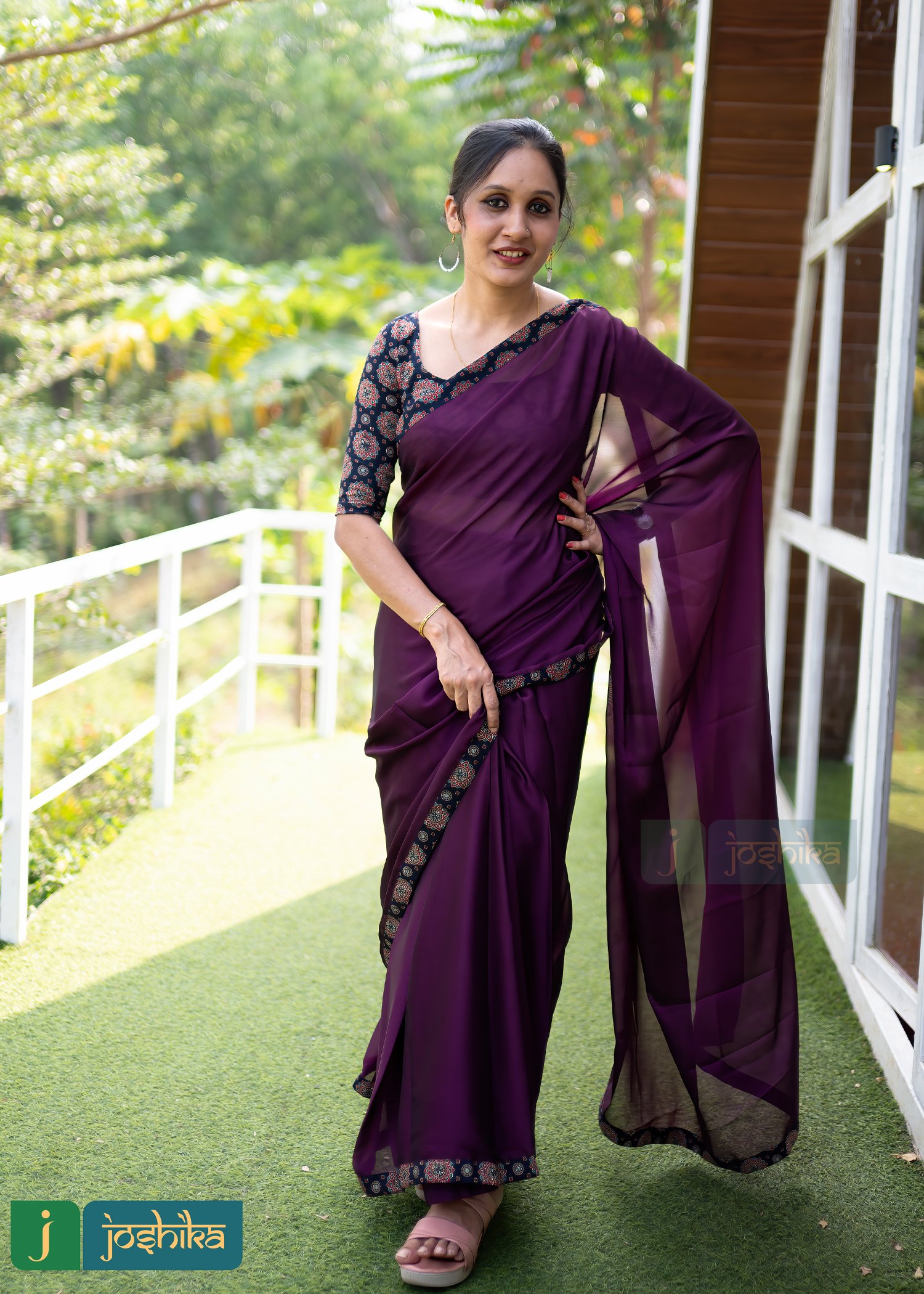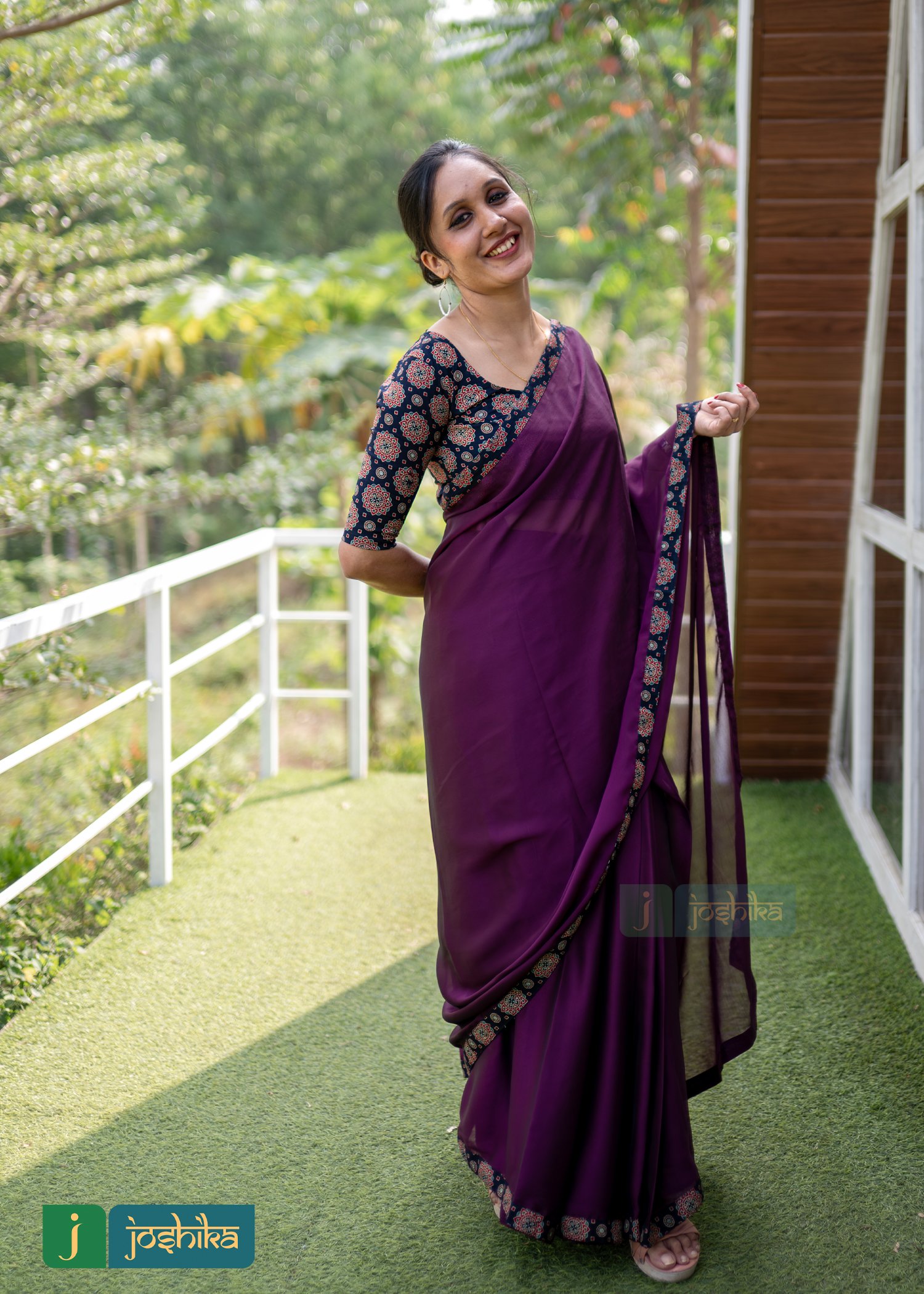 Georgette ready to wear saree with stitched ajrakh blouse