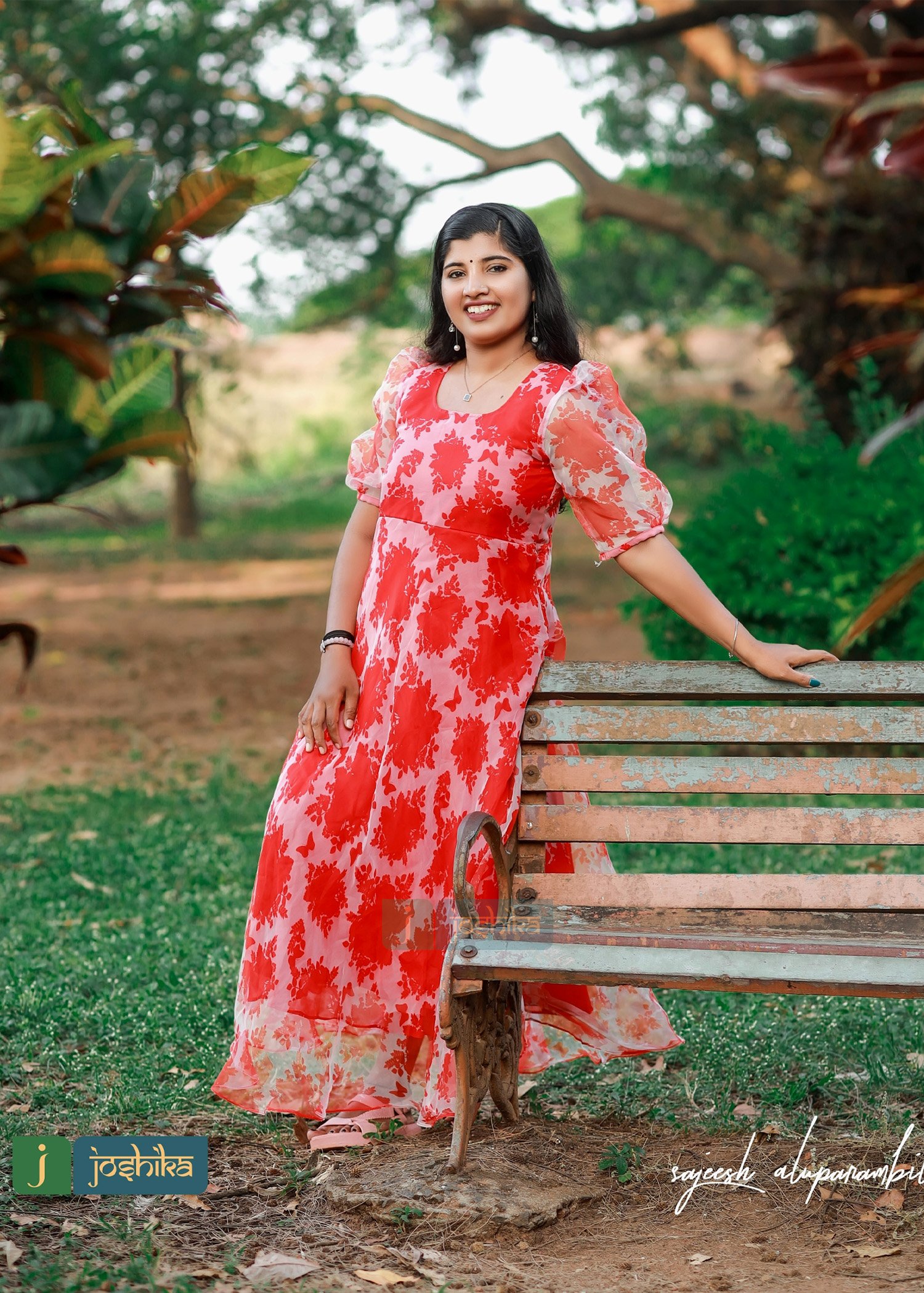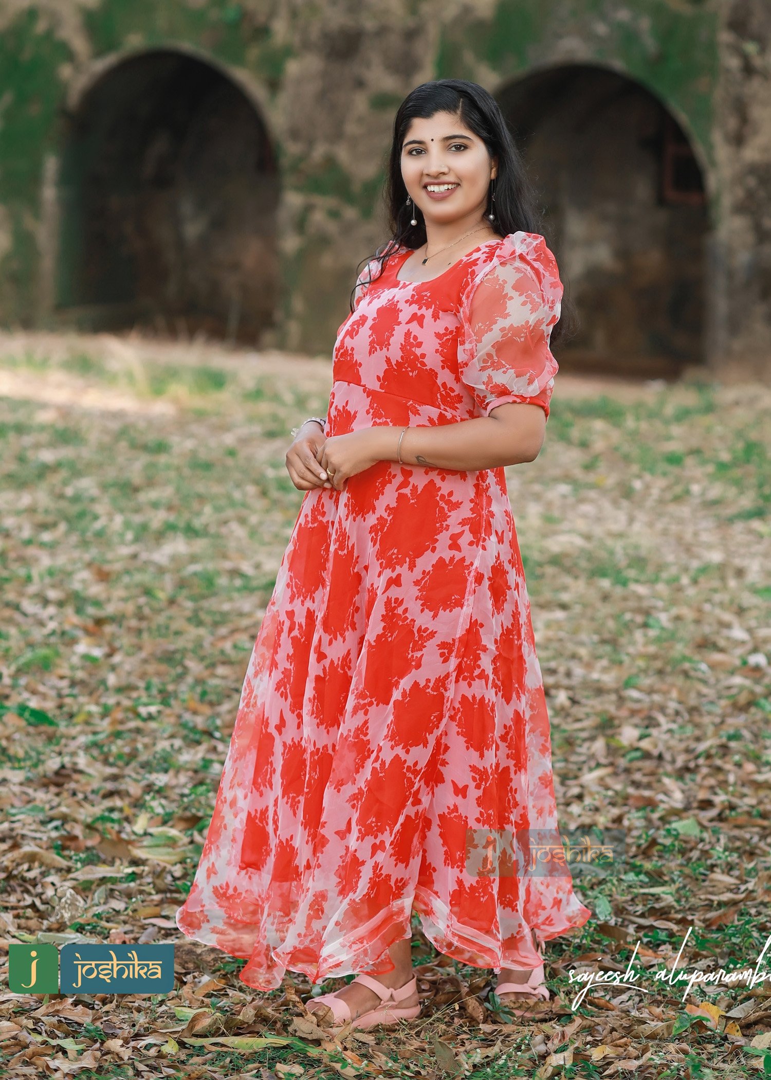 Red organza umbrella frock with puff sleeves.