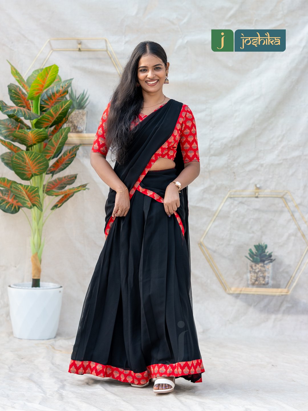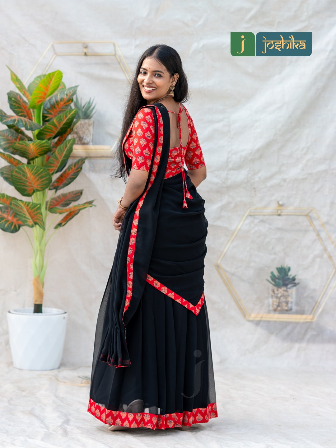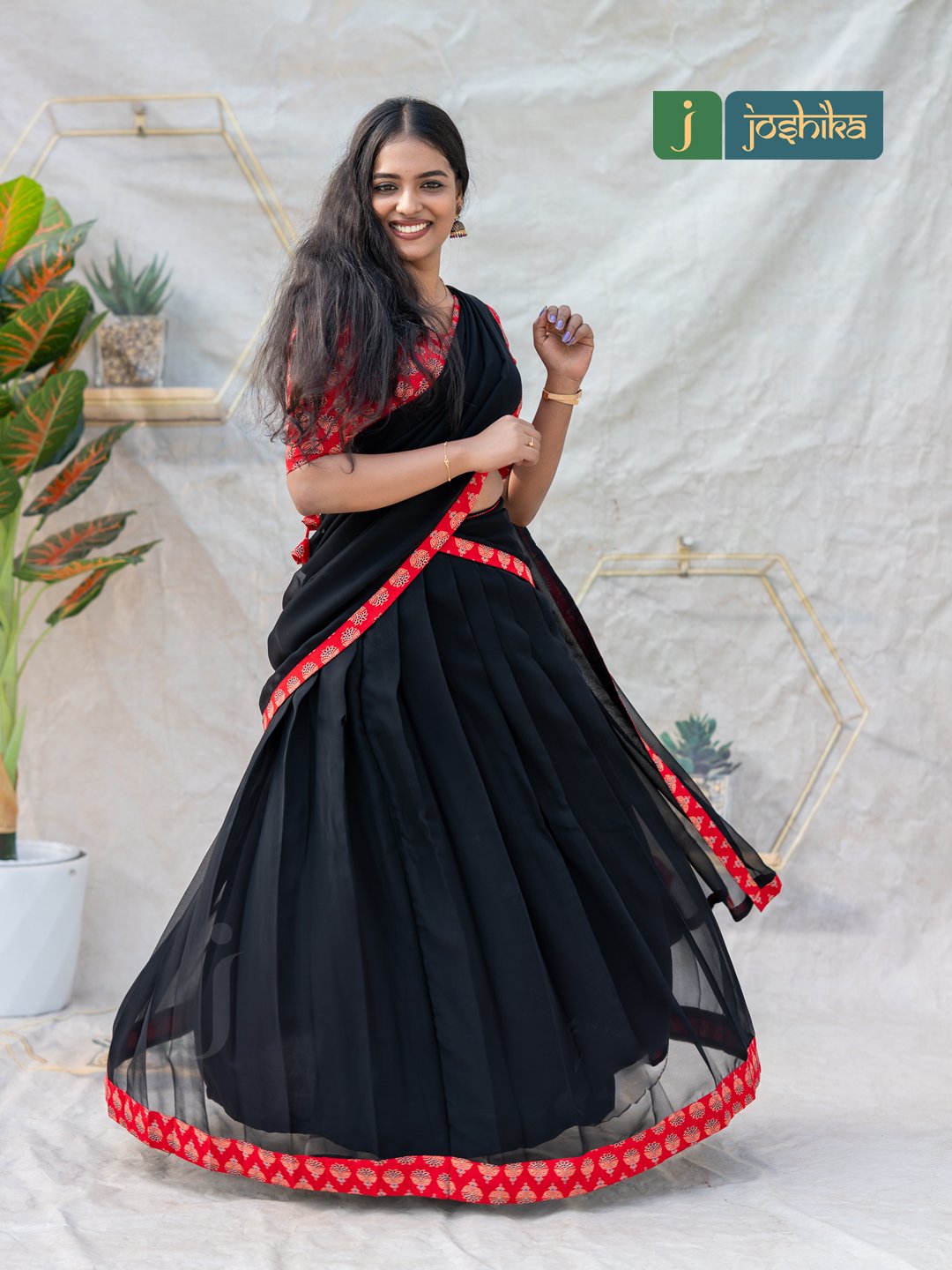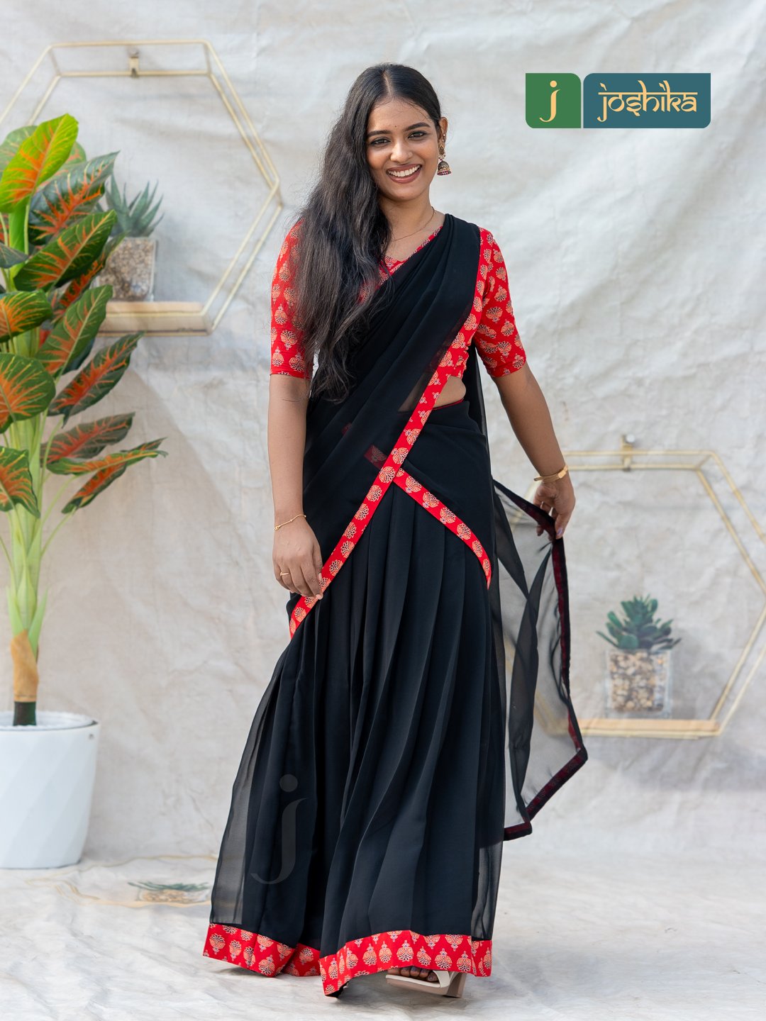 Make a striking statement with this elegant davani set, featuring a rich red Ajrakh-printed blouse paired with a flowy black georgette skirt and matching drape. The intricate Ajrakh patterns add a touch of traditional charm, while the lightweight georgette fabric ensures graceful movement and all-day comfort. Finished with coordinated borders for a refined look, this ensemble is perfect for festive occasions, cultural events, and special gatherings.