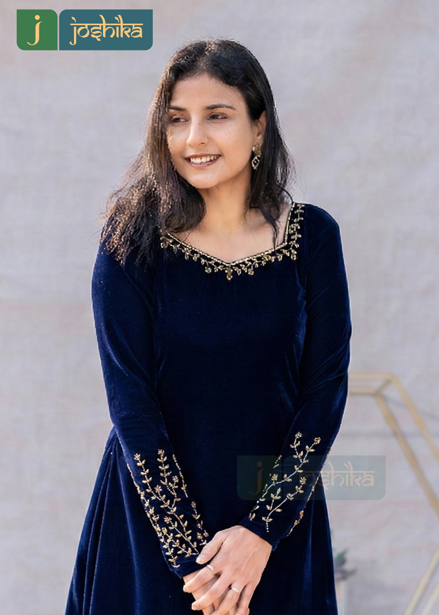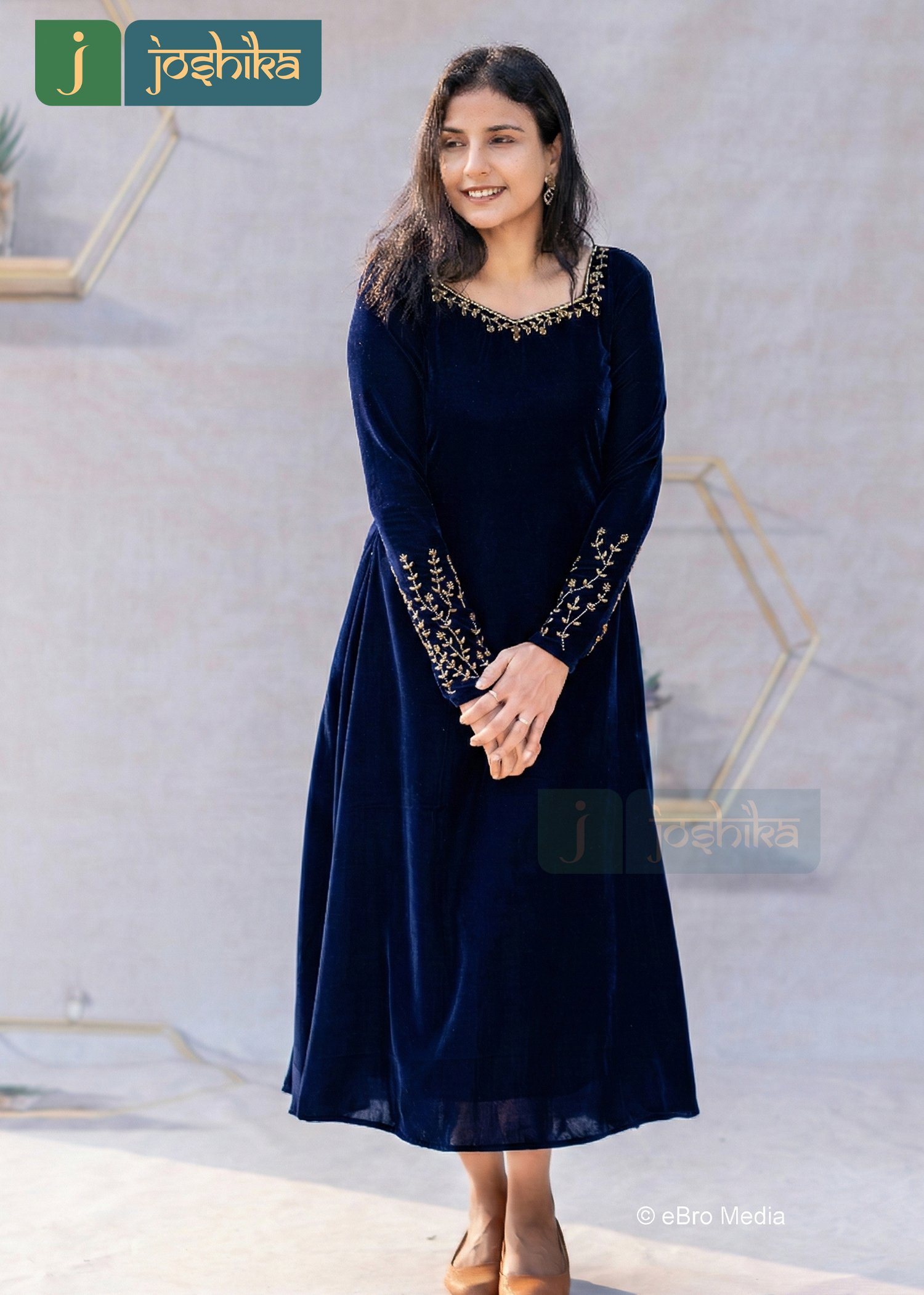 Elevate your festive wardrobe with this elegant Navy blue velvet A-line dress, designed to bring together comfort and timeless charm. Crafted in rich velvet, the dress features delicate hand embroidery along the neckline and sleeves, adding a refined touch of traditional artistry. The flattering A-line silhouette drapes beautifully, making it perfect for festive gatherings, evening celebrations, and special occasions.