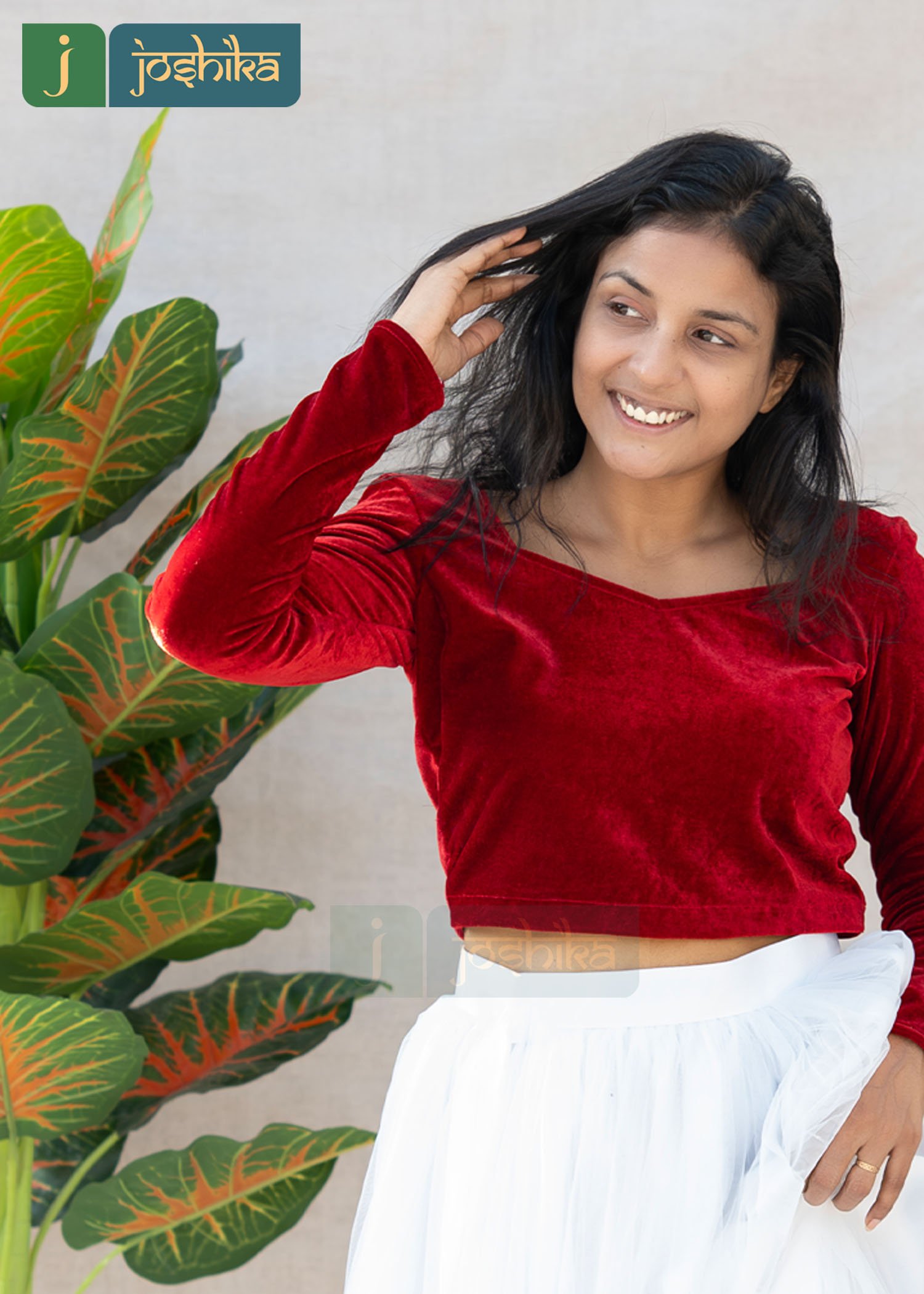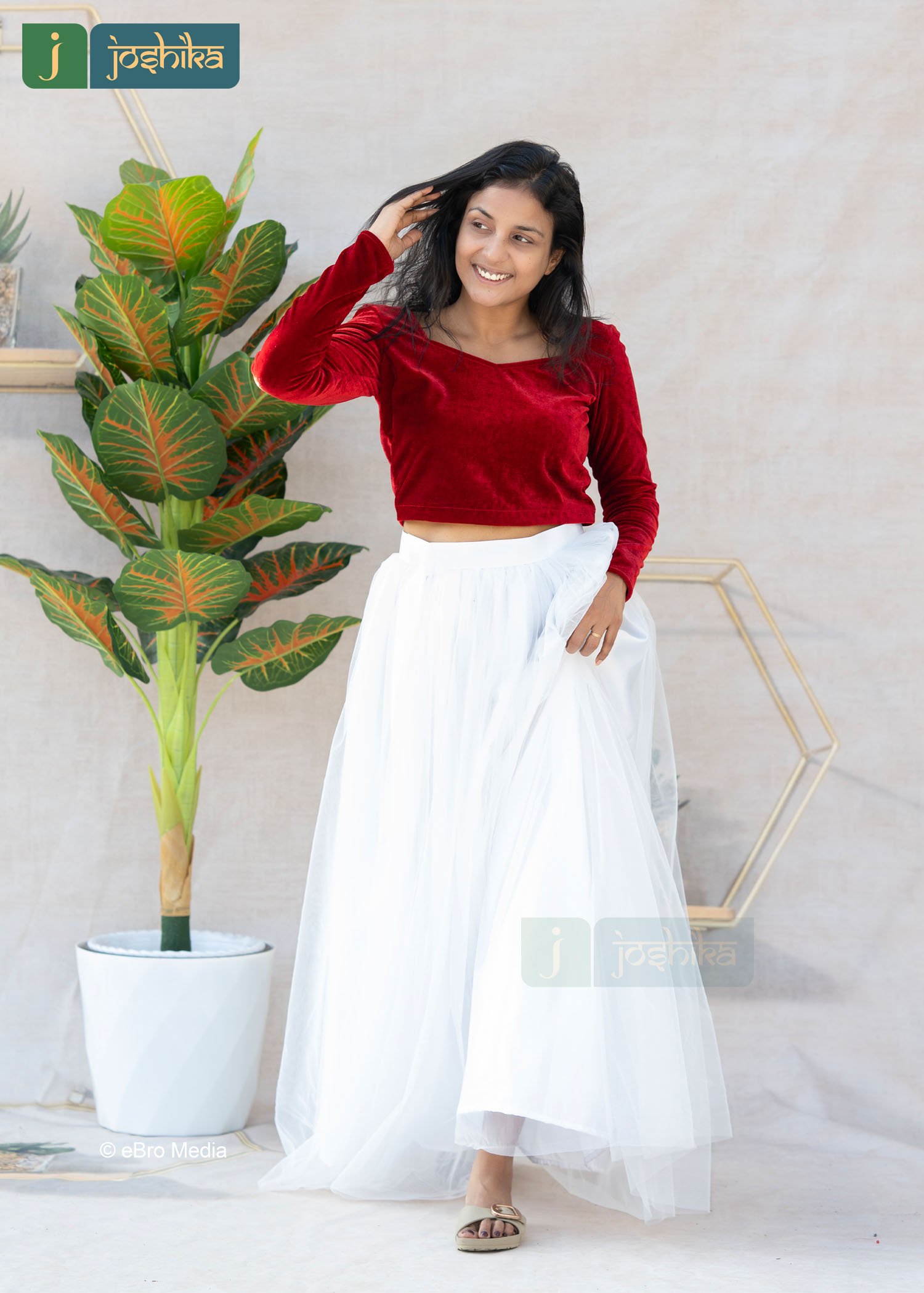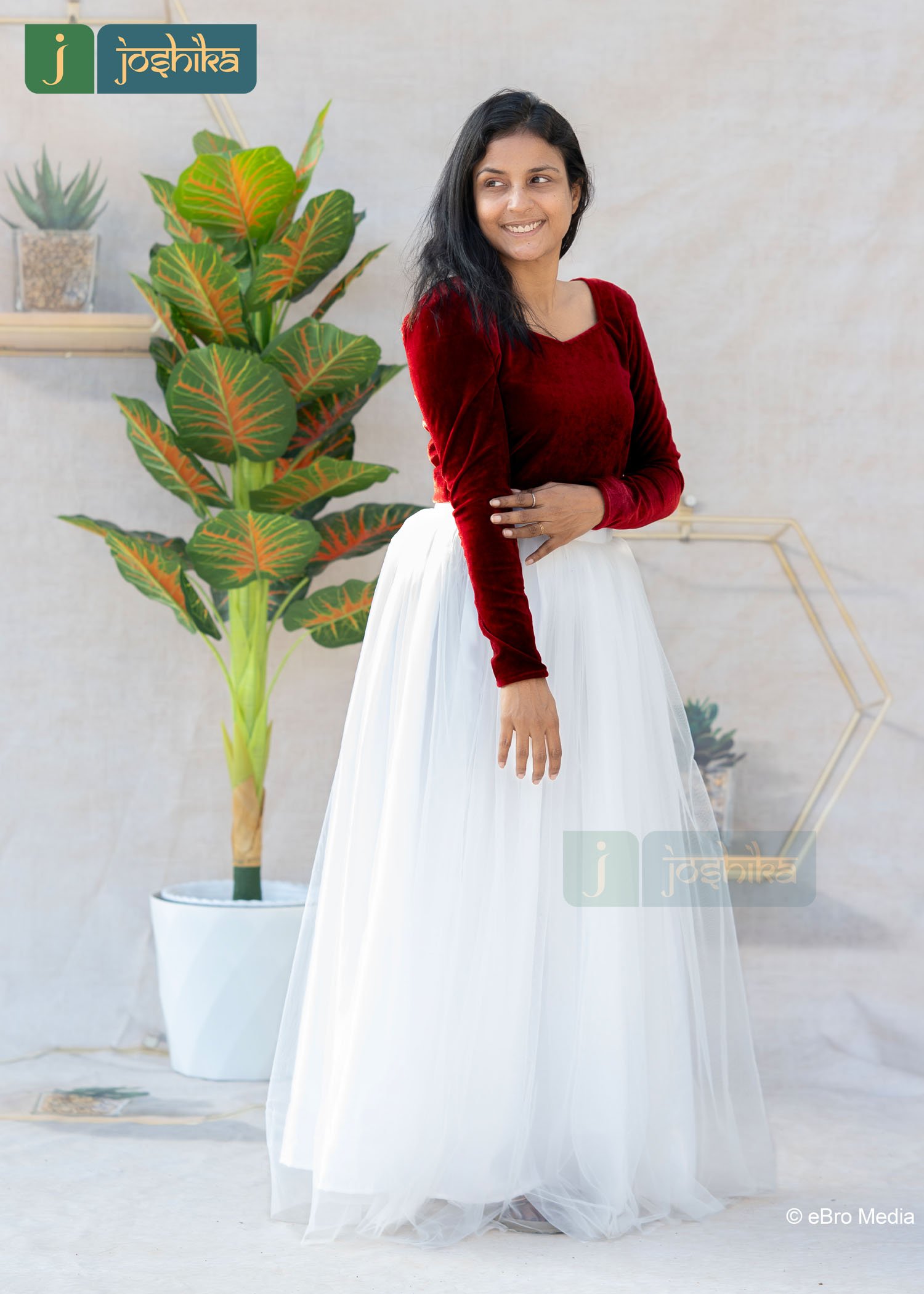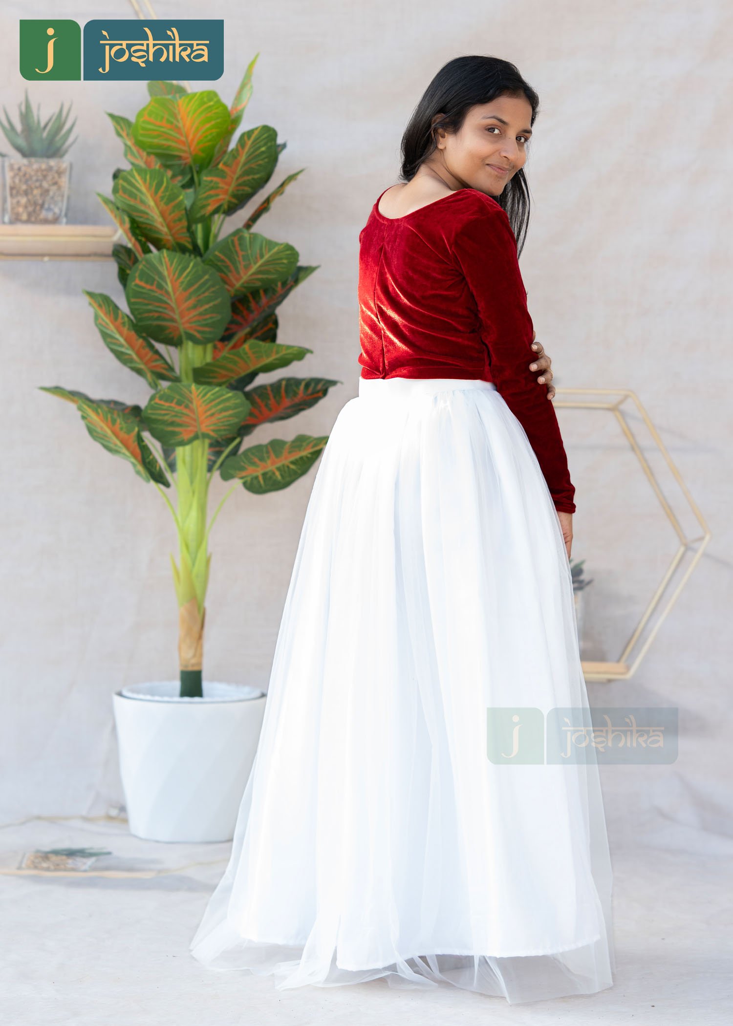 Turn heads with this graceful red velvet crop top and white net skirt set, designed to blend festive charm with modern elegance. The rich velvet crop top adds a touch of luxury, while the flowy white net skirt creates a soft , dreamy silhouette. Perfectly balanced  in contrast and texture, this ensemble is ideal for festive celebrations, parties, and special occasions.
