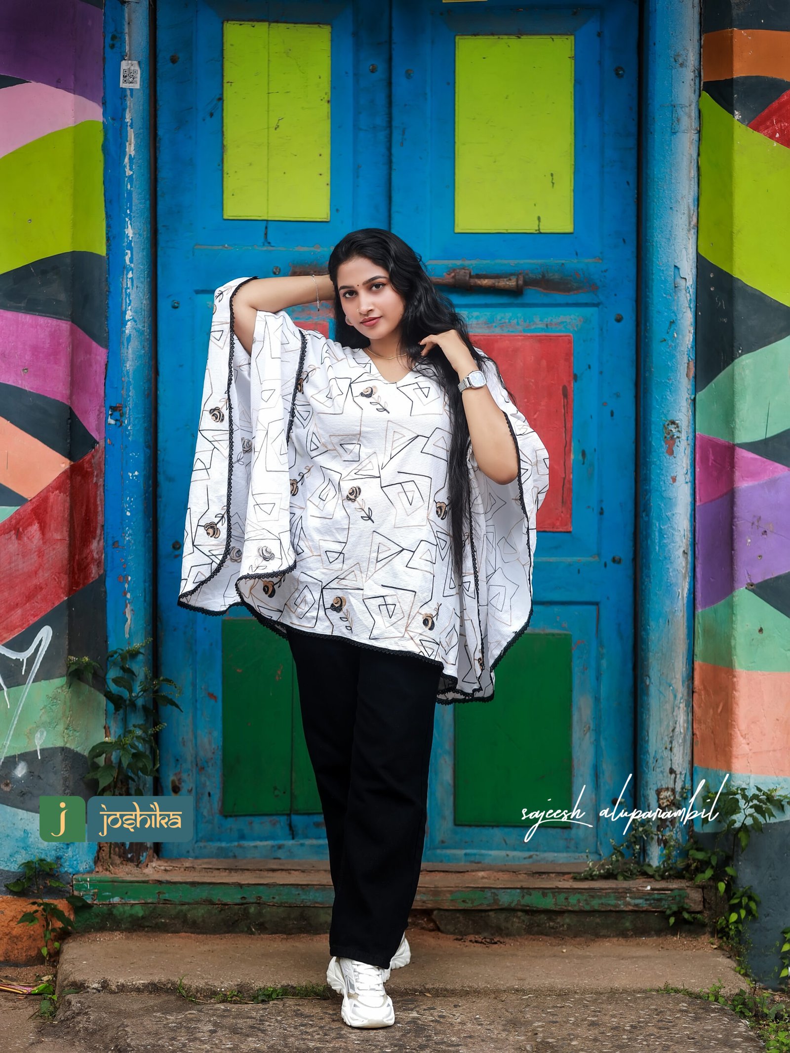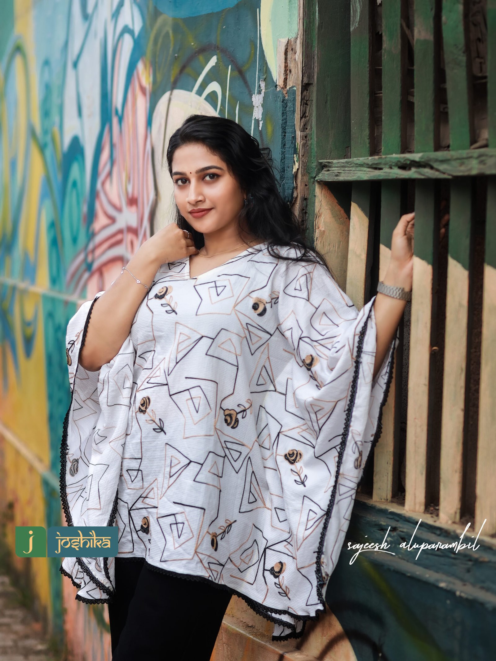 Self embroidered crape white color kaftan embellished with black lace.