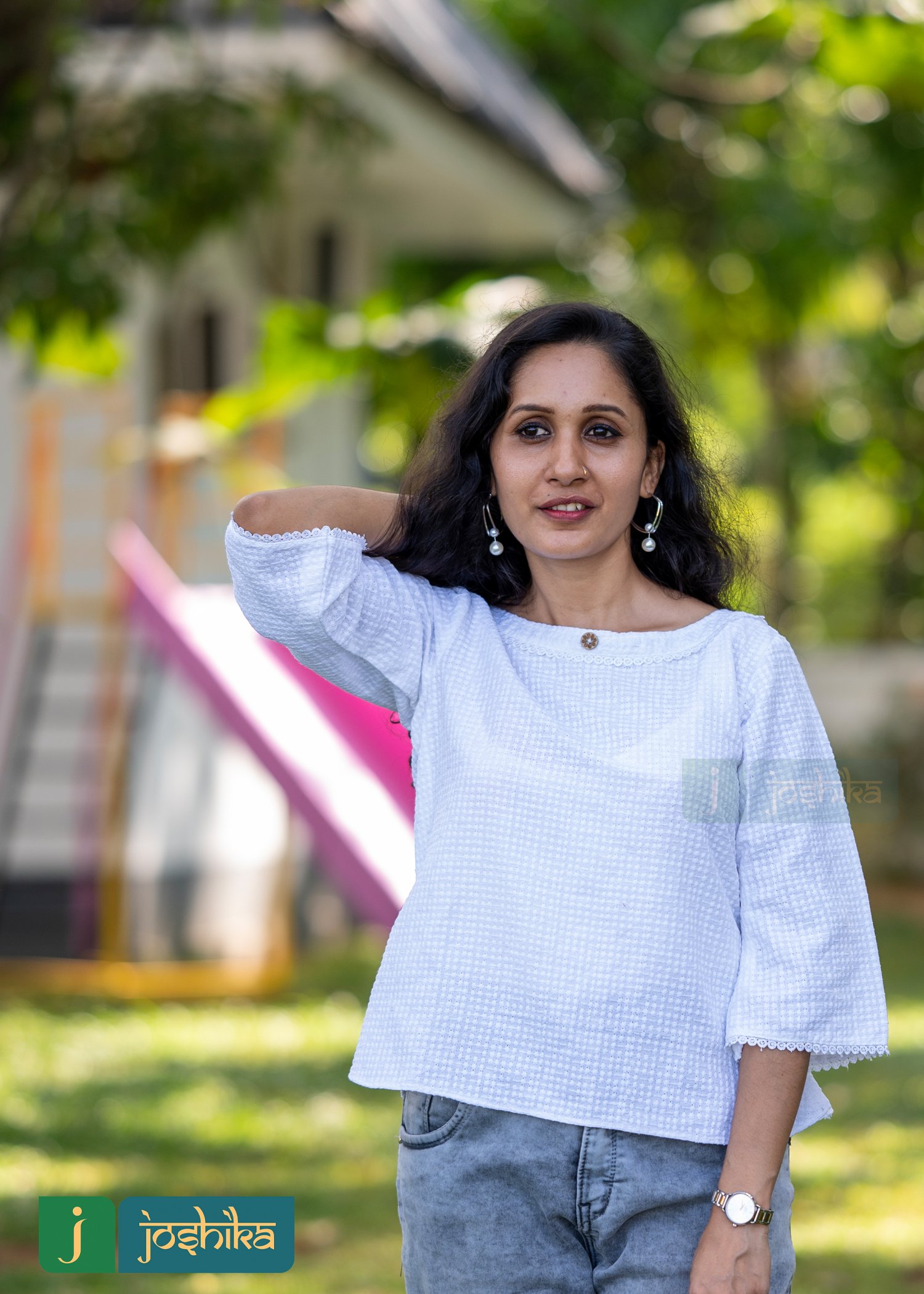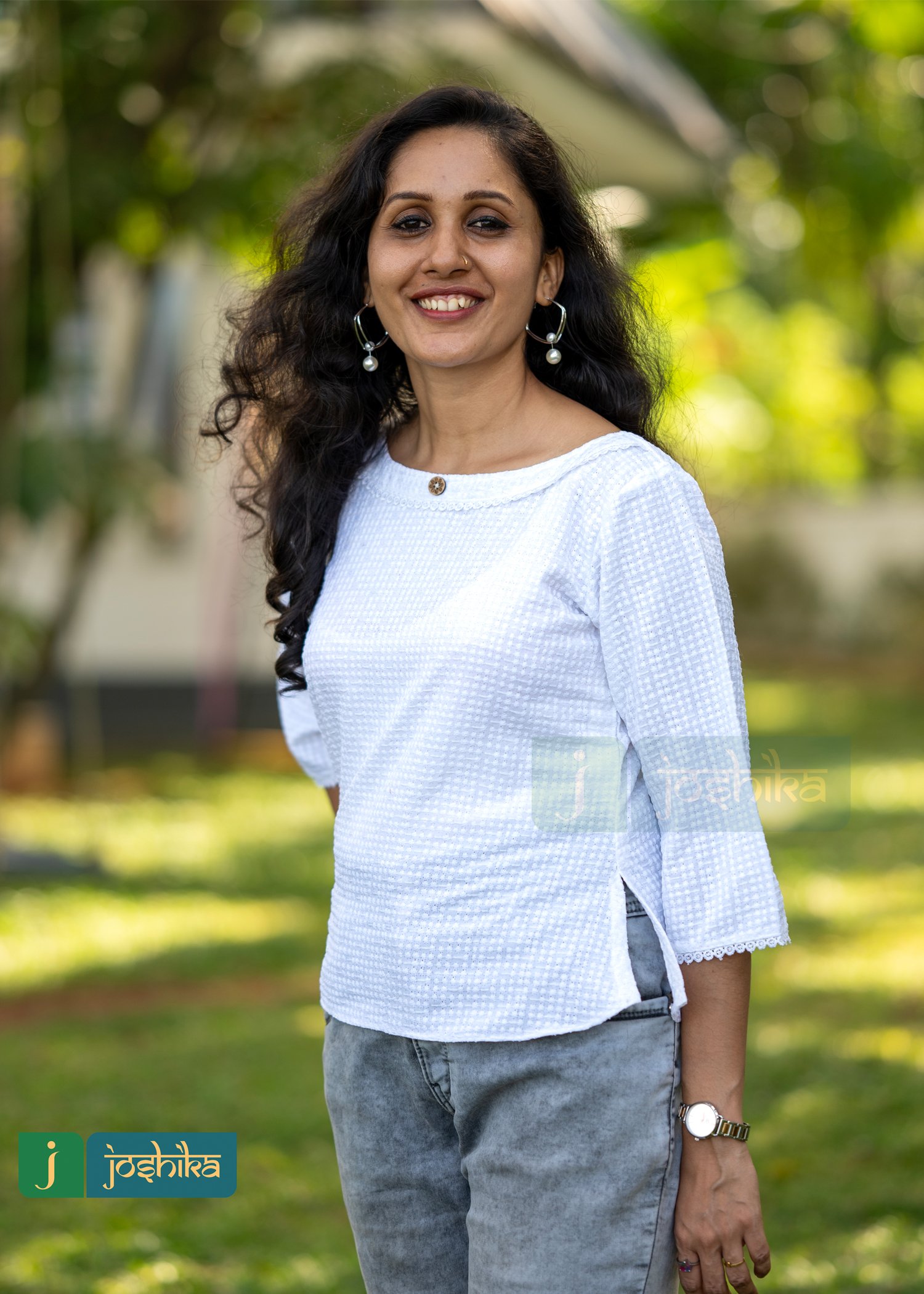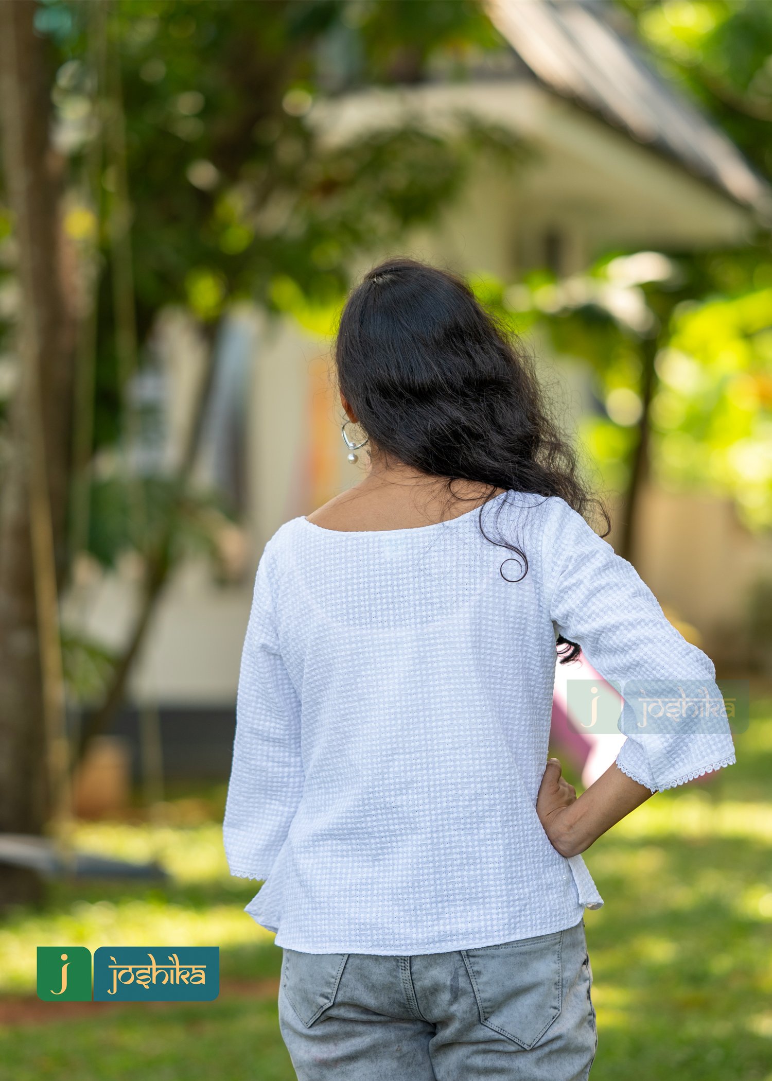 Self embroidered crop top, cotton, white color, coconut shell button, suitable for jeans, round neck design with white color lace, flared sleeves.