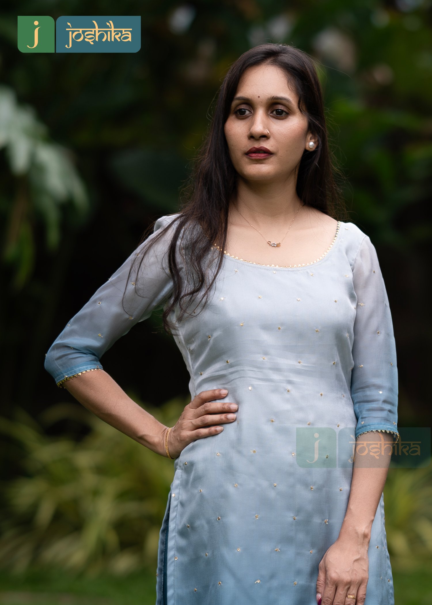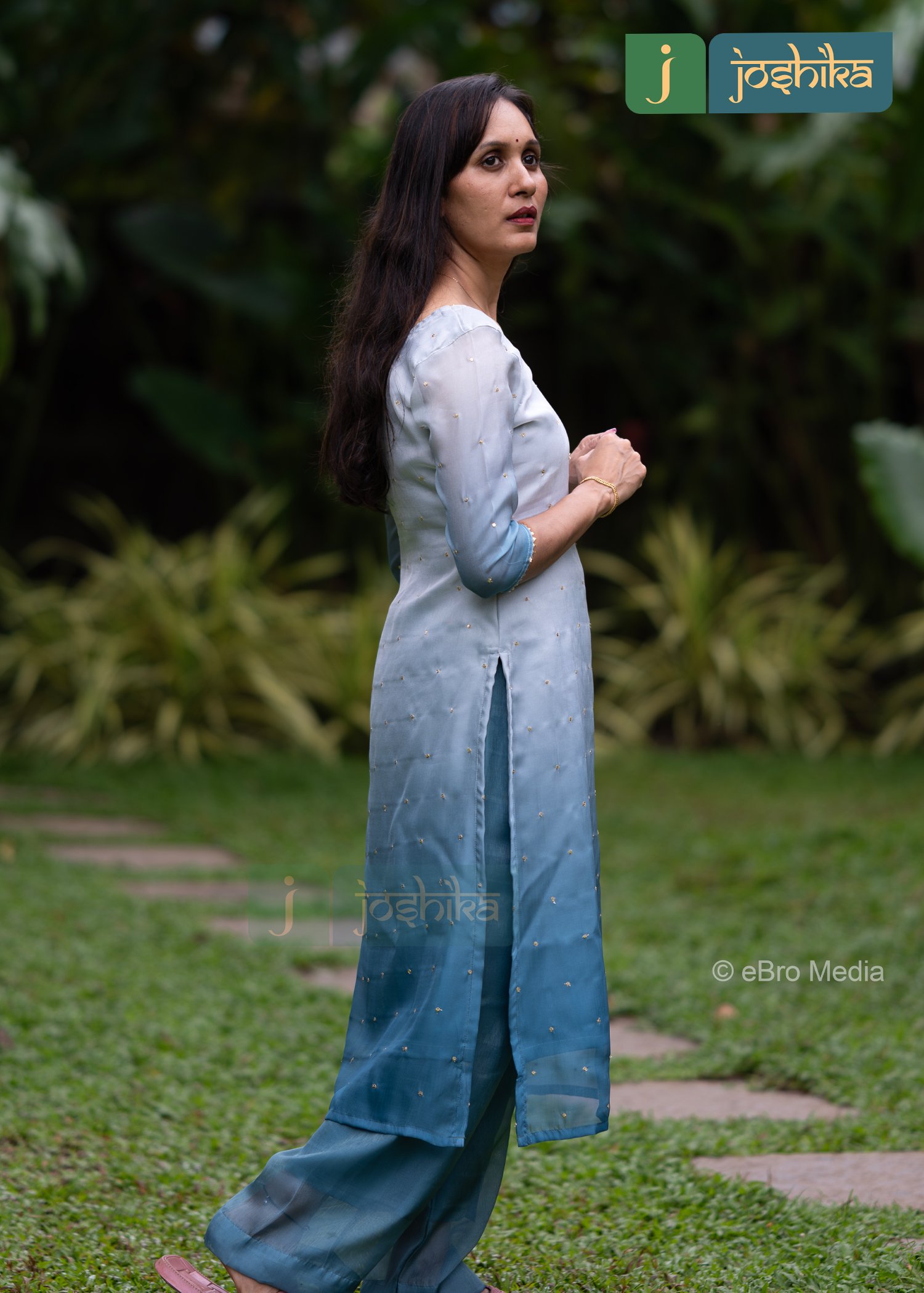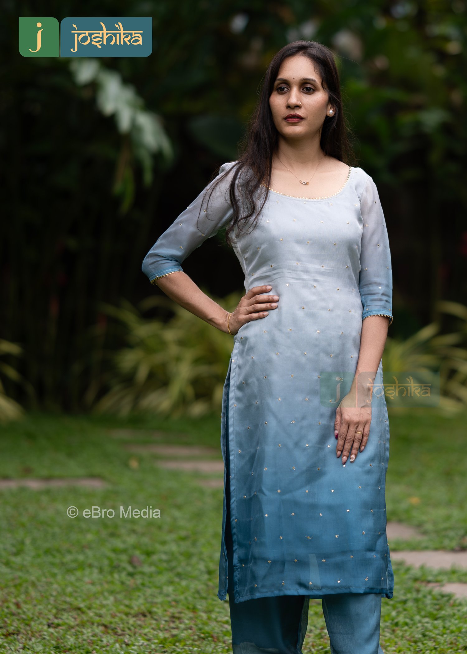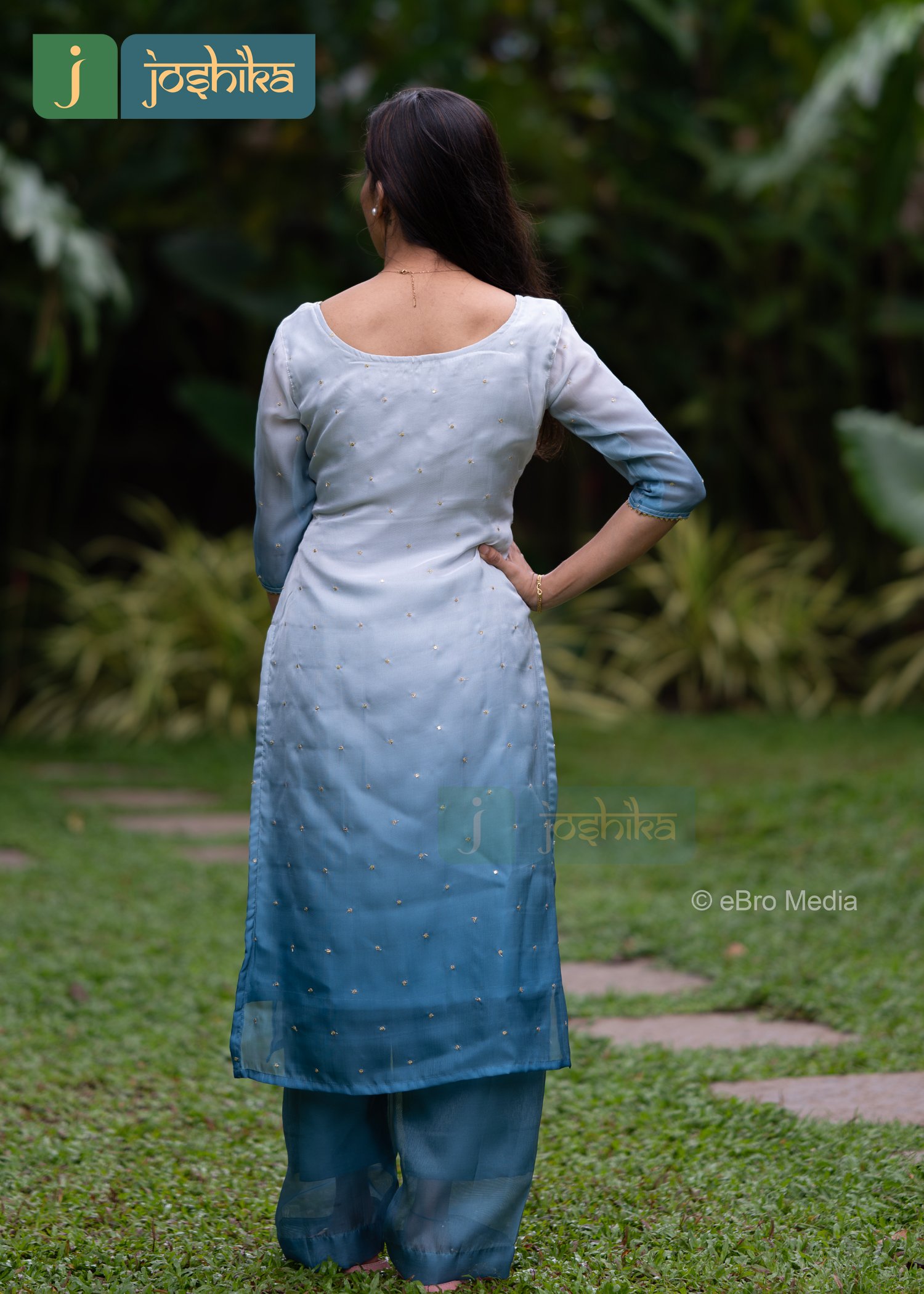 A stylish ombre blue kurta set featuring a kurta with a round neckline and three quarter sleeves. The kurta transitions from light blue at the top to darker blue towards with subtle sequence work embellishments. Paired with matching blue straight cut bottom.
