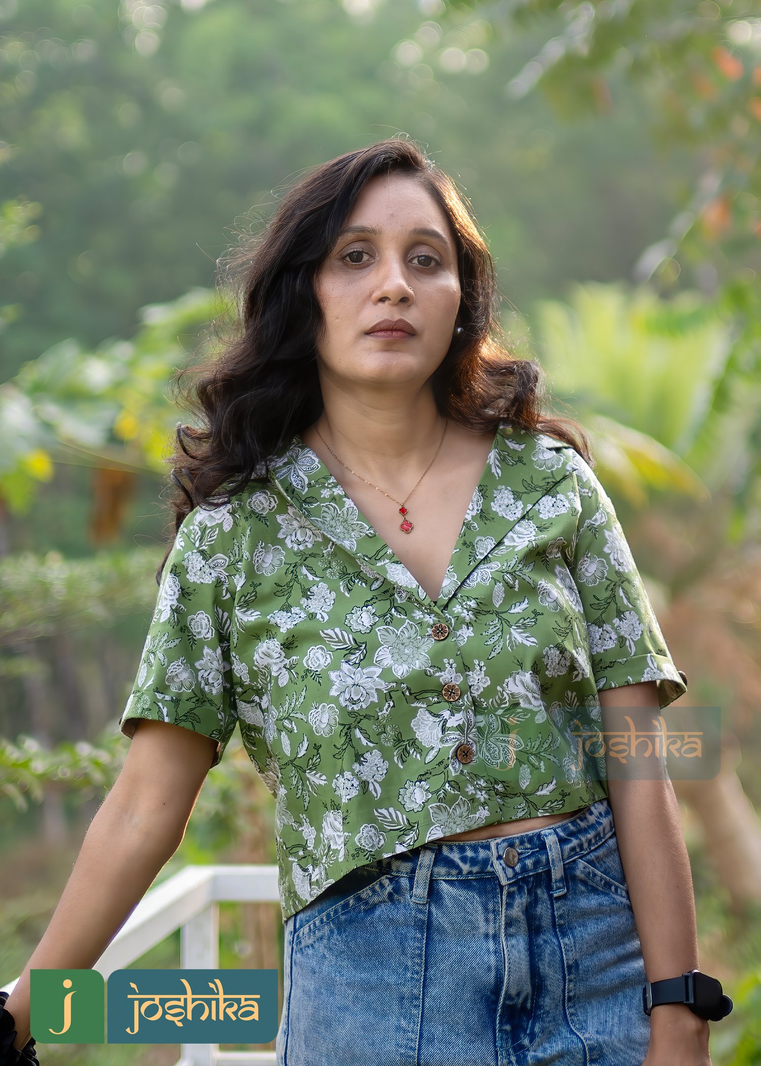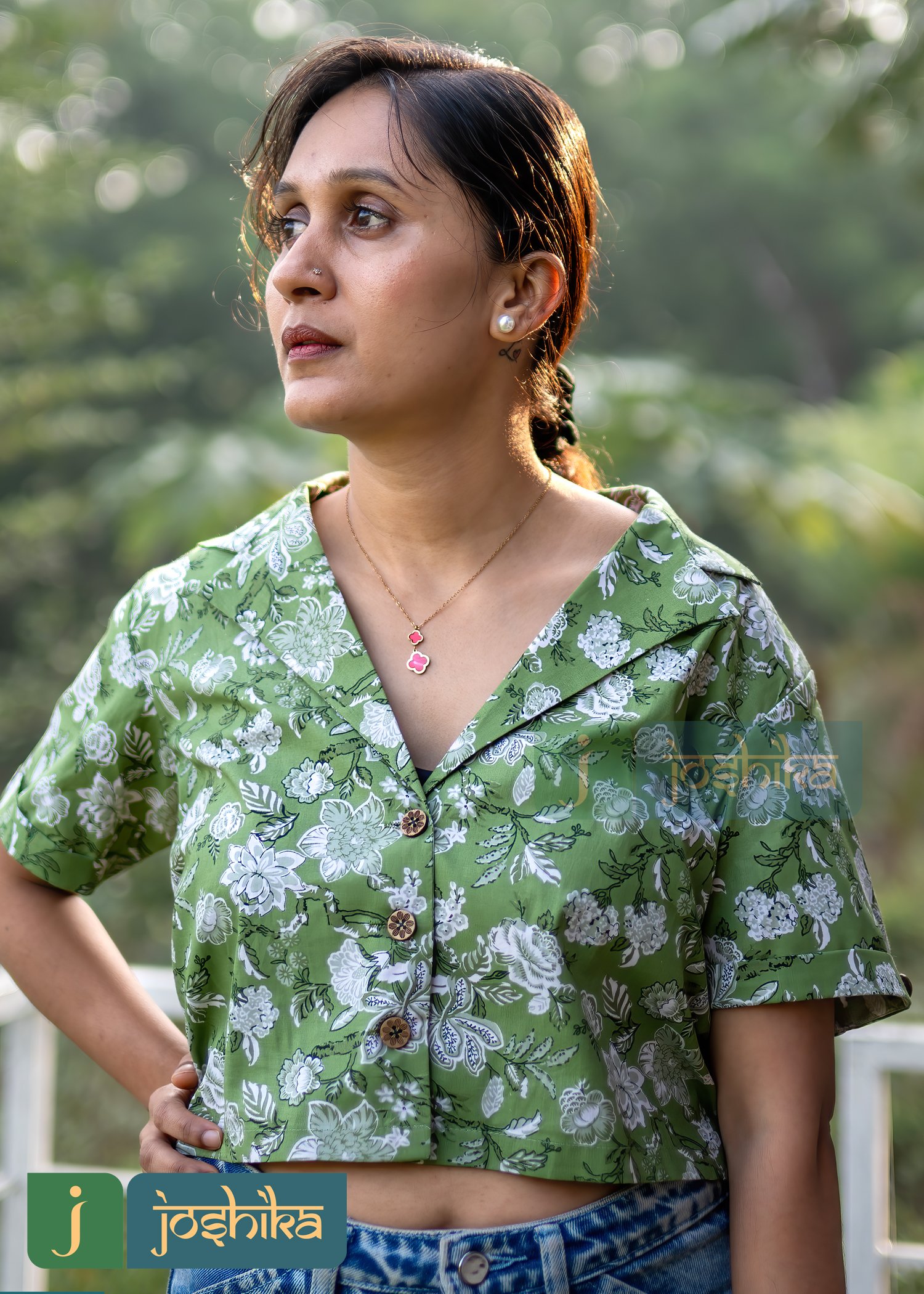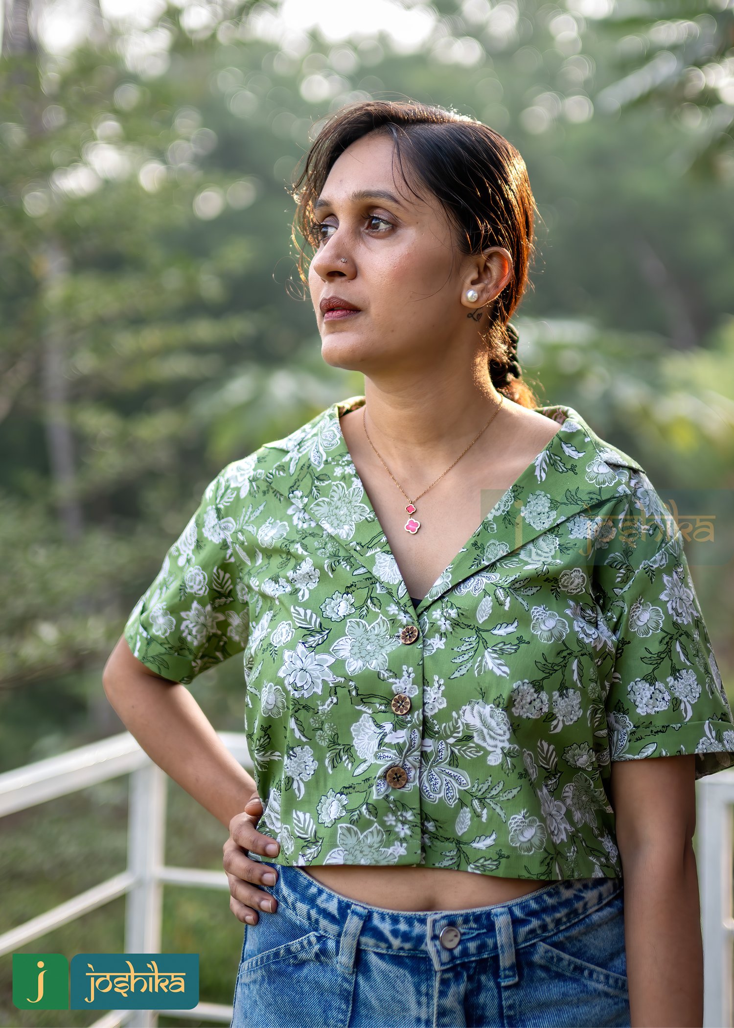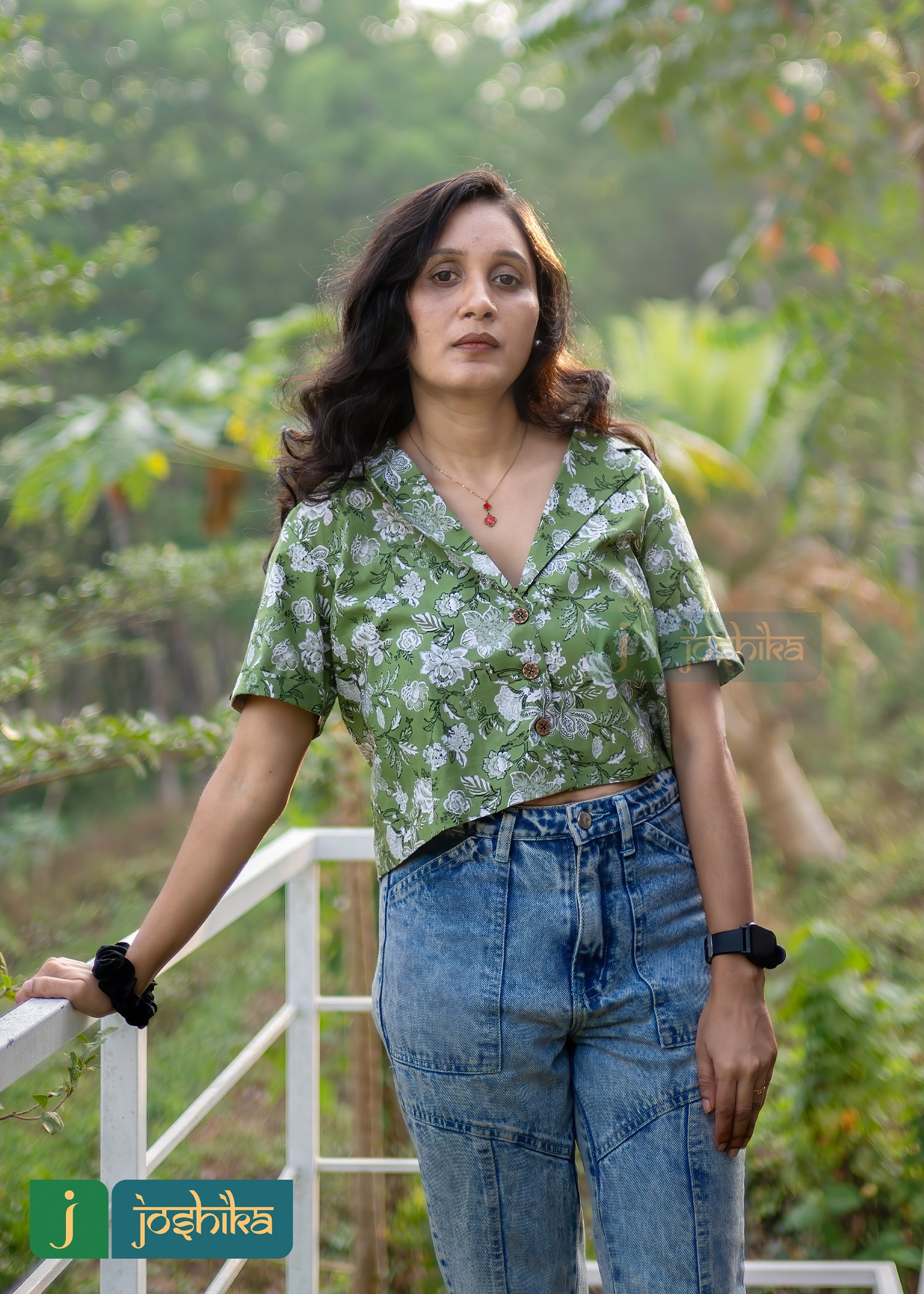 Printed cotton shirt for women ,Trending suit collar, Half sleeves ,Coconut shell buttons, white and green printed combo.