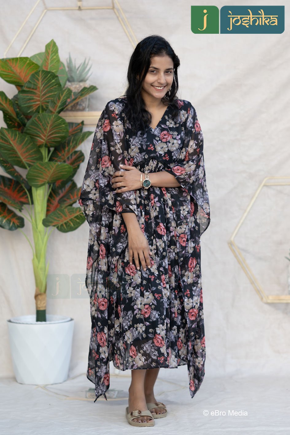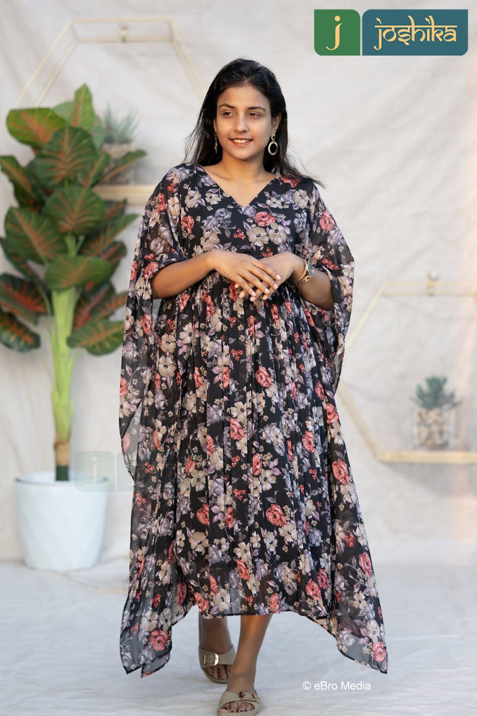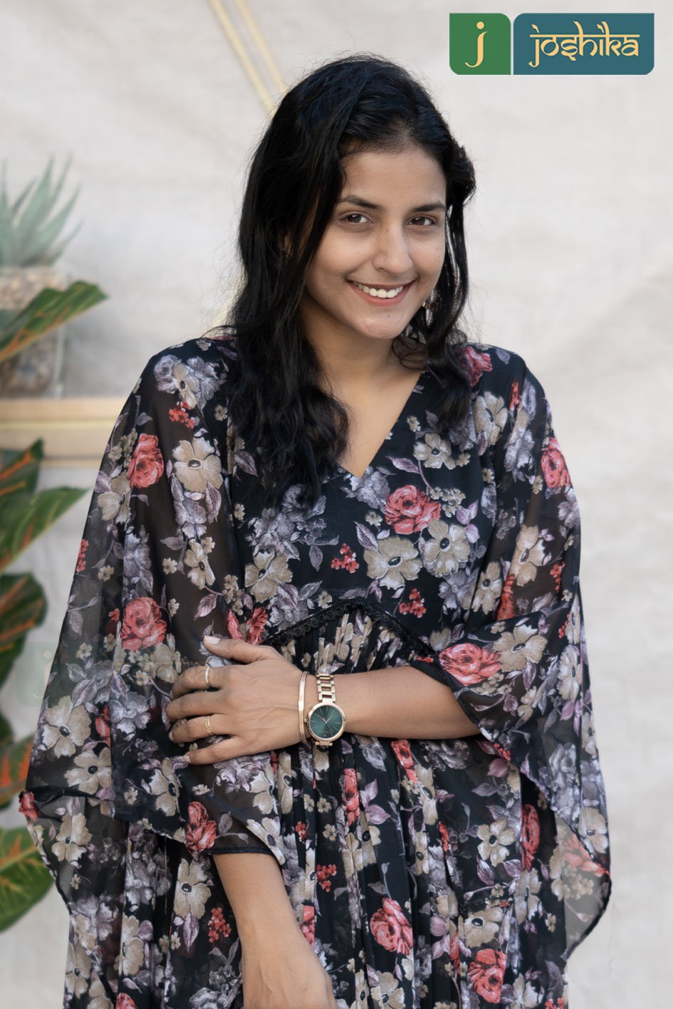 Graceful & effortlessly stylish, this black georgette kaftan features soft pleats that create a beautiful flow & silhouette. Delicate lace detailing adds a refined feminine touch, while the lightweight fabric ensures comfort & elegance. Perfect for casual outings, festive gatherings, or chic everyday wear.