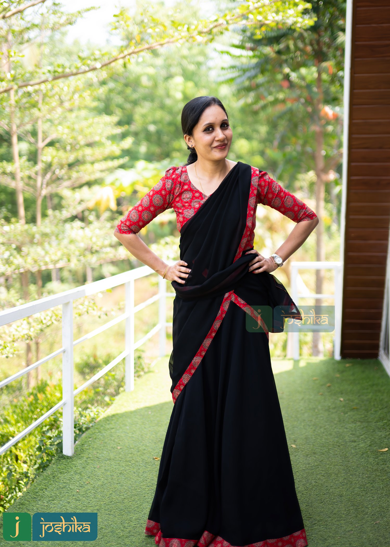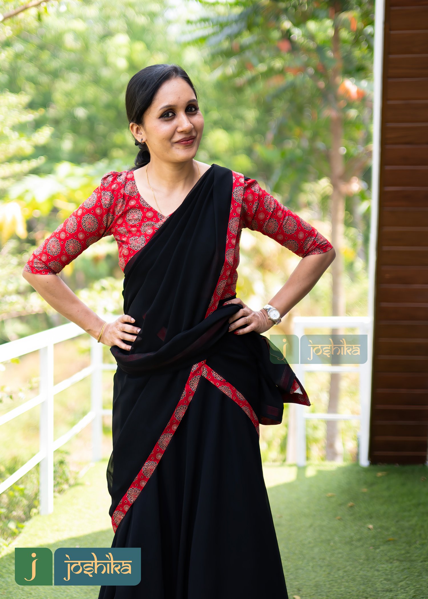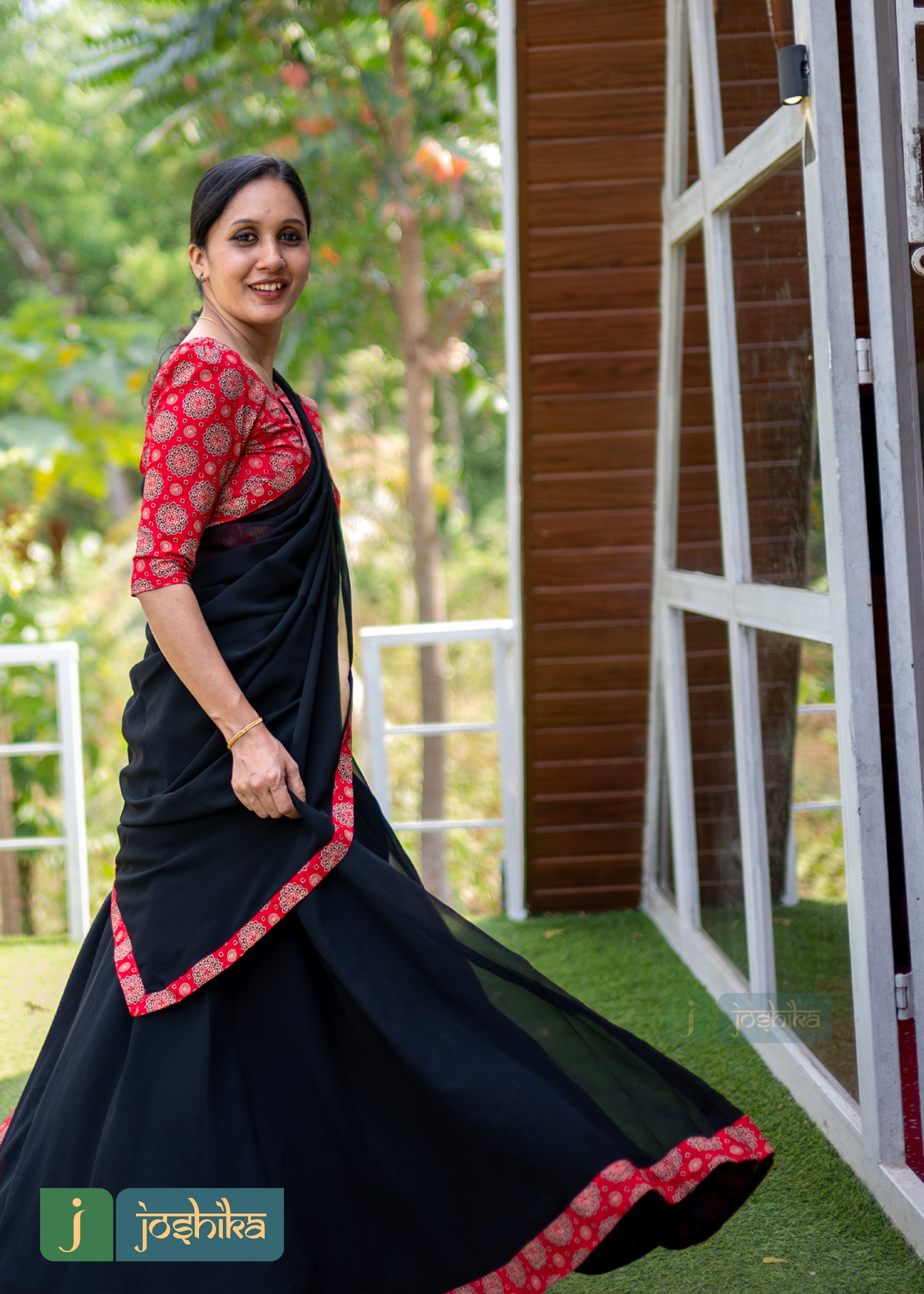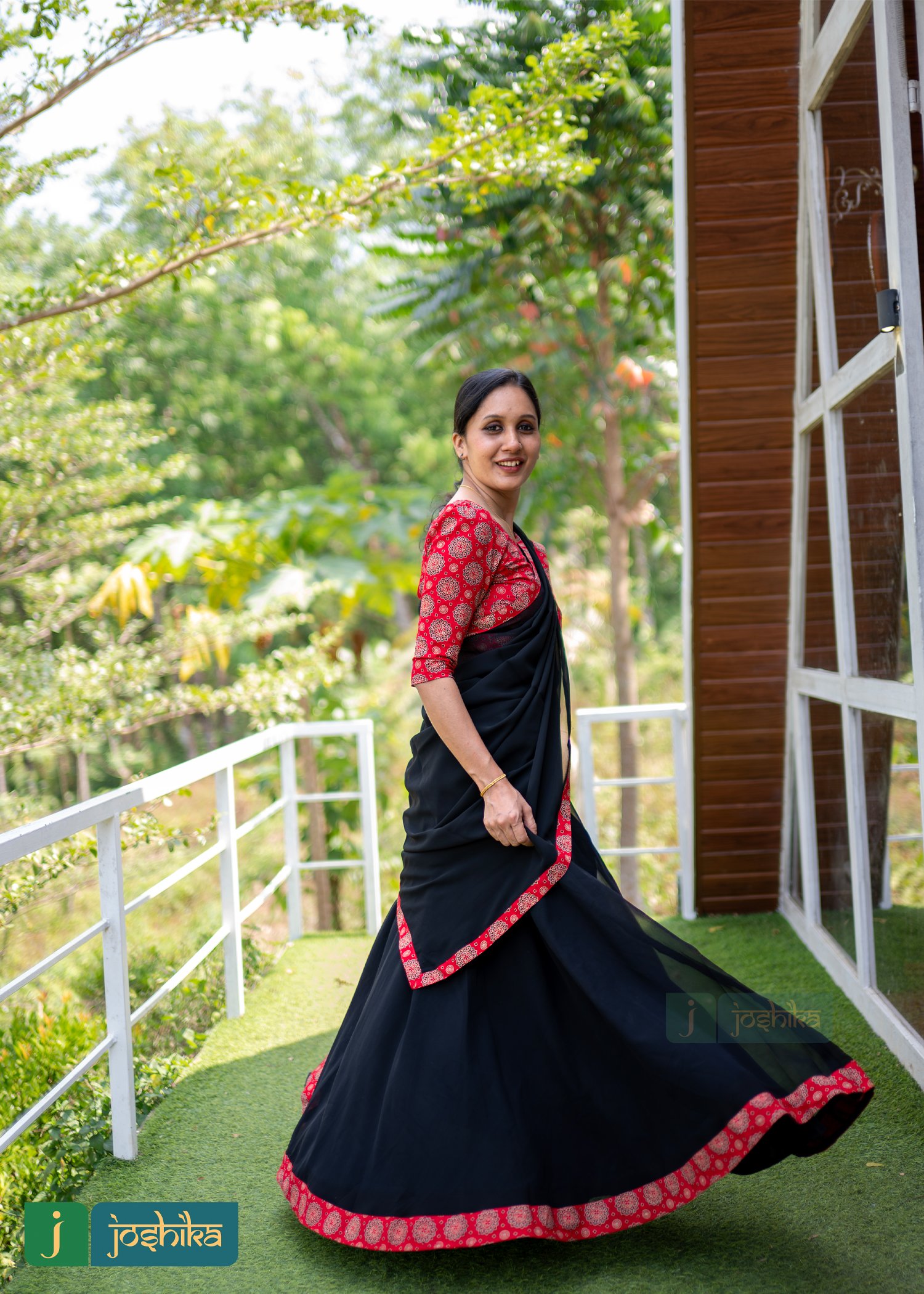 Traditional umbrella Davani set ,ajrakh printed stitched blouse and georgette dupatta with border, Georgette umbrella skirt with ajrakh border.