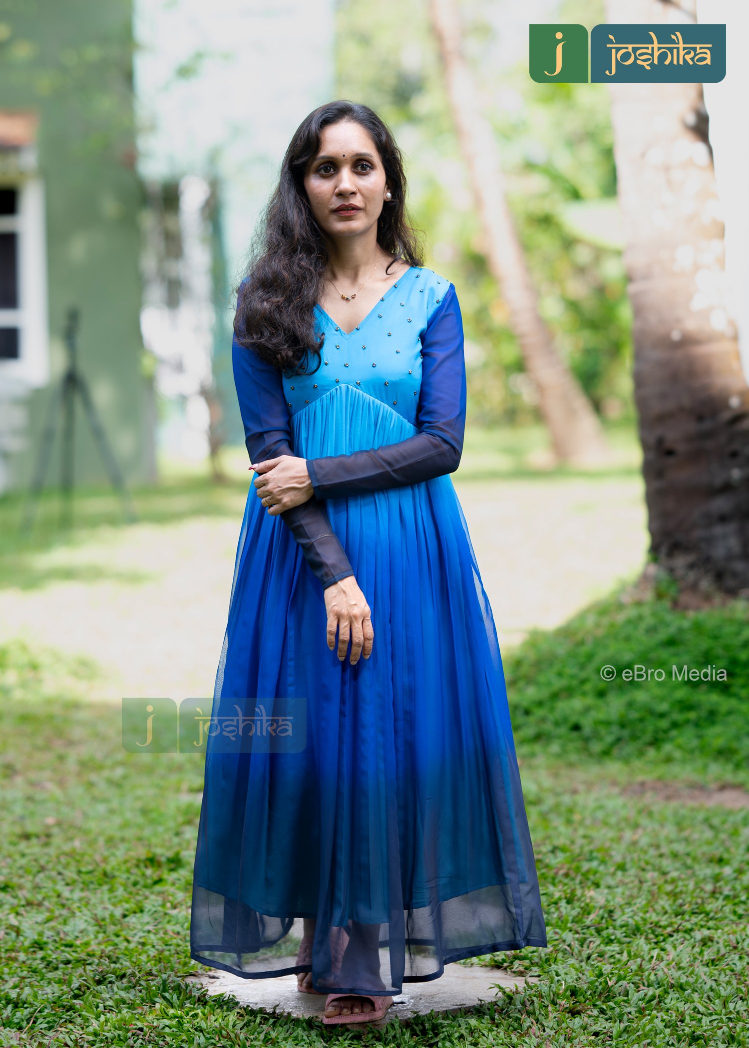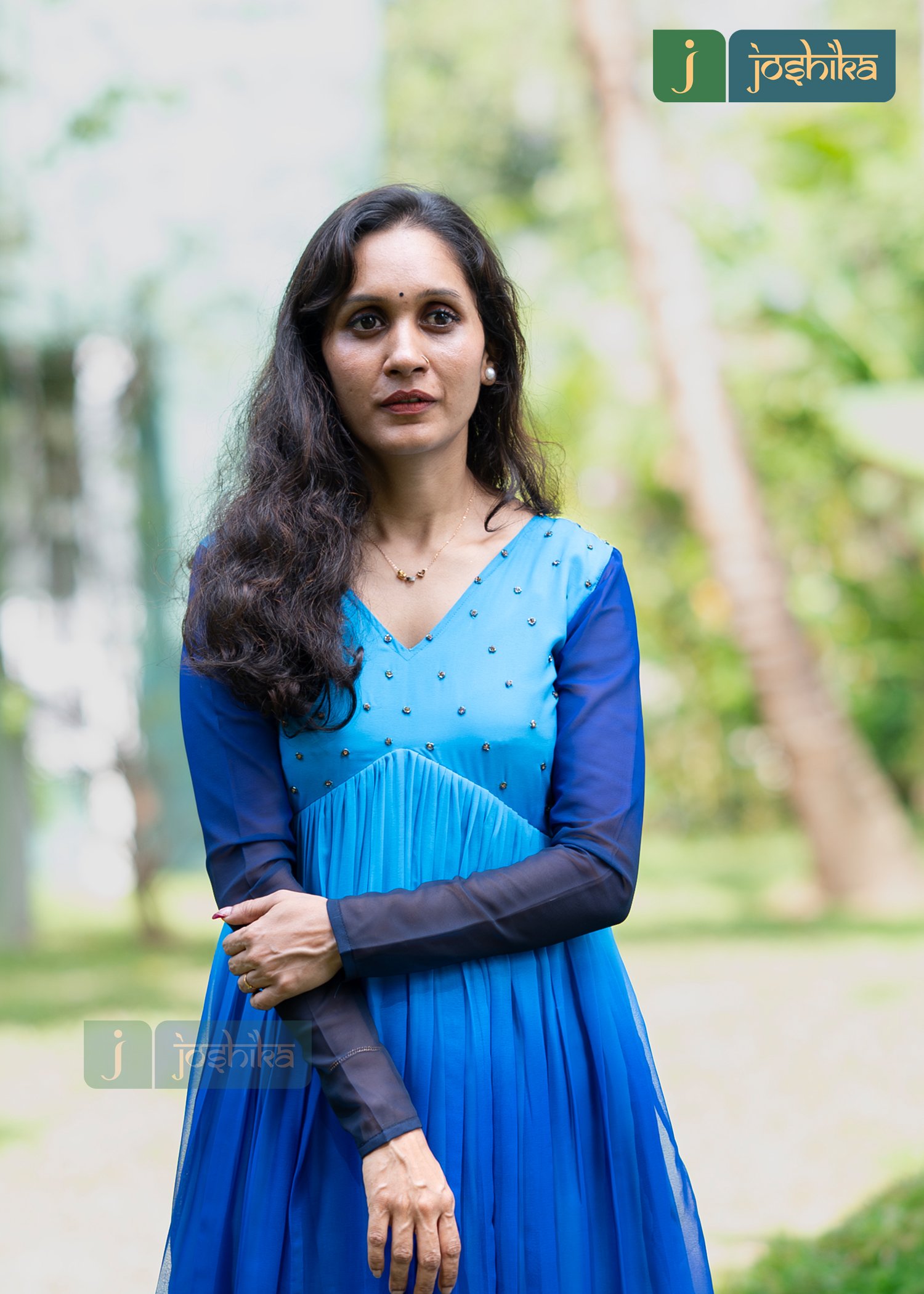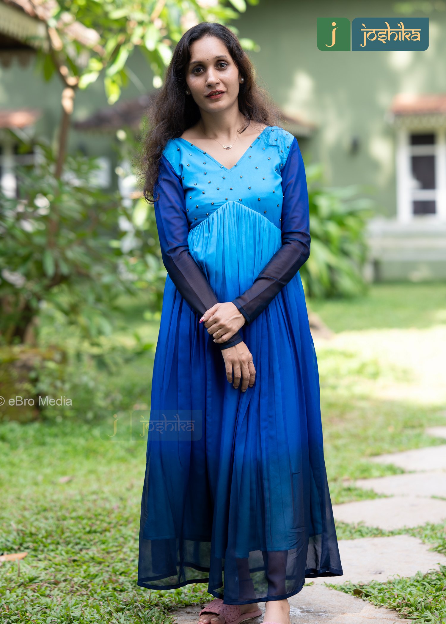 A stunning blue ombre aliya cut kurta with dark blue sleeves and a V- neck adorned with tiny embellishments. Hand embroidered work in yoke with multicolor cut beads, The kurta has a flowy design, The blue ombre effect gives the kurta a unique and stylish look.