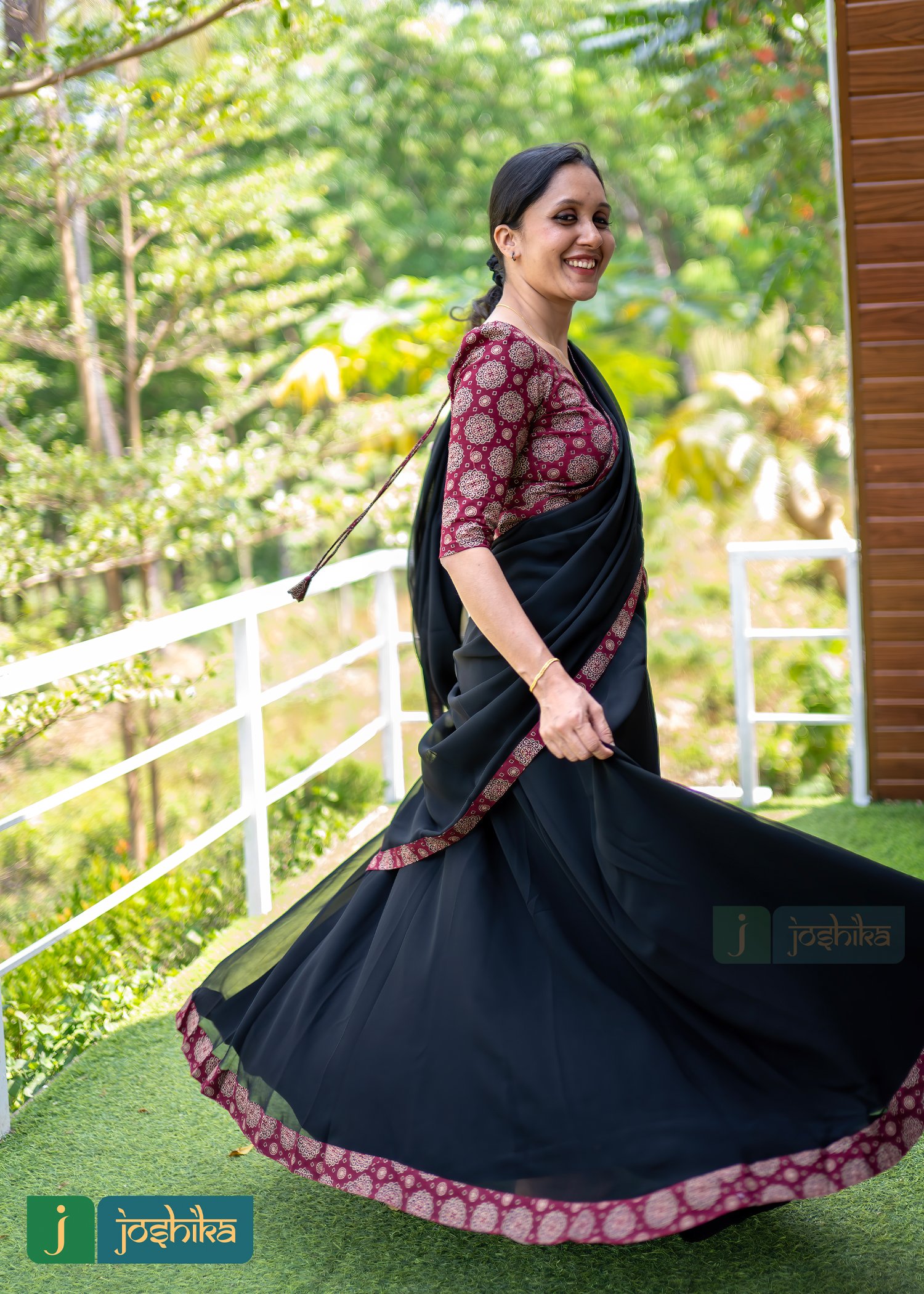 Georgette umbrella skirt ,dupatta with ajrakh border and ajrakh blouse with puff sleeves.
