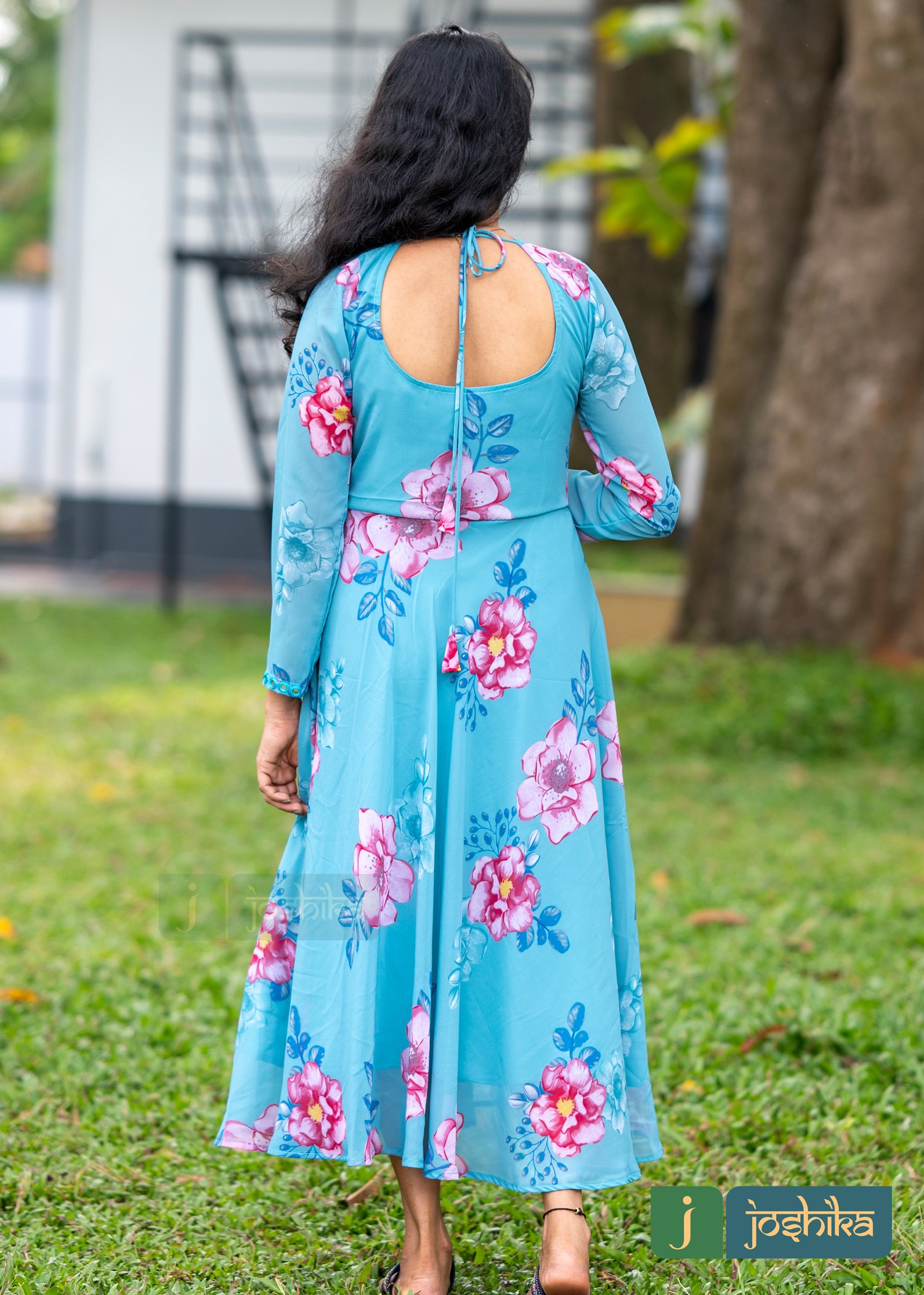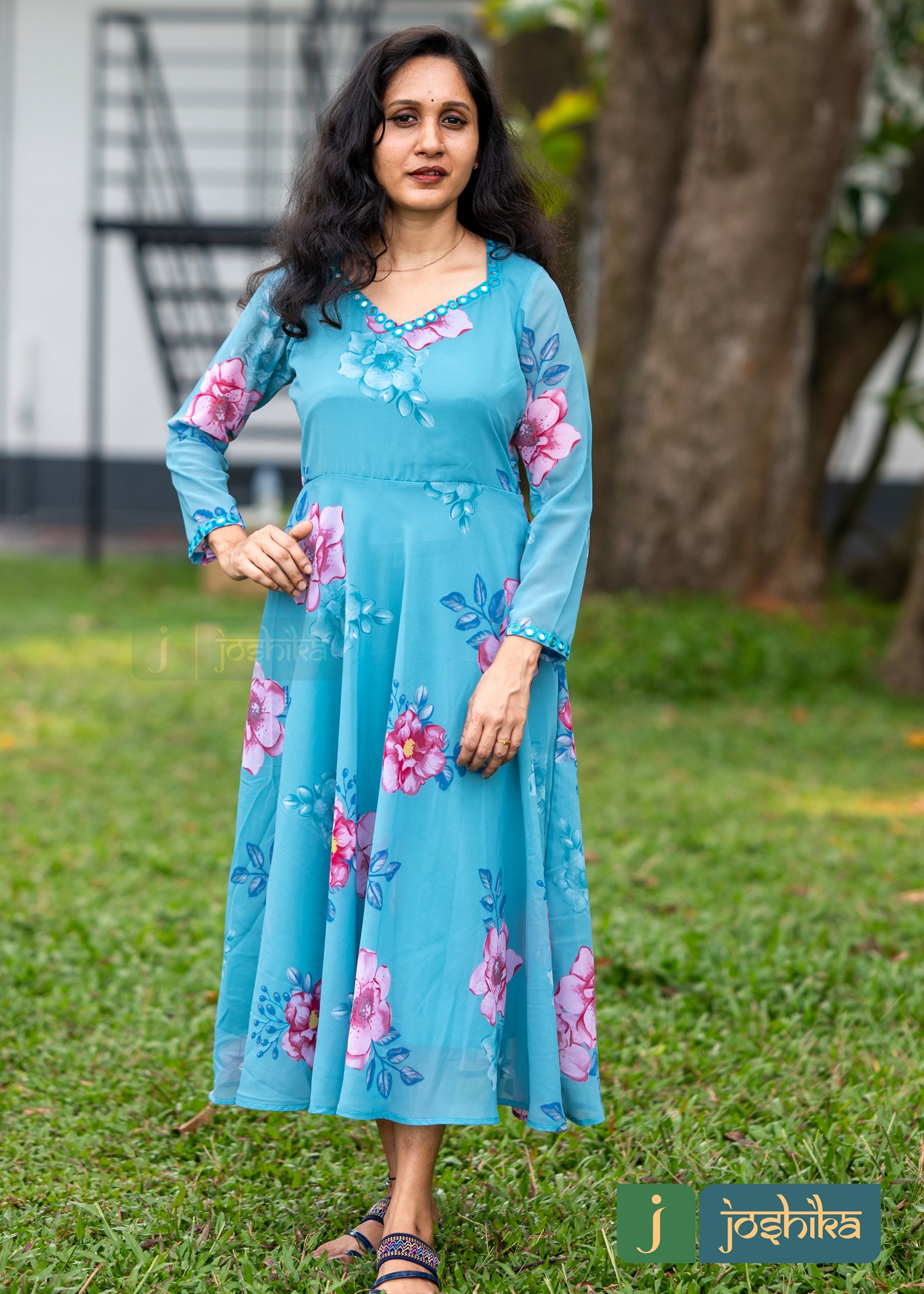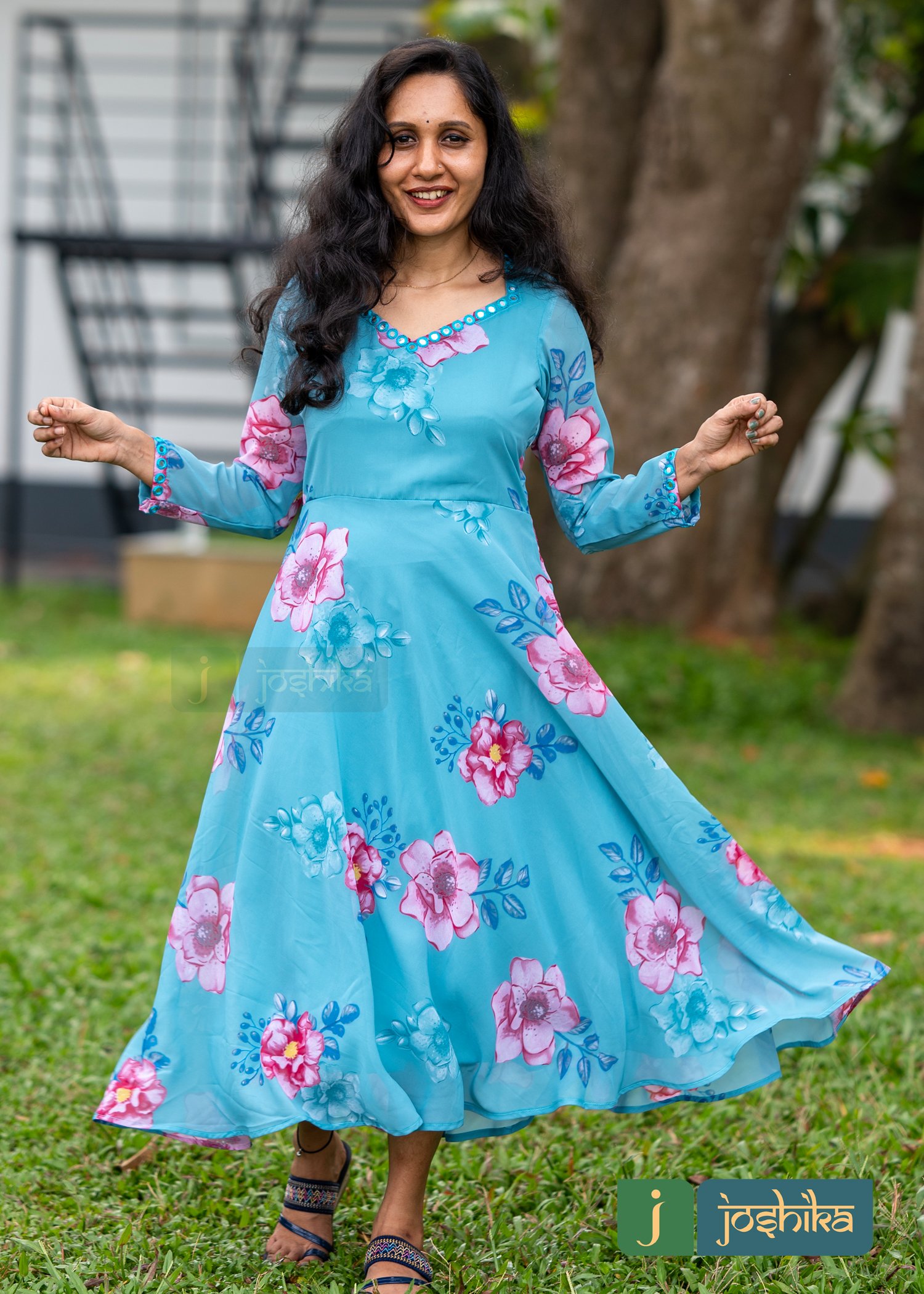 Umbrella kurta with mirror work in neck and sleeves, printed georgette material ,full sleeves.